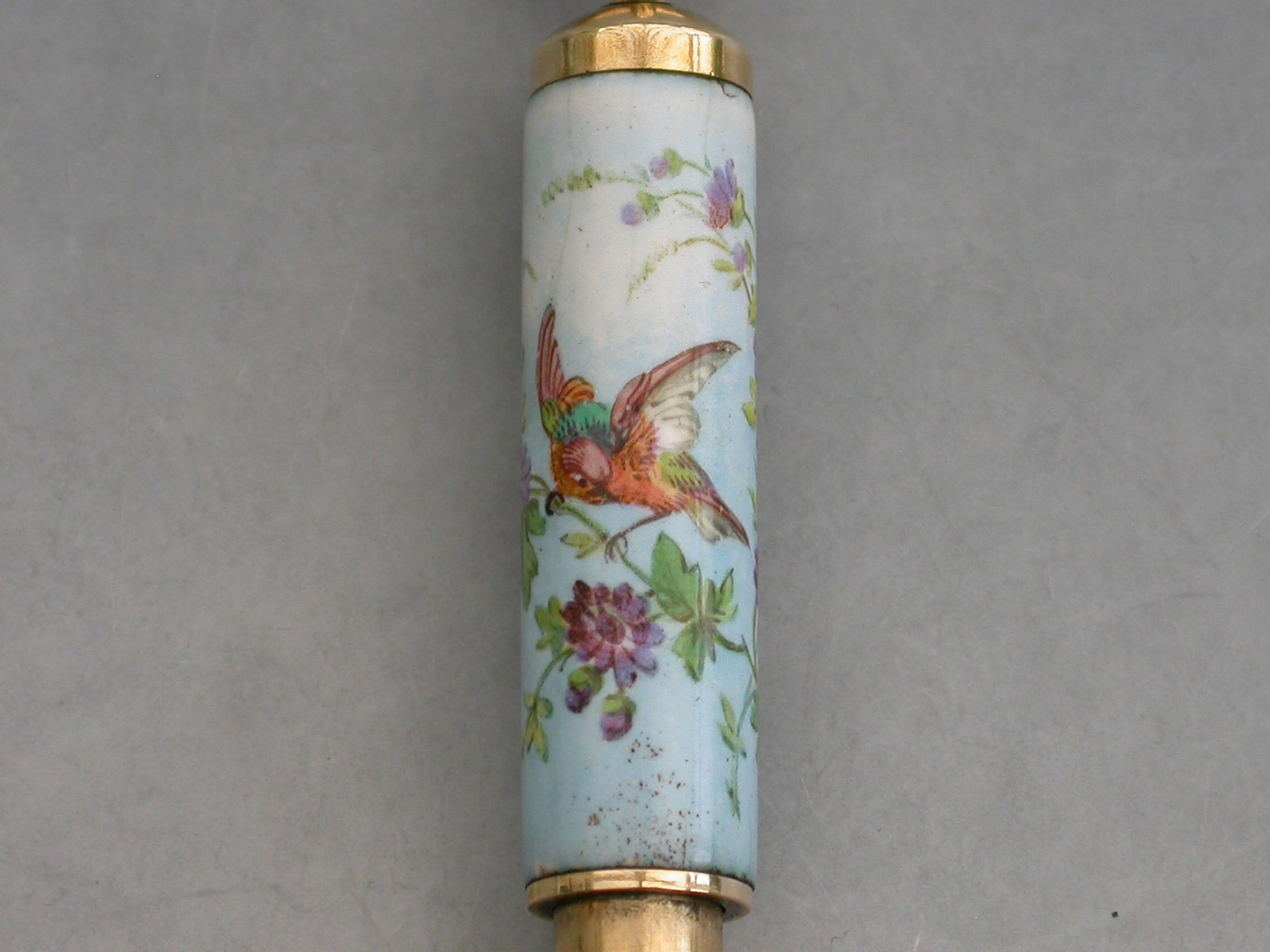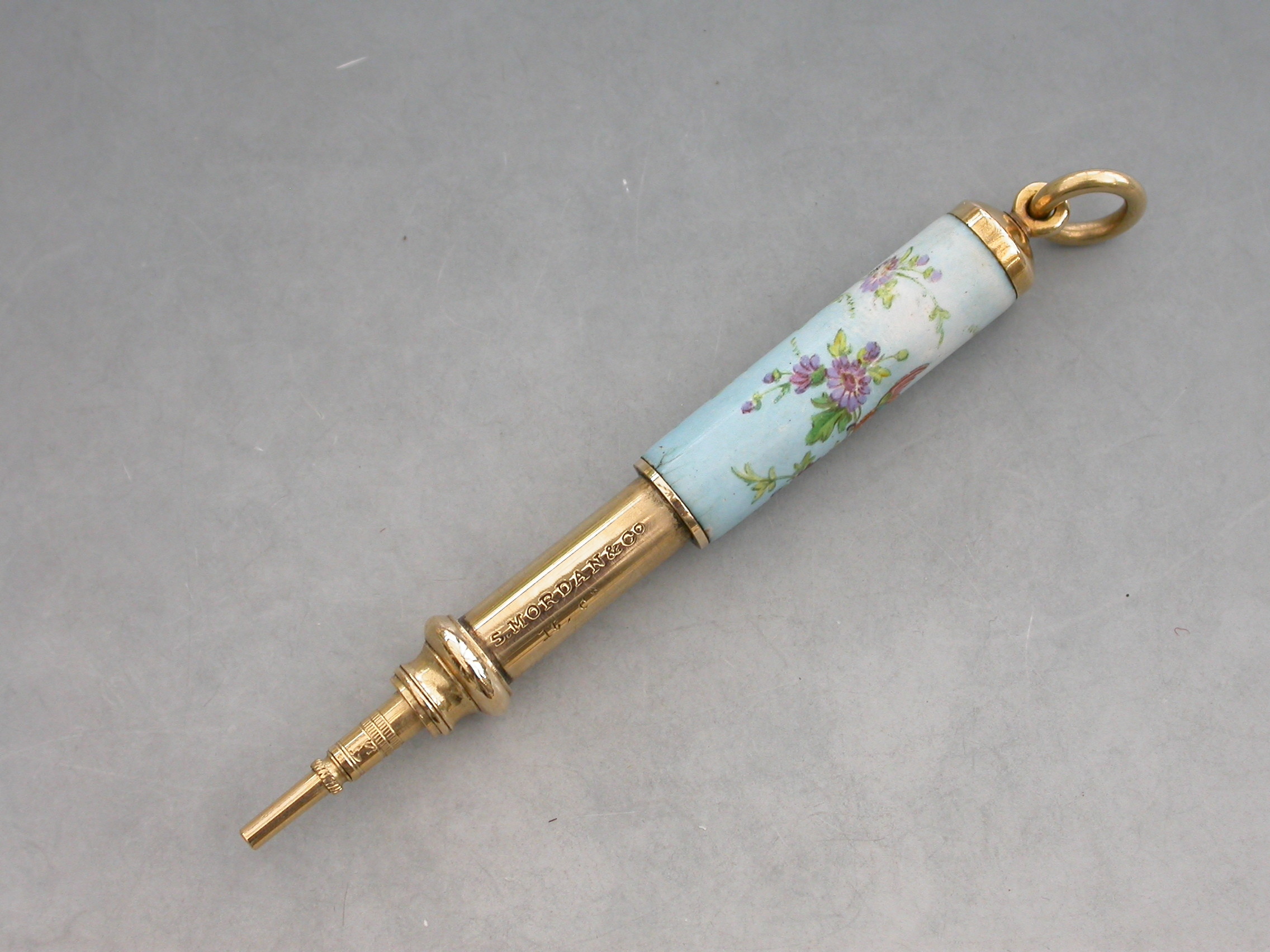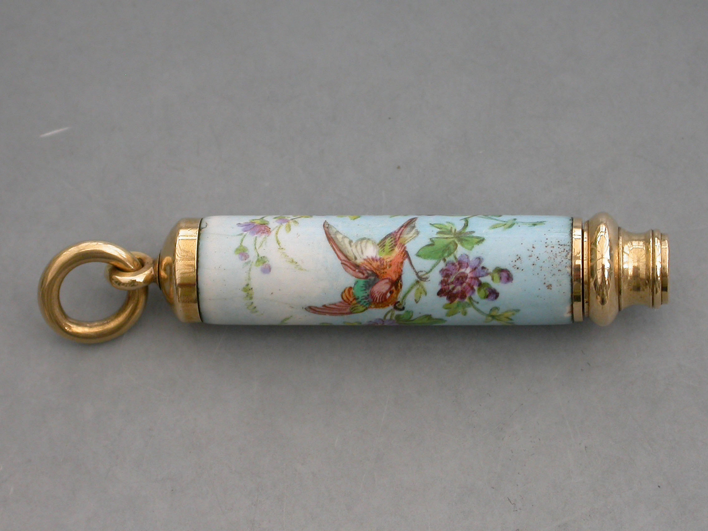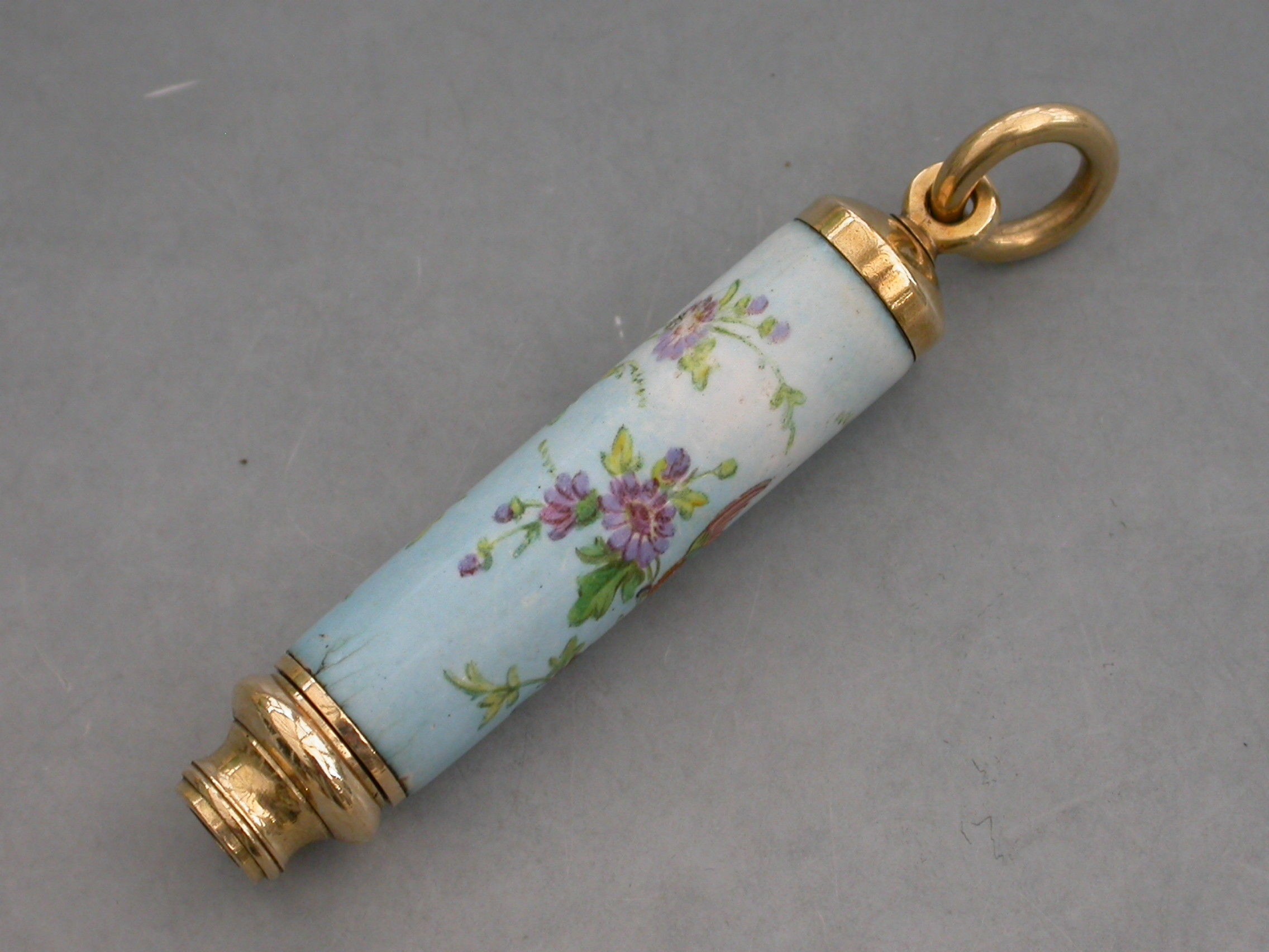A rare Victorian 16 carat gold and enamel telescopic Propelling Pencil with attached suspension ring. The body with sky blue enamelled case decorated with finches and flowers.