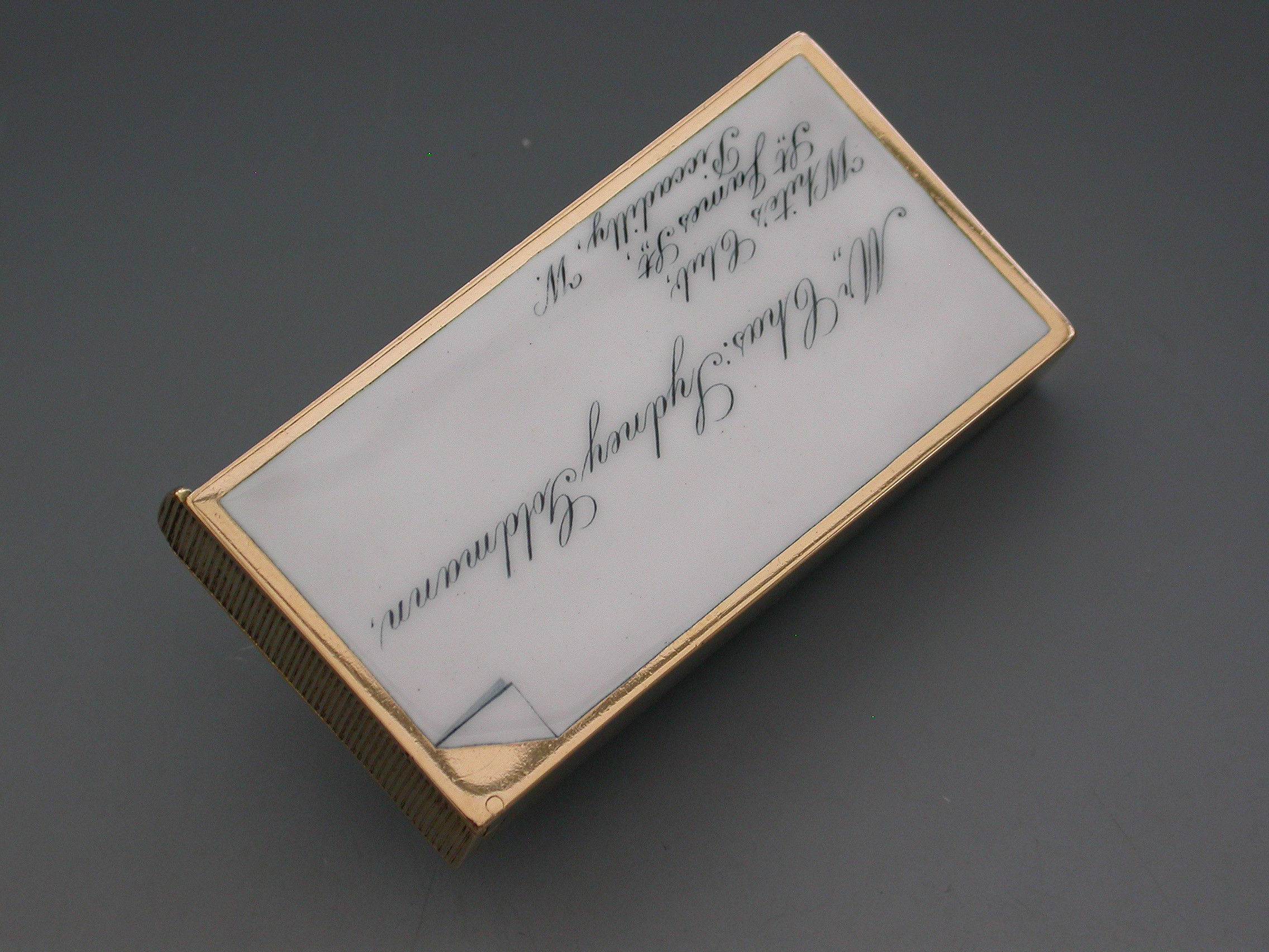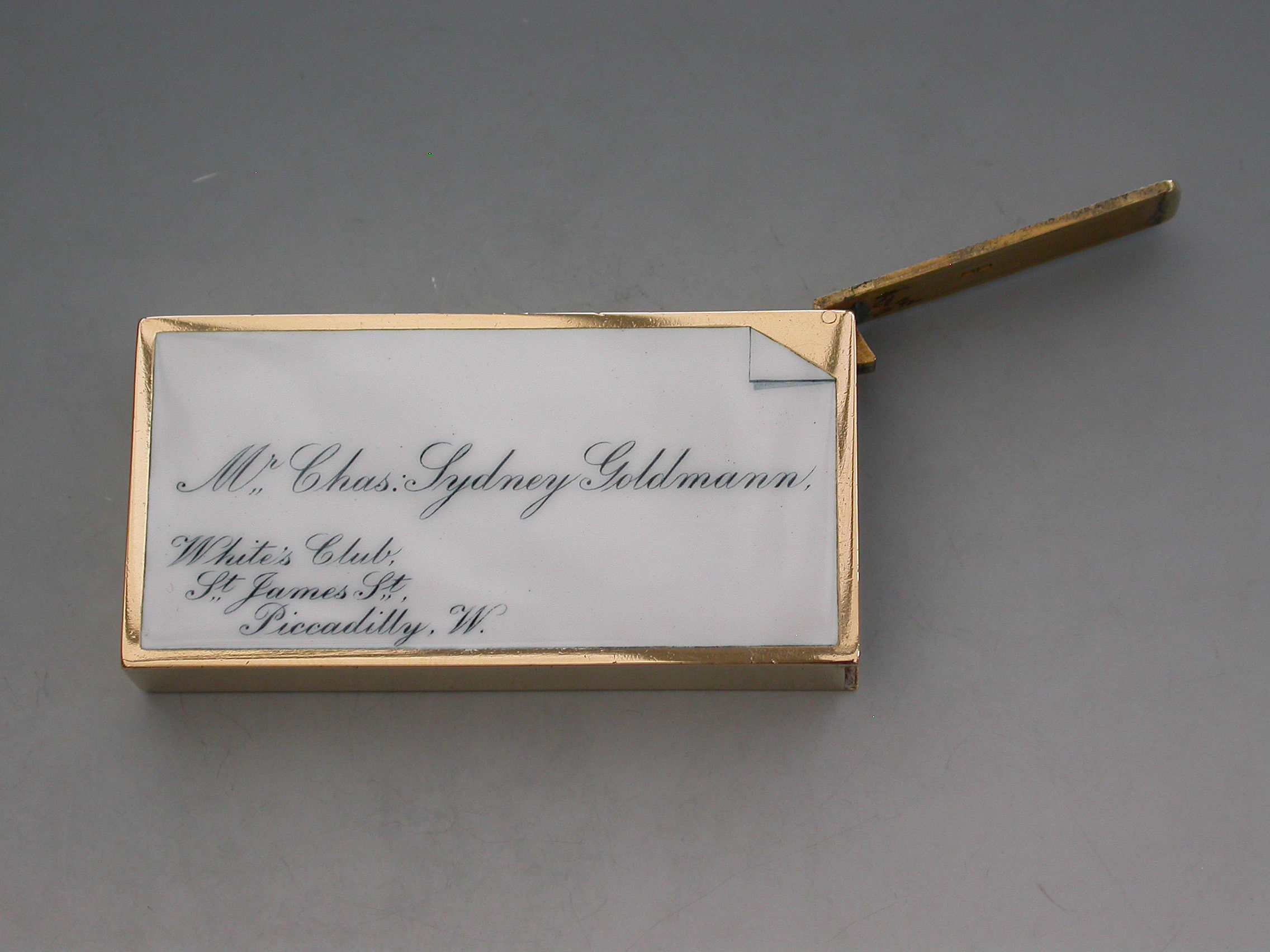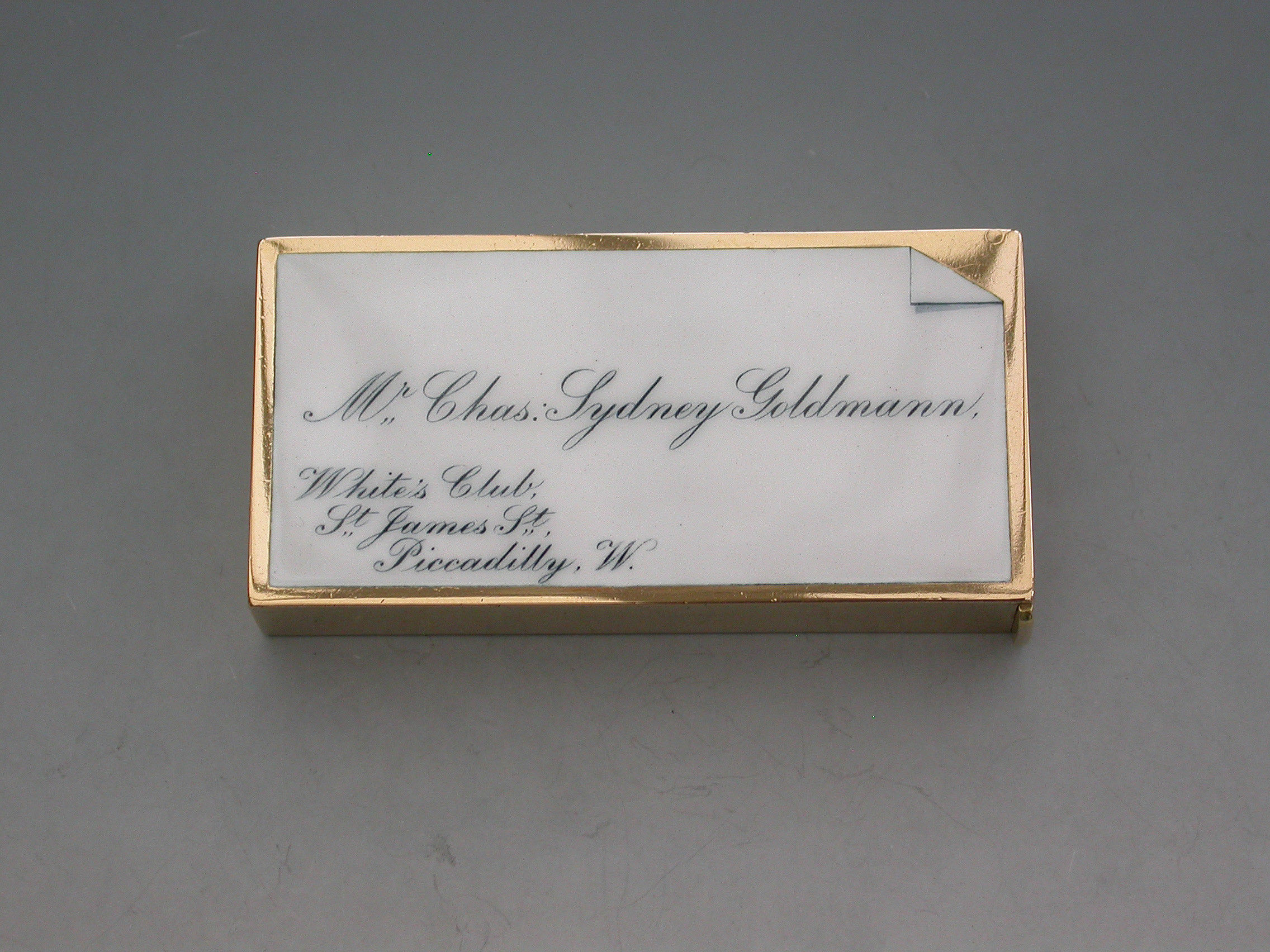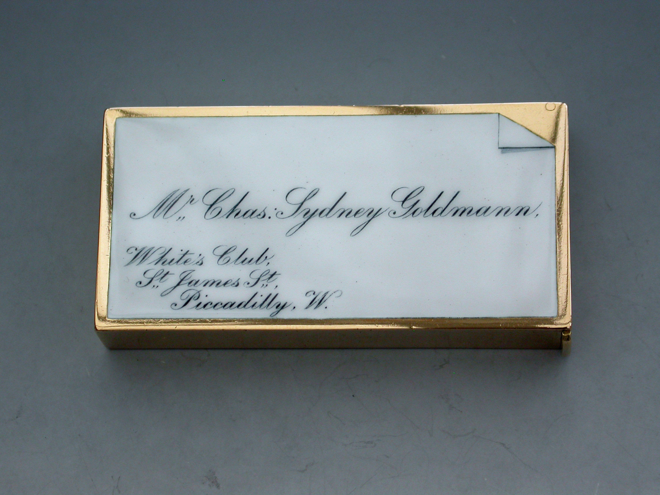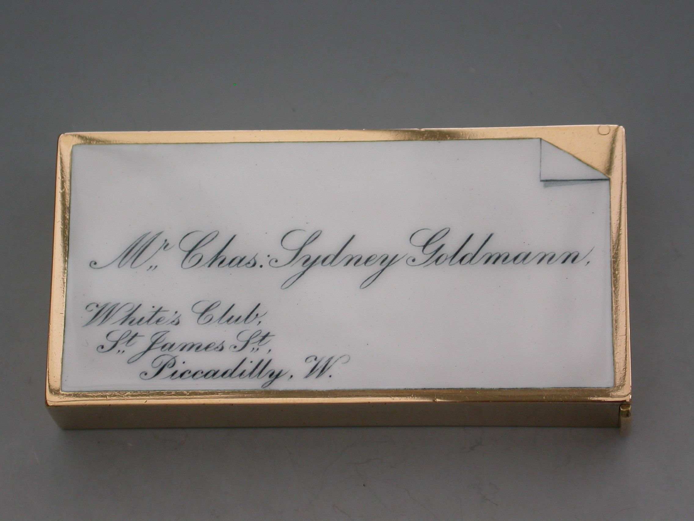 A very fine quality Victorian 18 carat gold and enamel Vesta Case of rectangular form with flat hinged flip-top lid forming the striker, he face with monochrome enamel panel in the form of a ""Calling Card"" for Mr Charles Sydney Goldmann, White's Club, St James's St, Piccadilly, W.