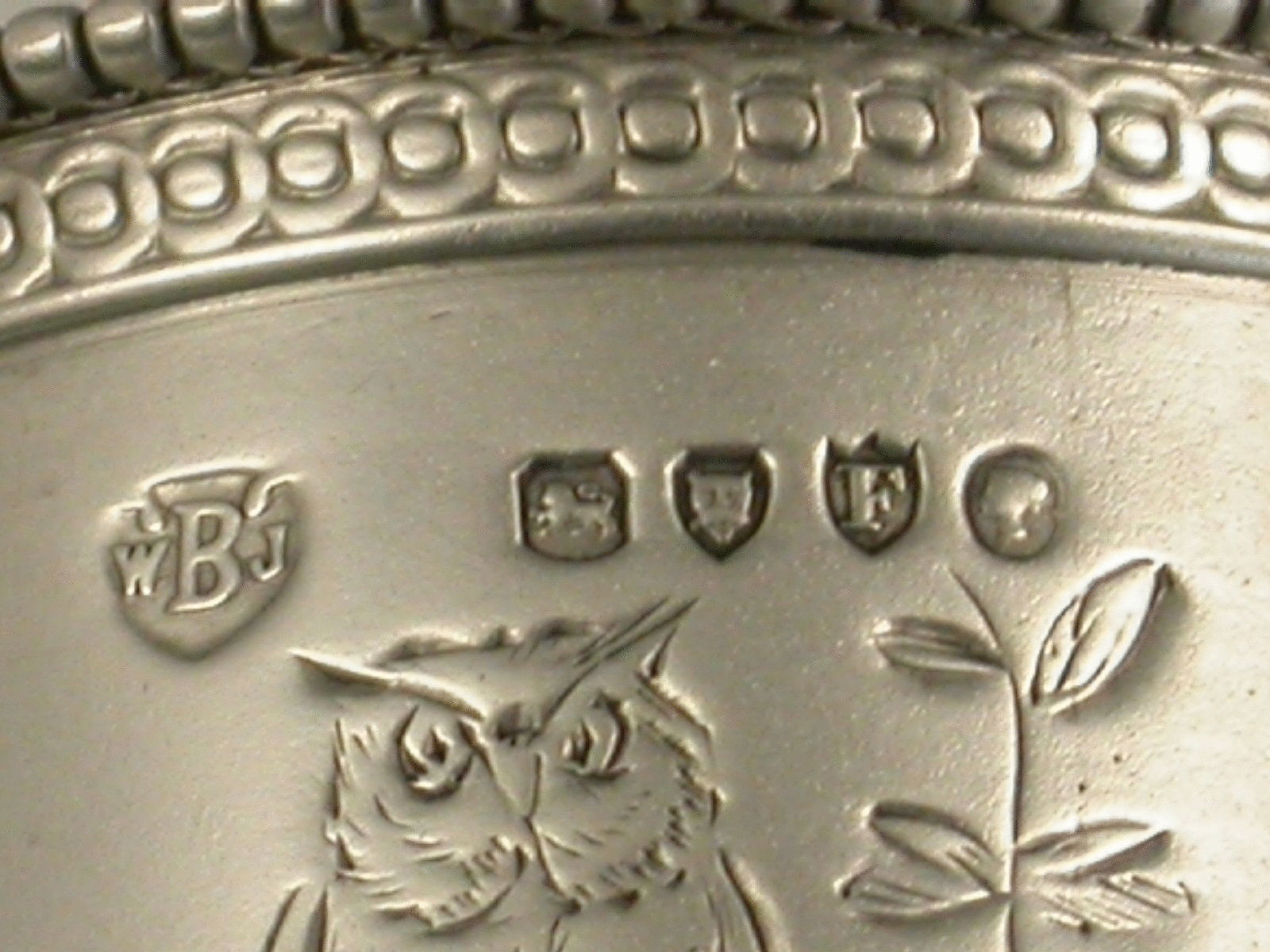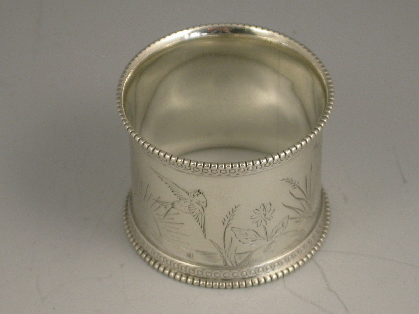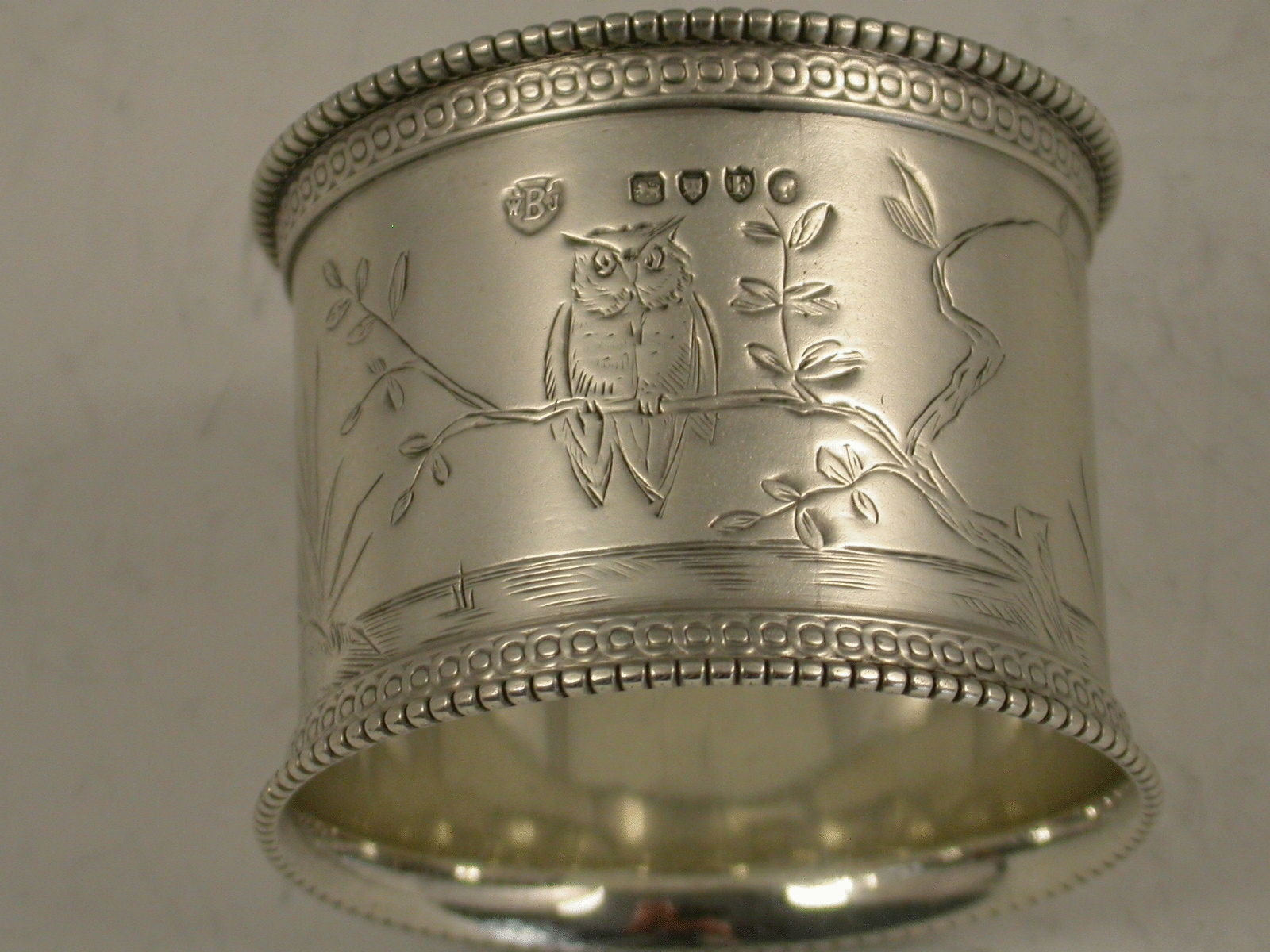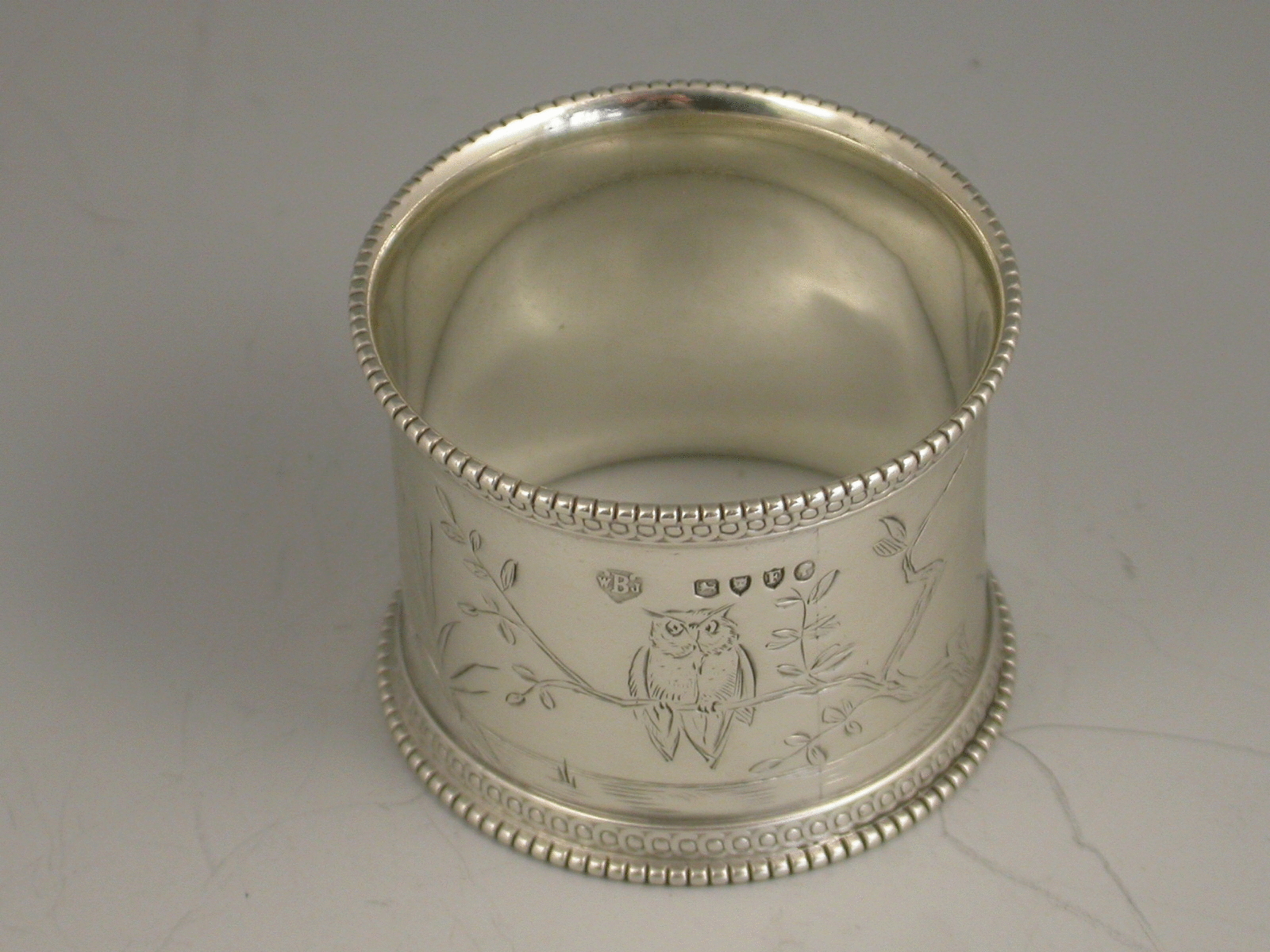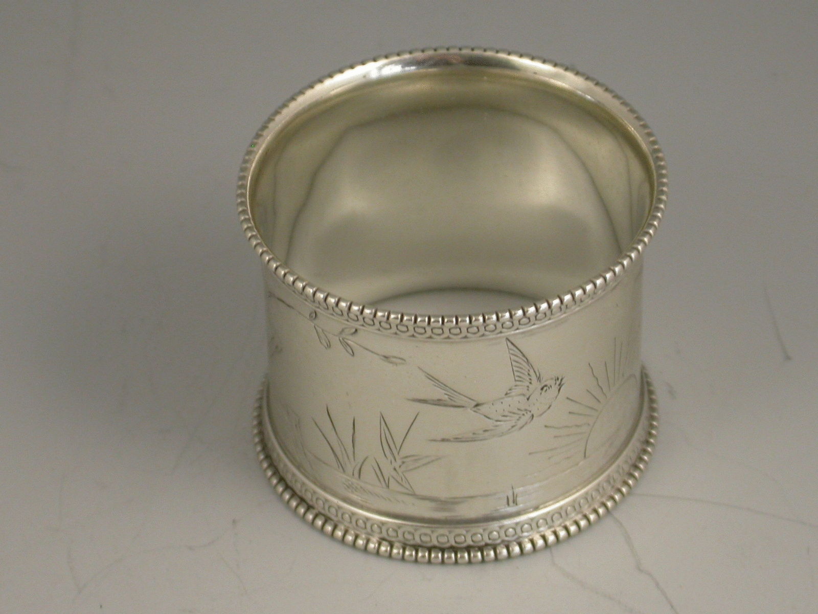 A fine Victorian silver Napkin Ring engraved in the Aesthetic style with a rising sun, flowering plants, a pair of swallows and an owl, with beeded rims.