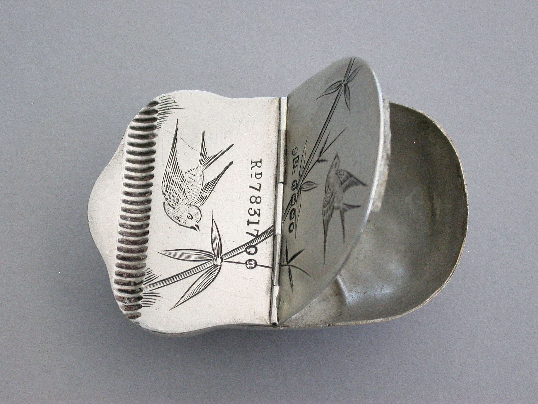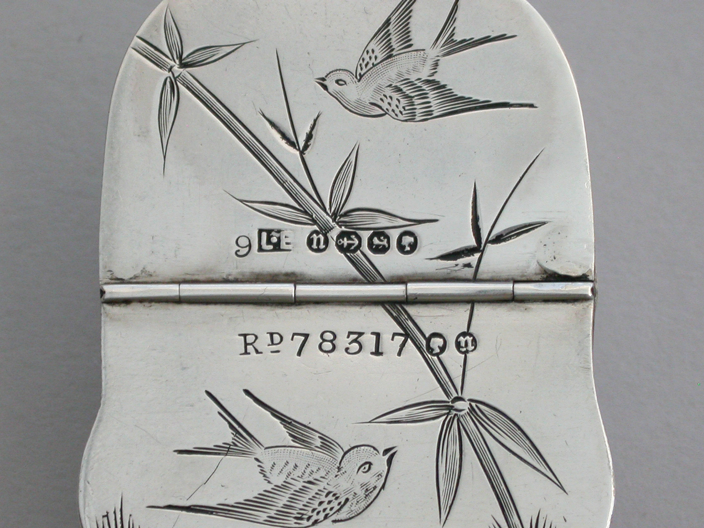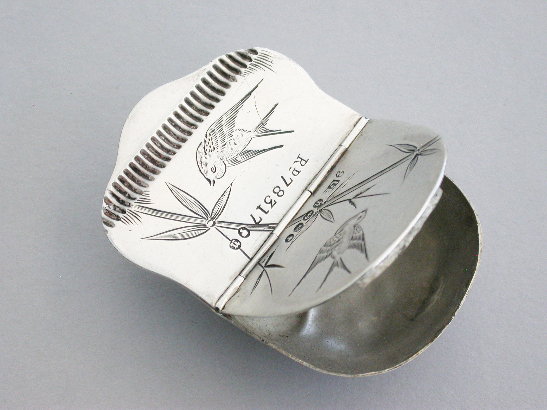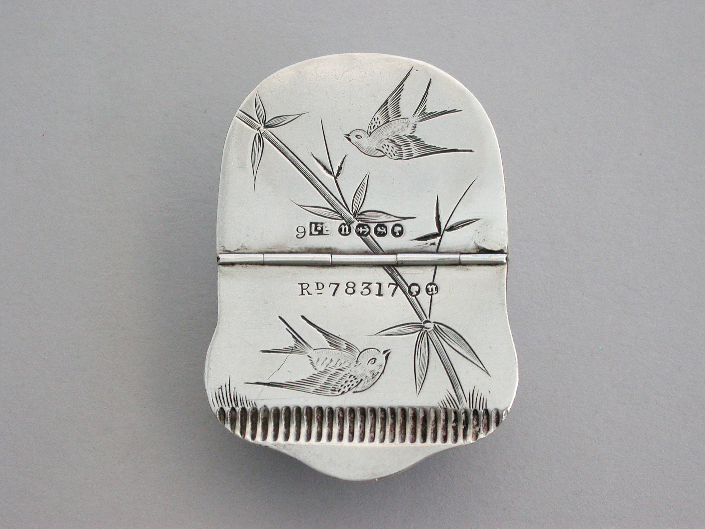 A rare Victorian figural silver Vesta Case made in the form of a Japanese Noh Mask, the reverse decorated in the aesthetic style with birds and foliage, flat hinged lid.