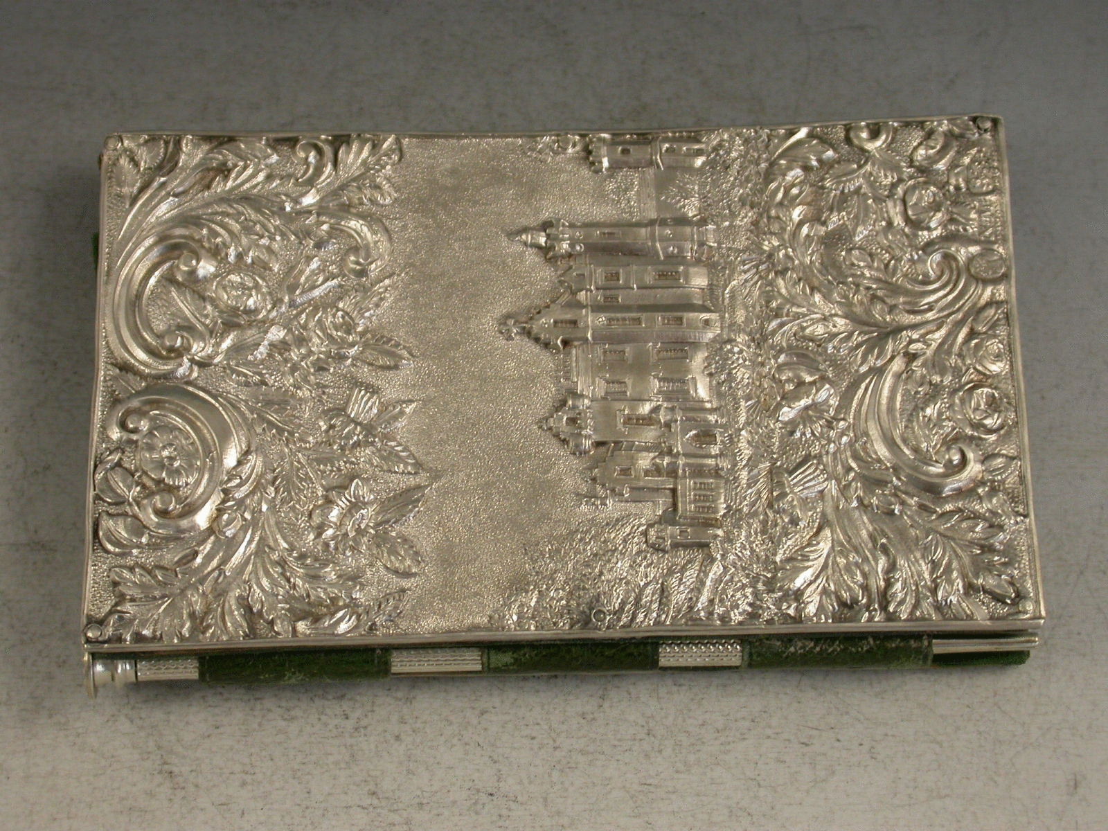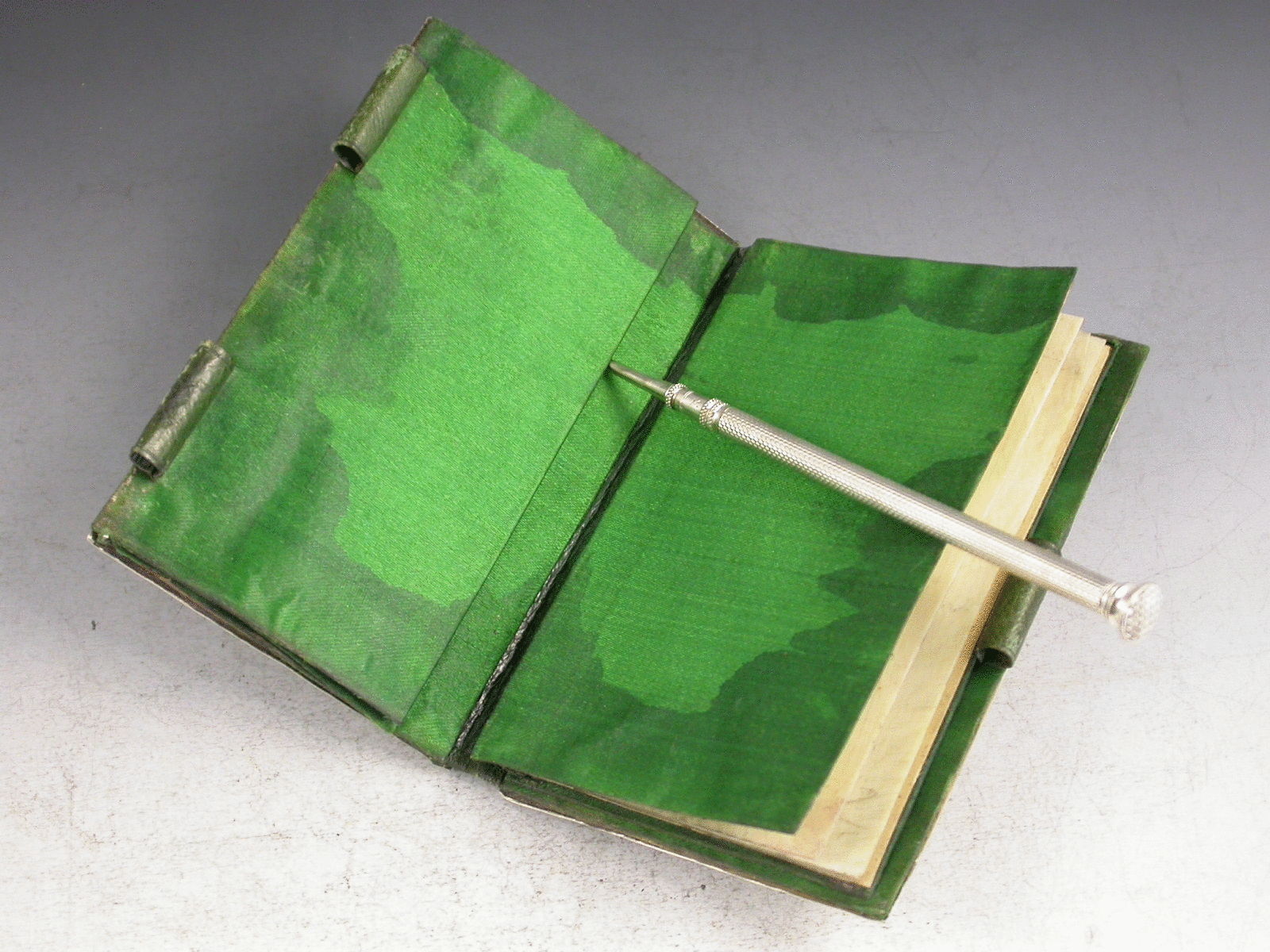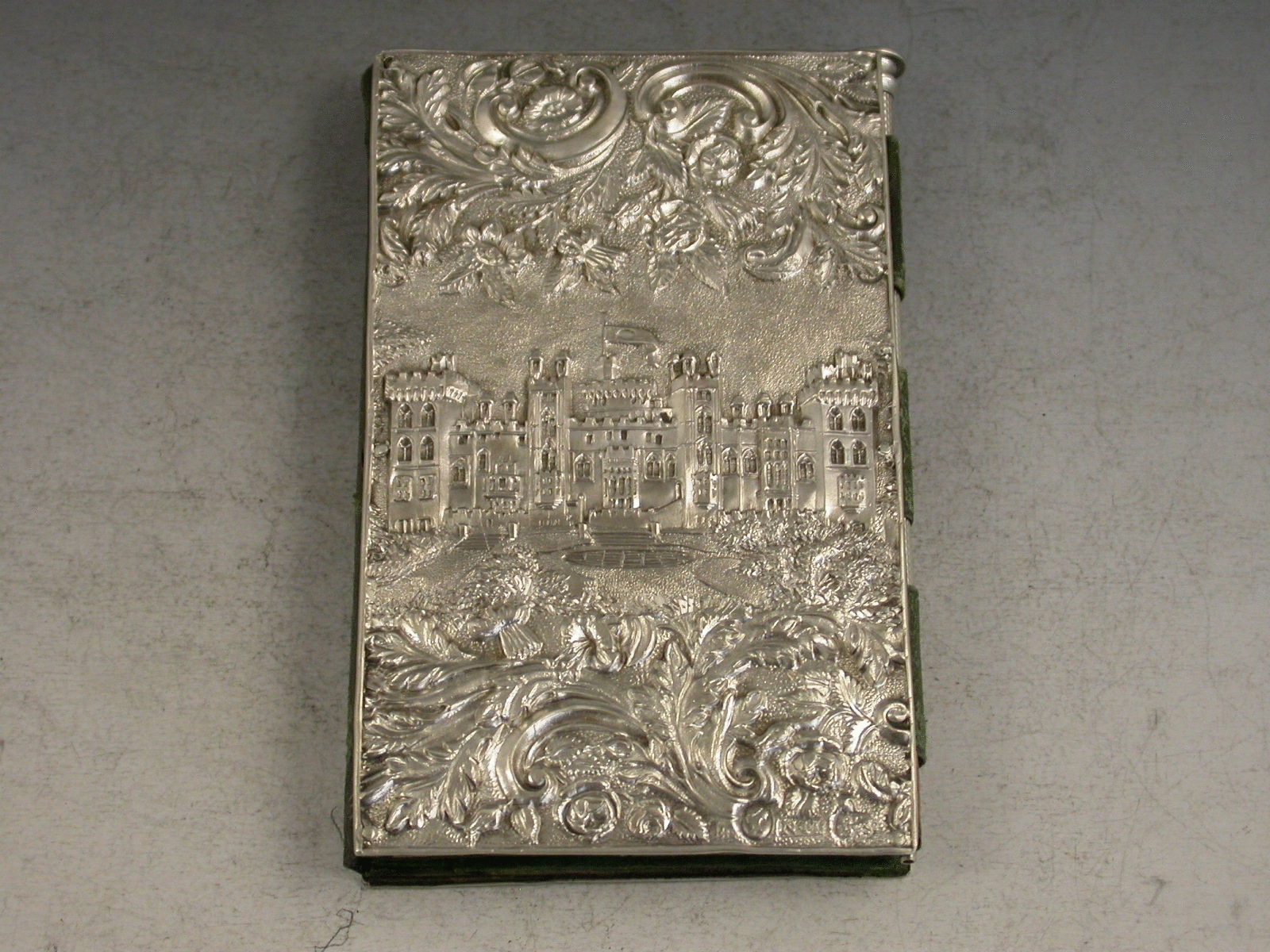 A fine Victorian silver Aide Memoire, the two silver covers embossed and chased with views of Windsor Castle and Abbotsford House amongst foliate scroll work, the green leather and silk lined interior complete with ivory pages named with the days of the week, the whole held together with a silver propelling pencil.