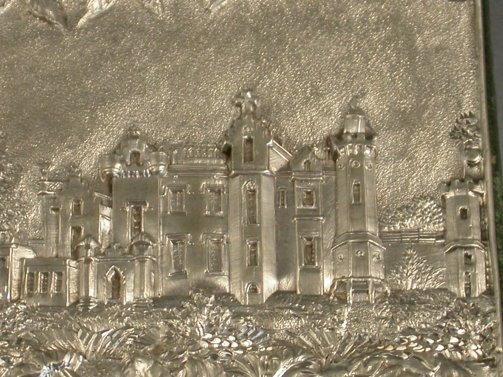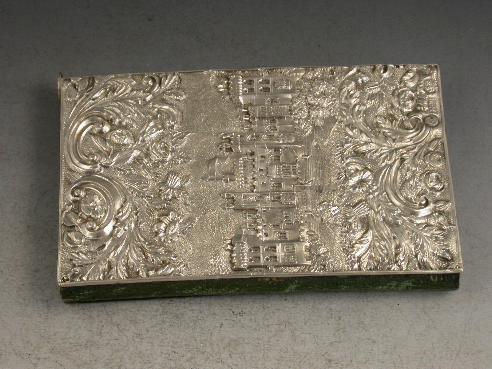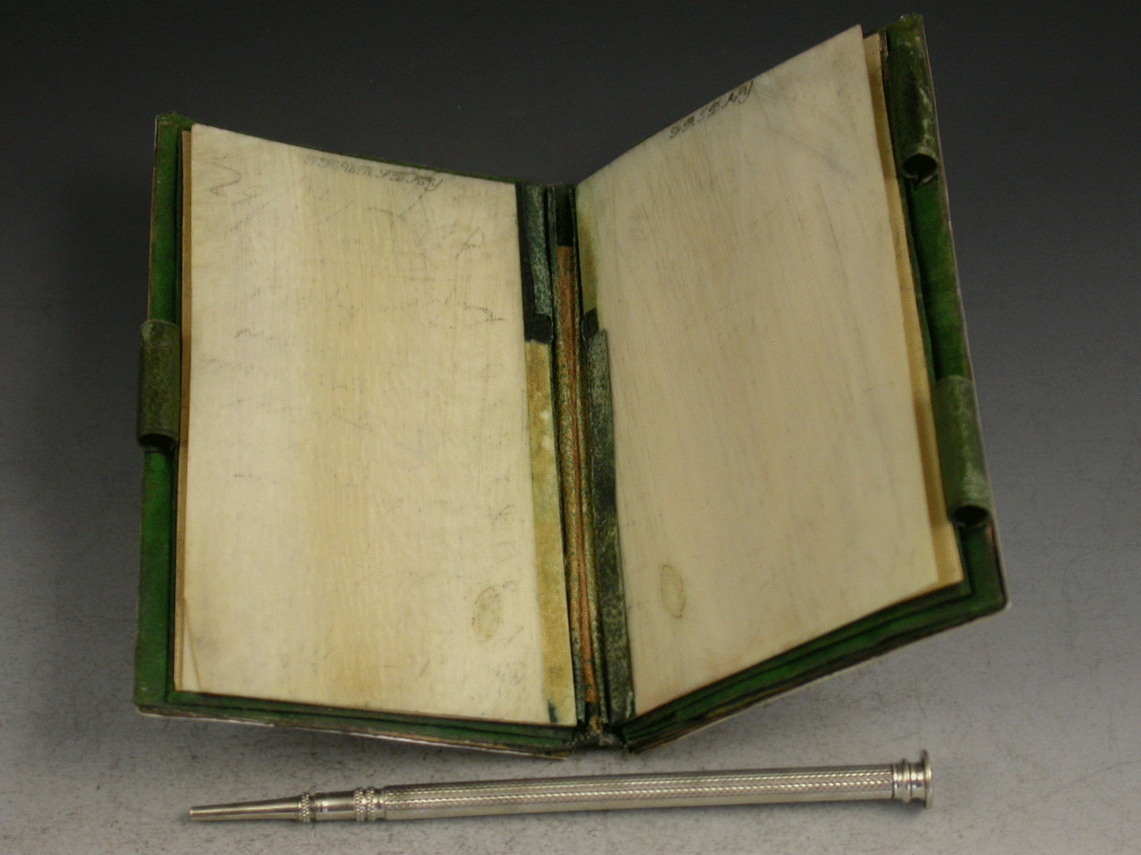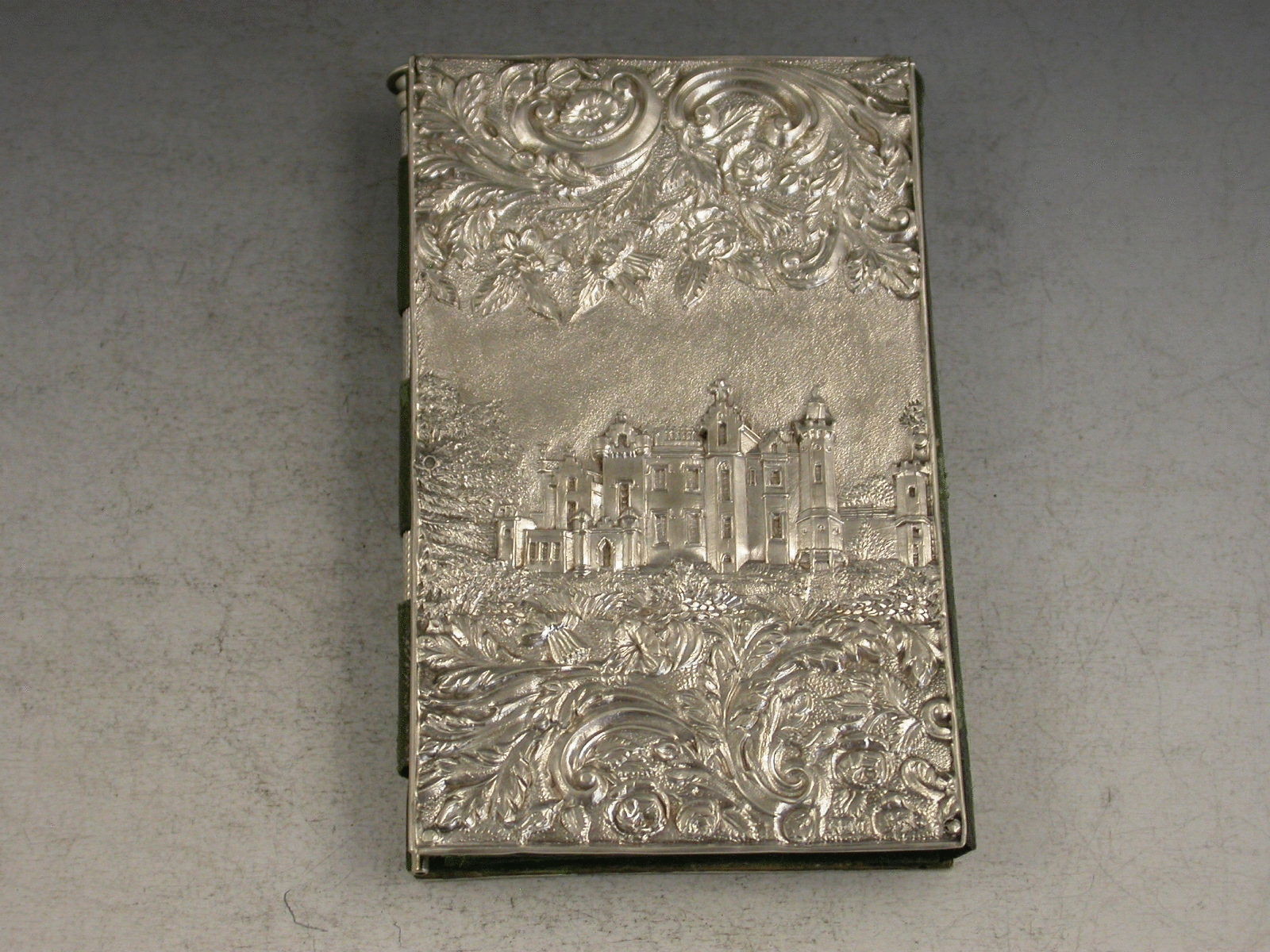 A fine Victorian silver Aide Memoire, the two silver covers embossed and chased with views of Windsor Castle and Abbotsford House amongst foliate scroll work, the green leather and silk lined interior complete with ivory pages named with the days of the week, the whole held together with a silver propelling pencil.
