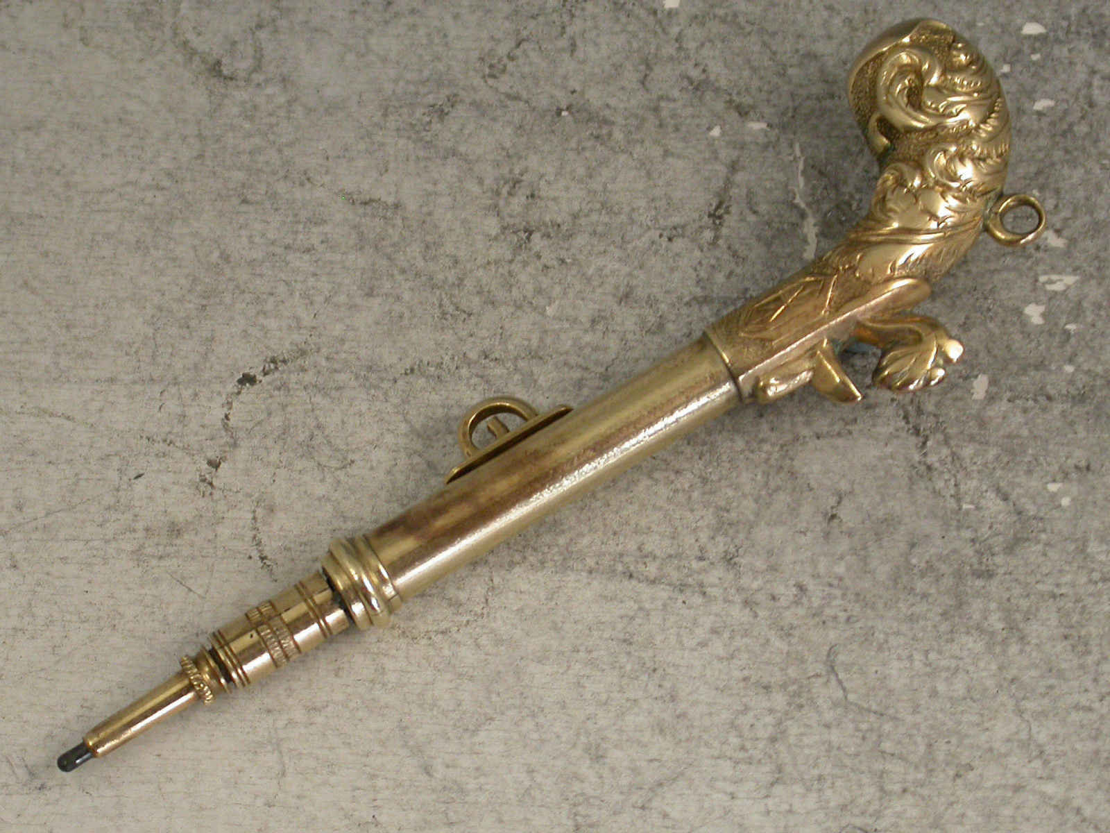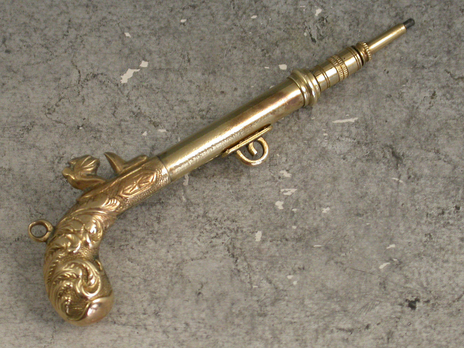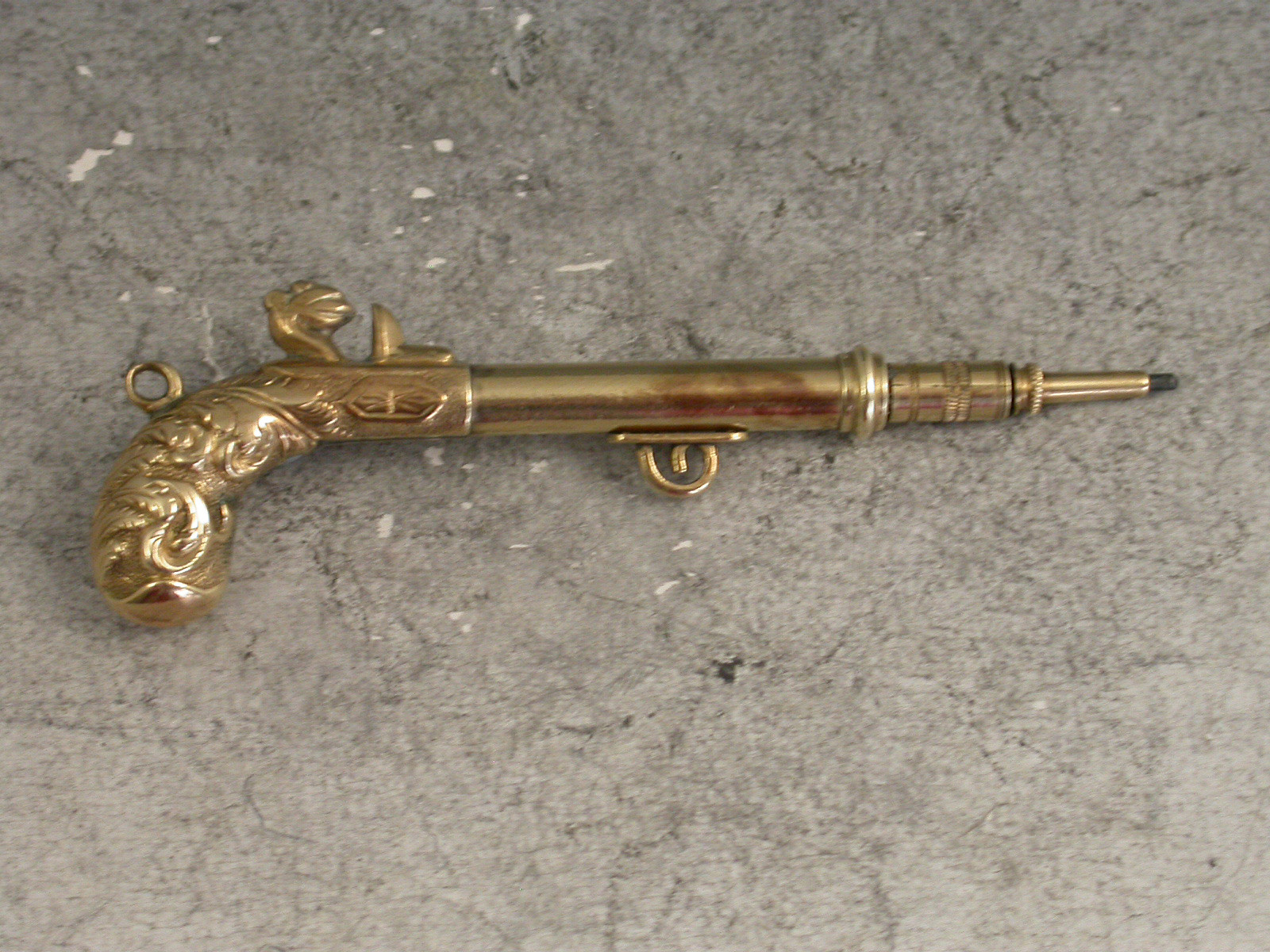 A rare Victorian novelty gold cased Propelling Pencil made in the form of a Percussion Pistol, the trigger guard sliding to extend the pencil.