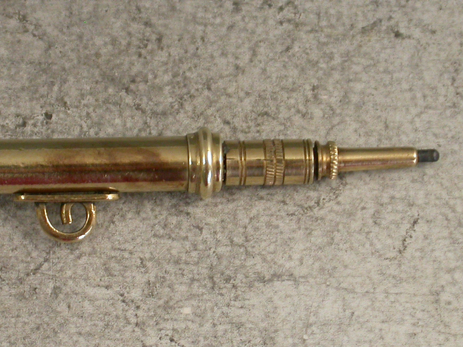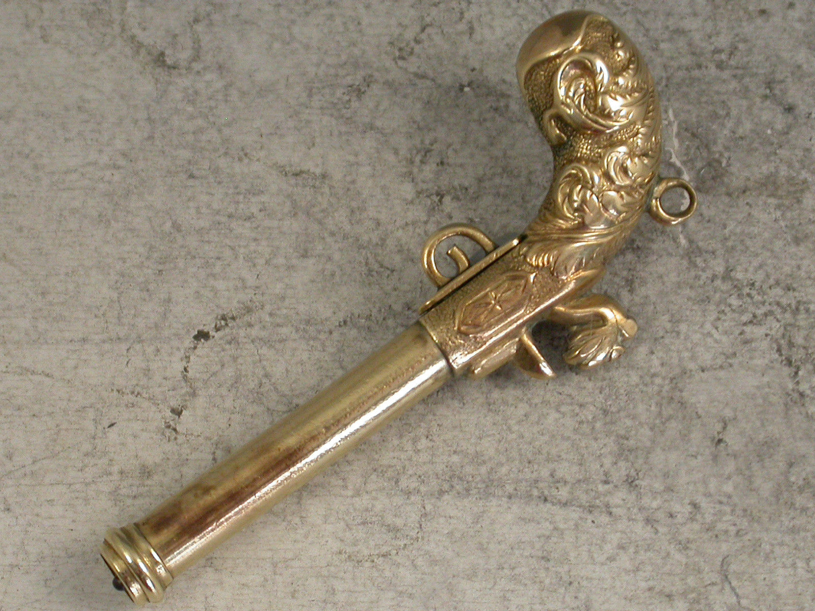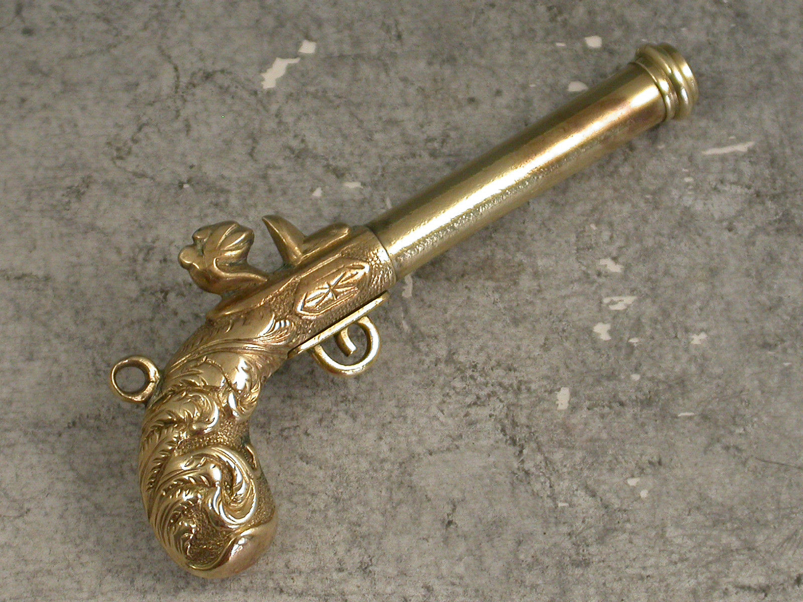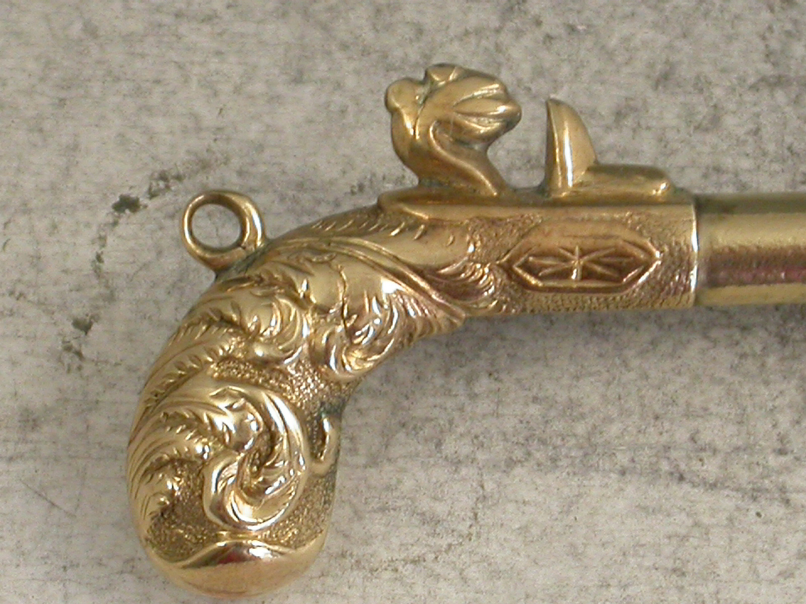 A rare Victorian novelty gold cased Propelling Pencil made in the form of a Percussion Pistol, the trigger guard sliding to extend the pencil.