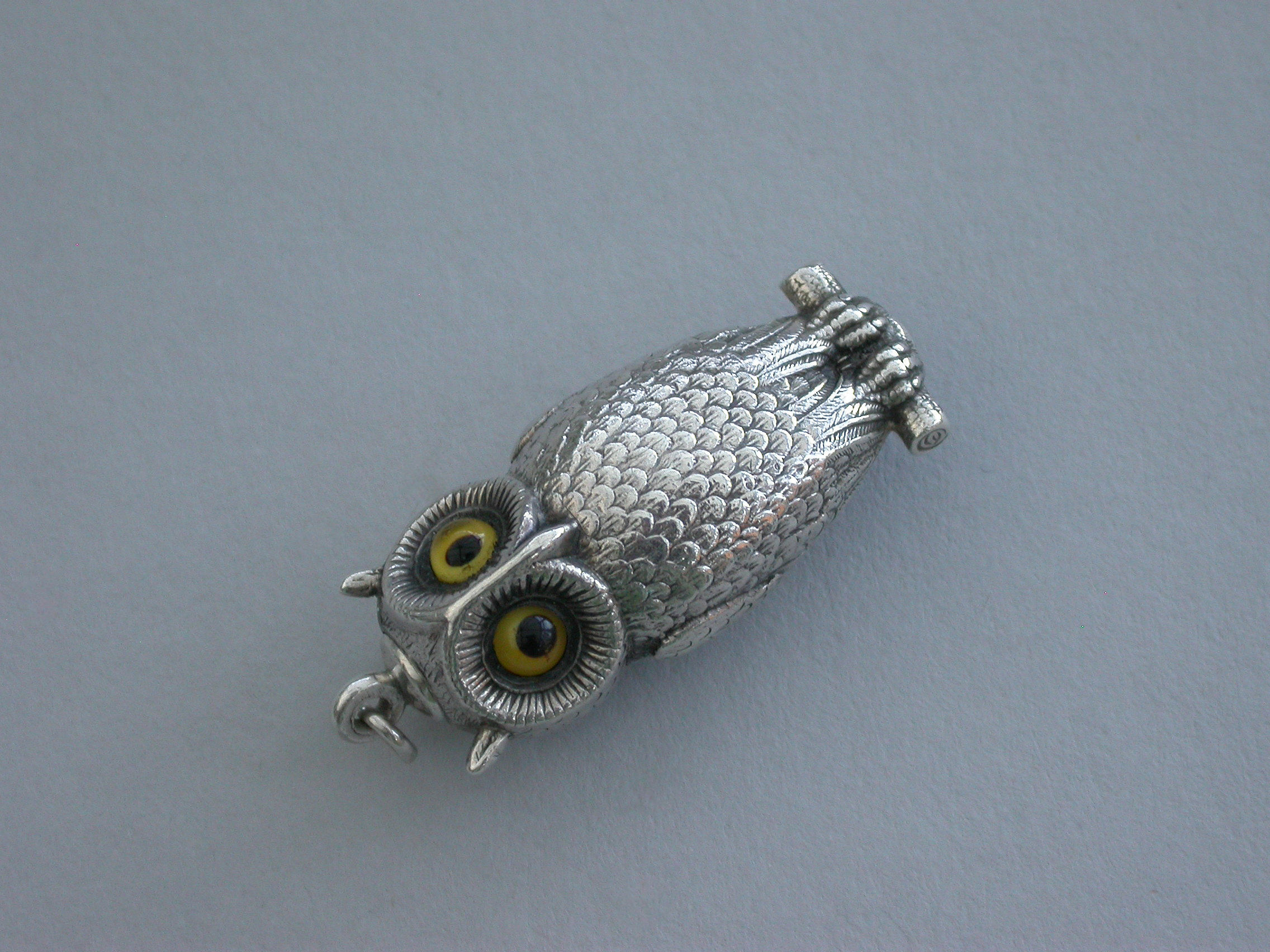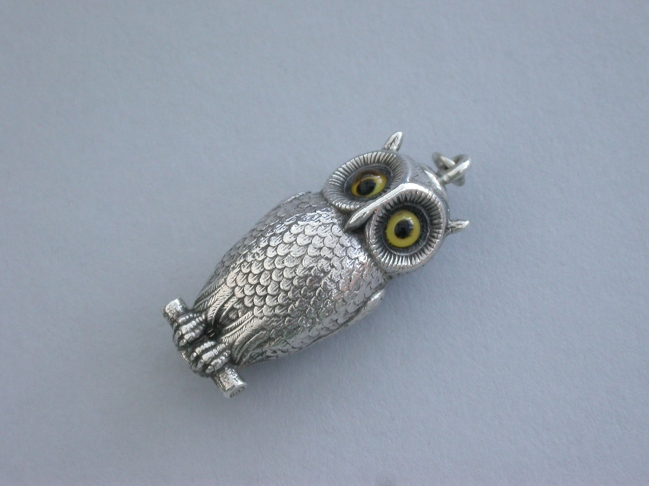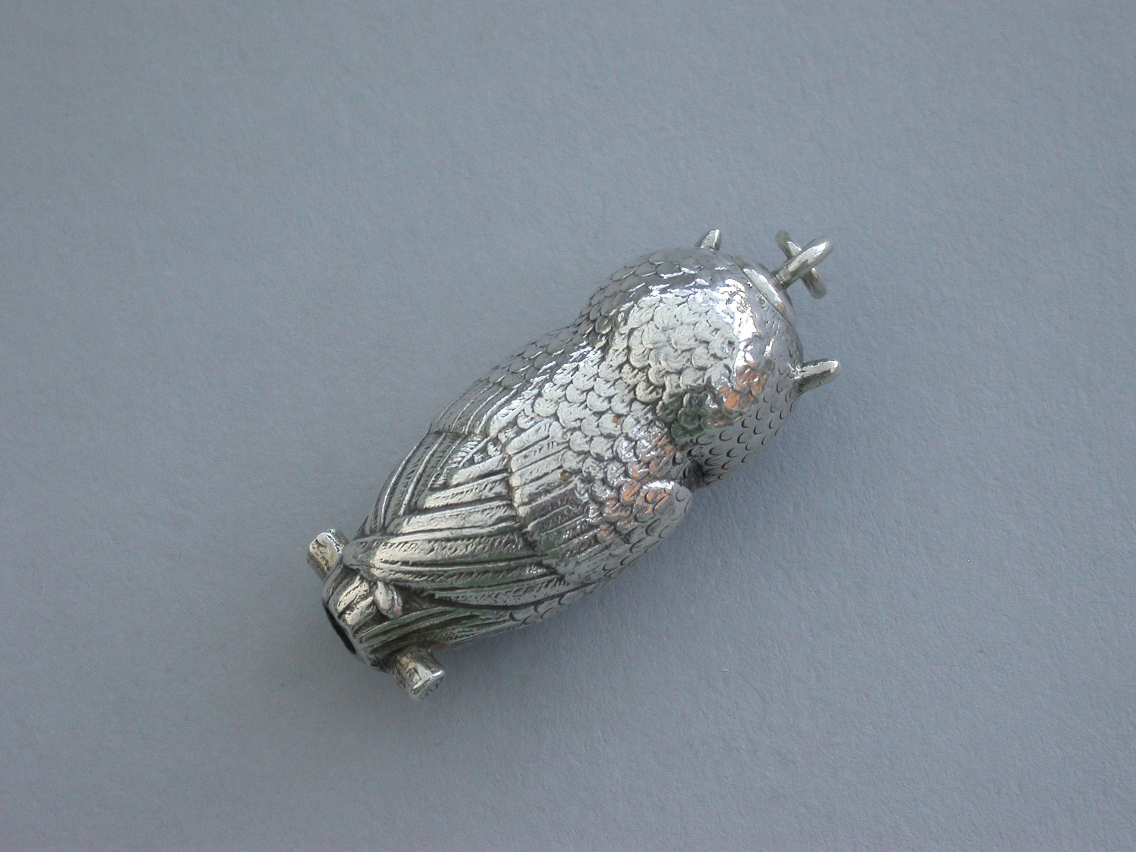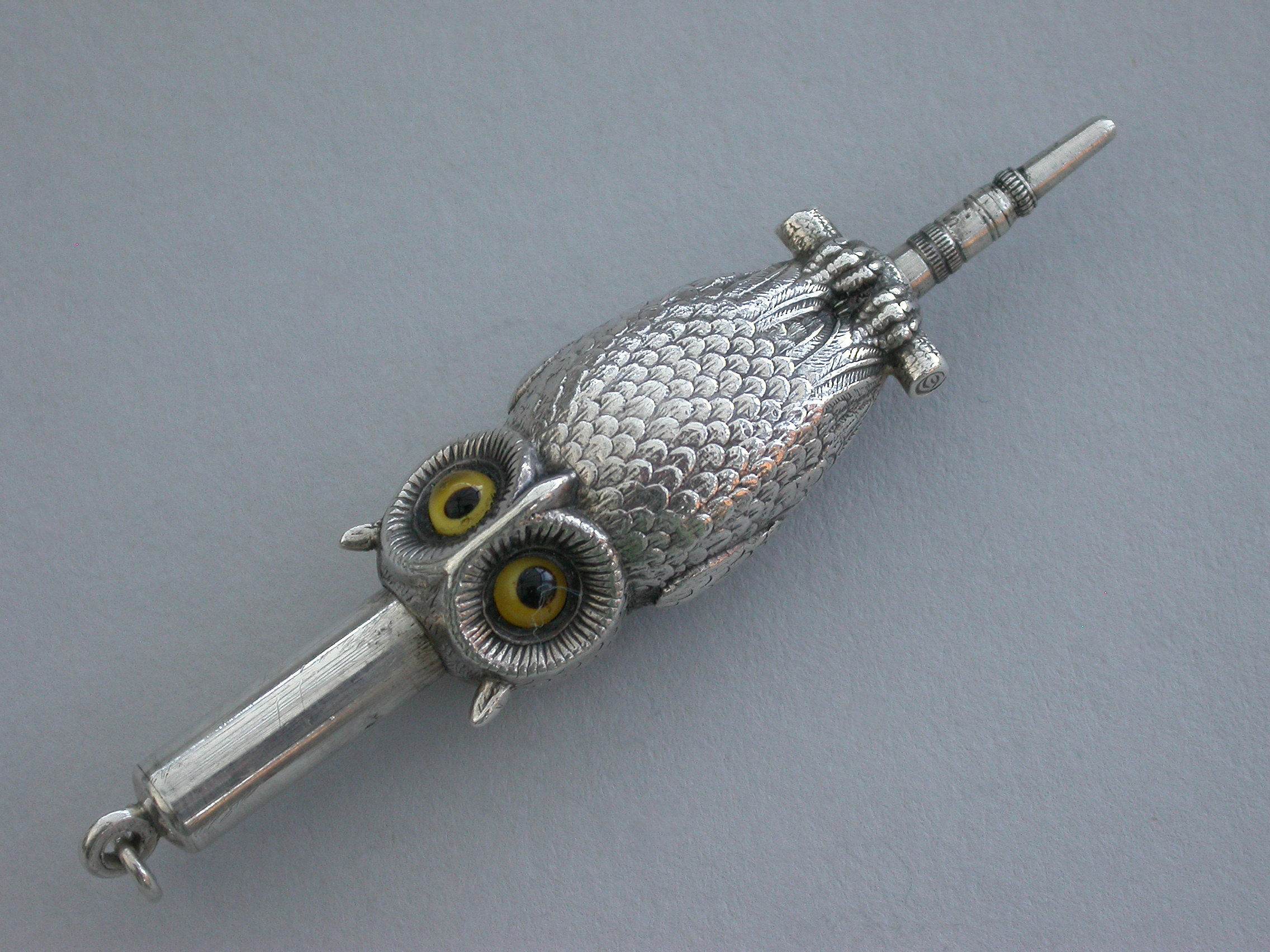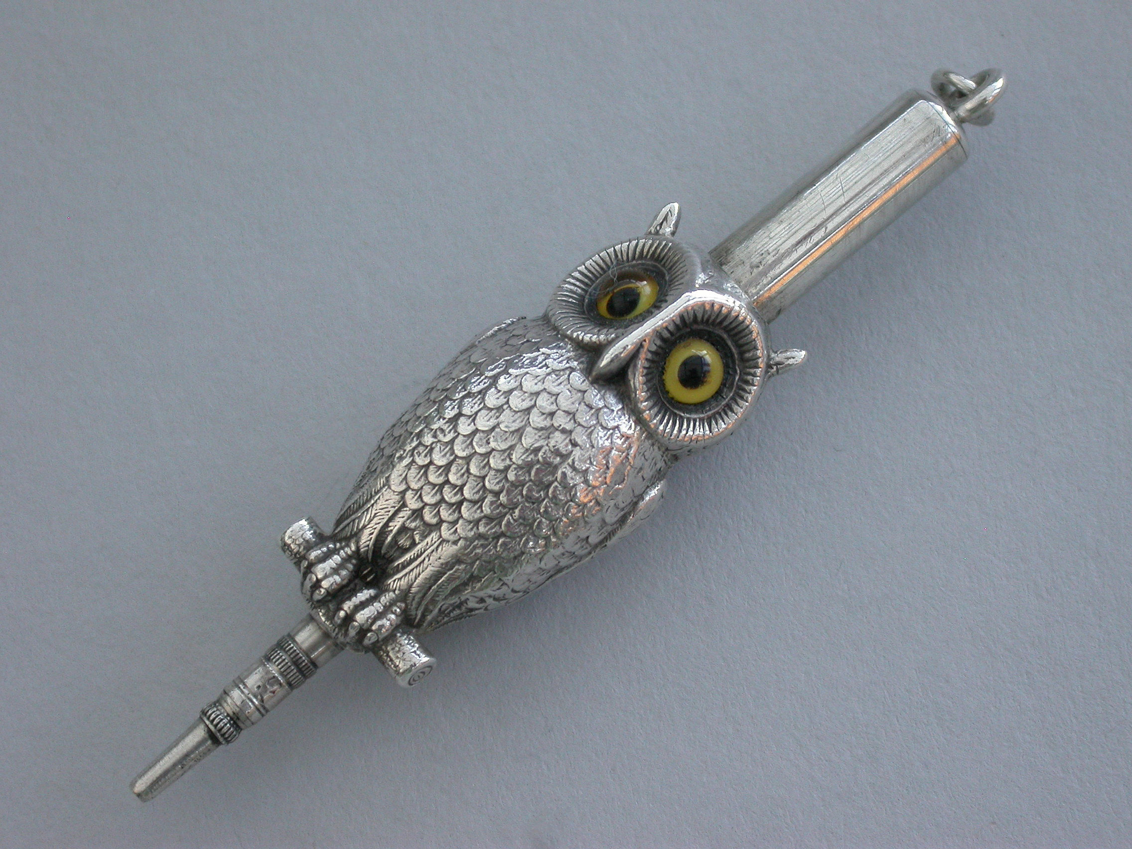 A rare Victorian novelty silver Propelling Pencil made in the form of an Owl sitting on a perch, with amber coloured glass eyes and attached suspension ring.