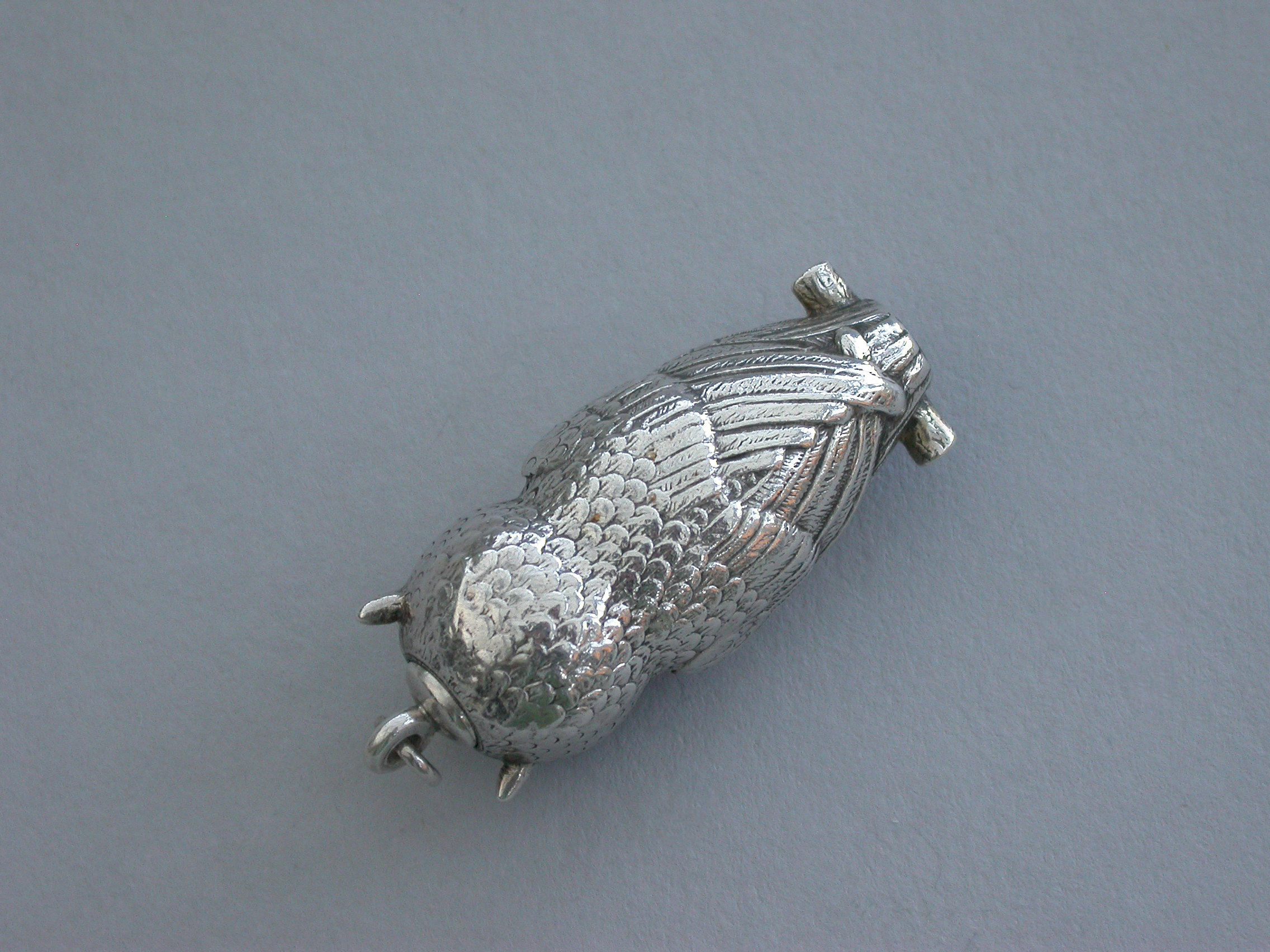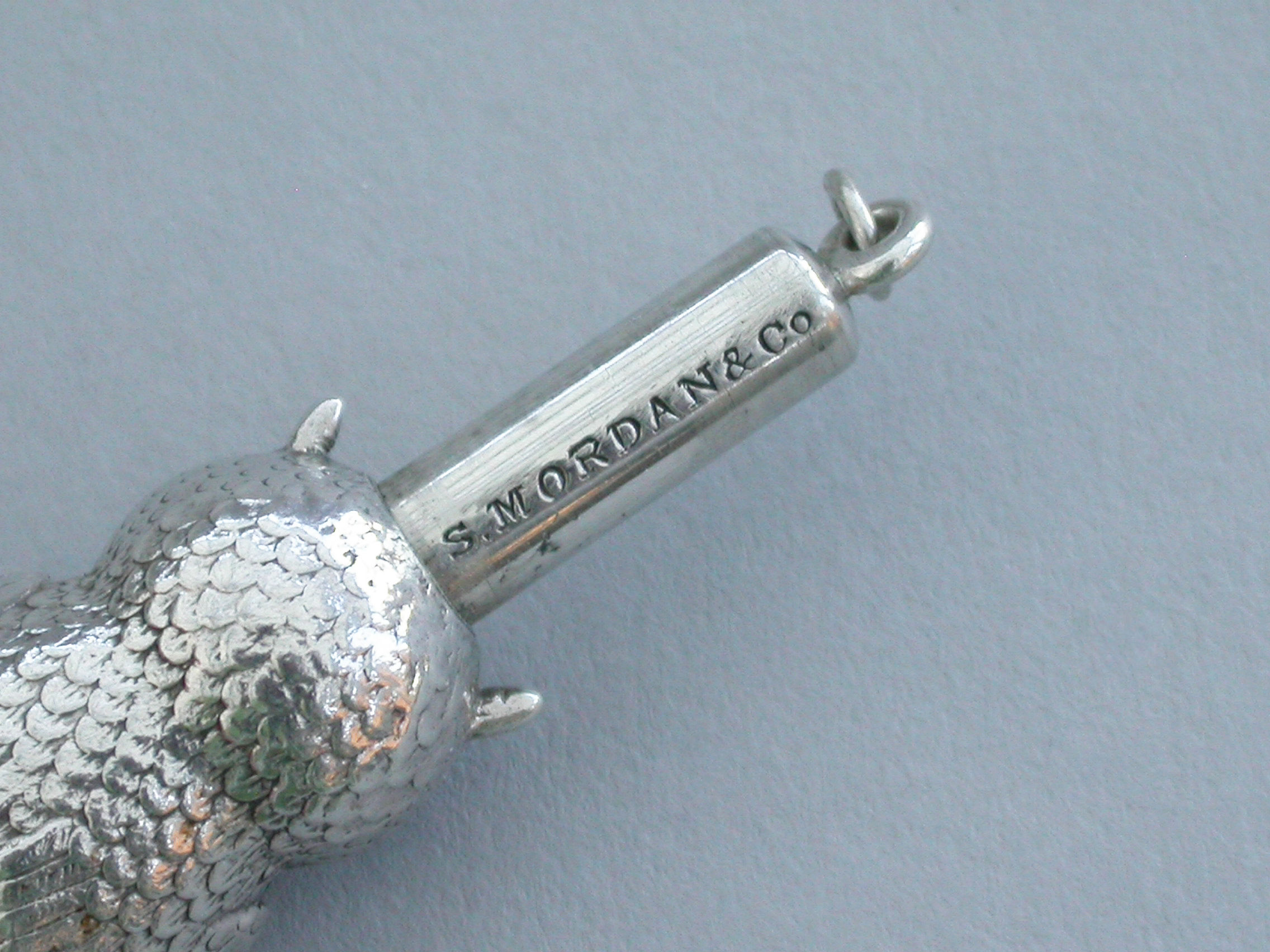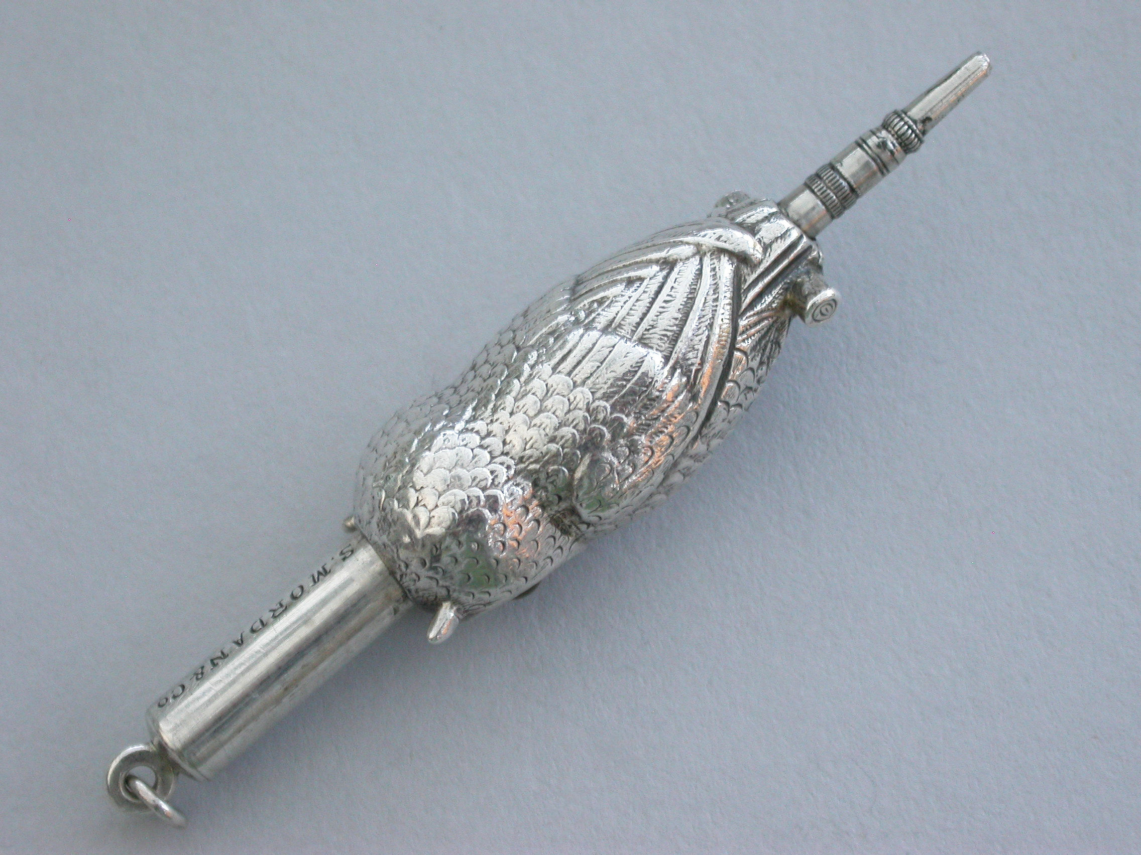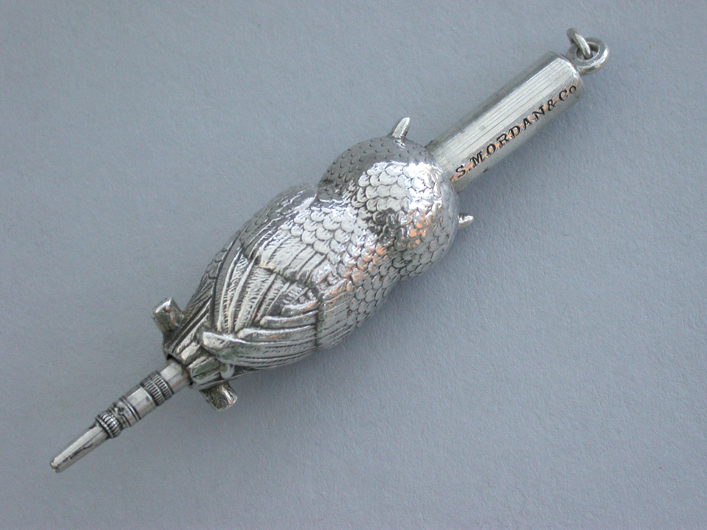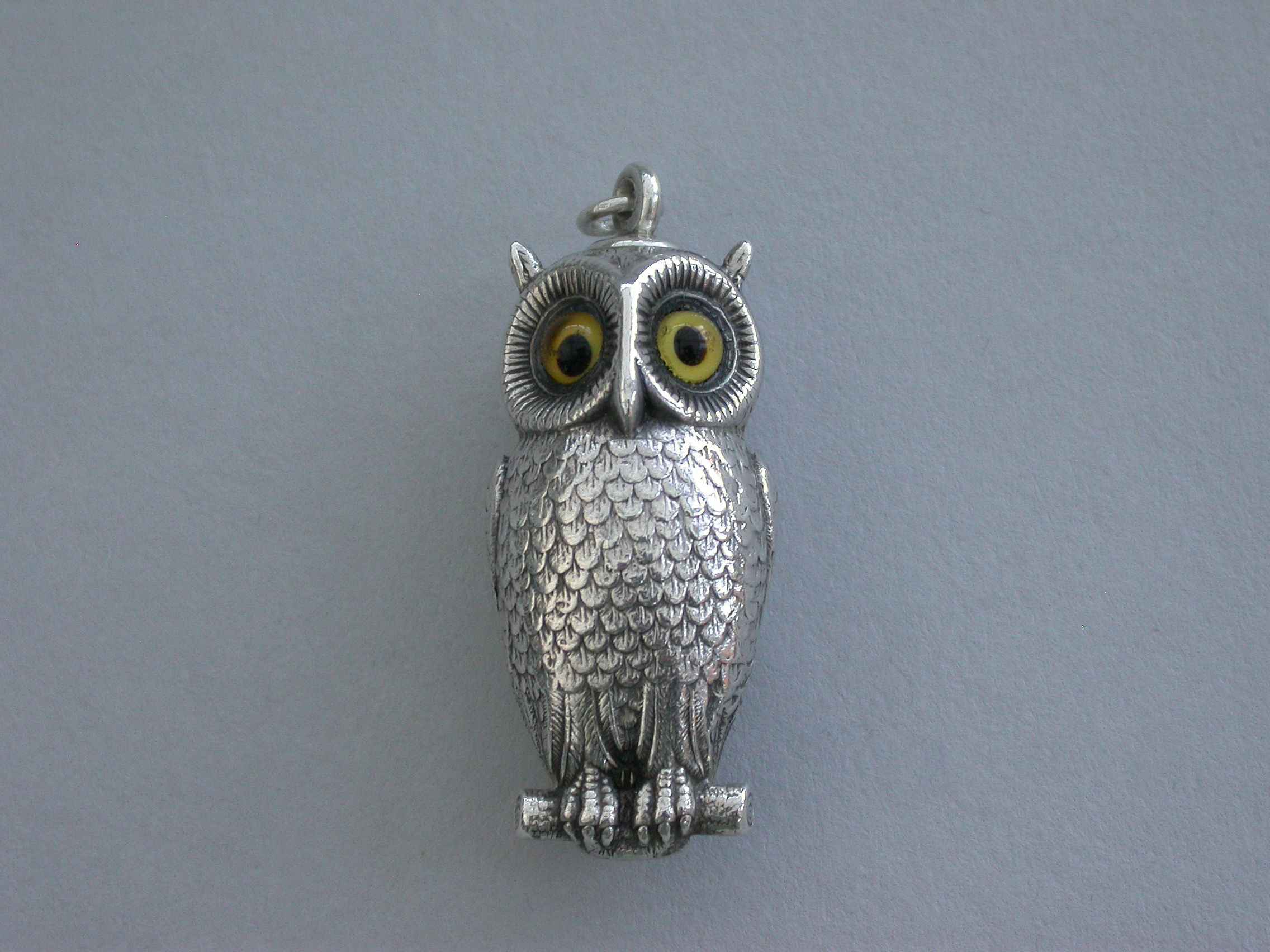 A rare Victorian novelty silver Propelling Pencil made in the form of an Owl sitting on a perch, with amber coloured glass eyes and attached suspension ring.