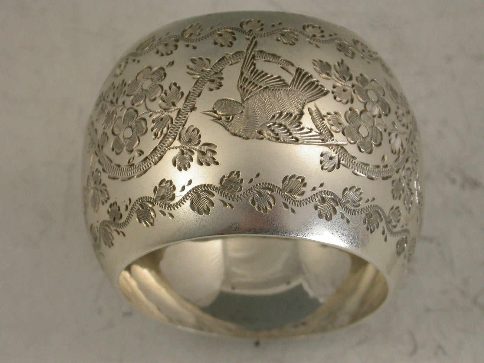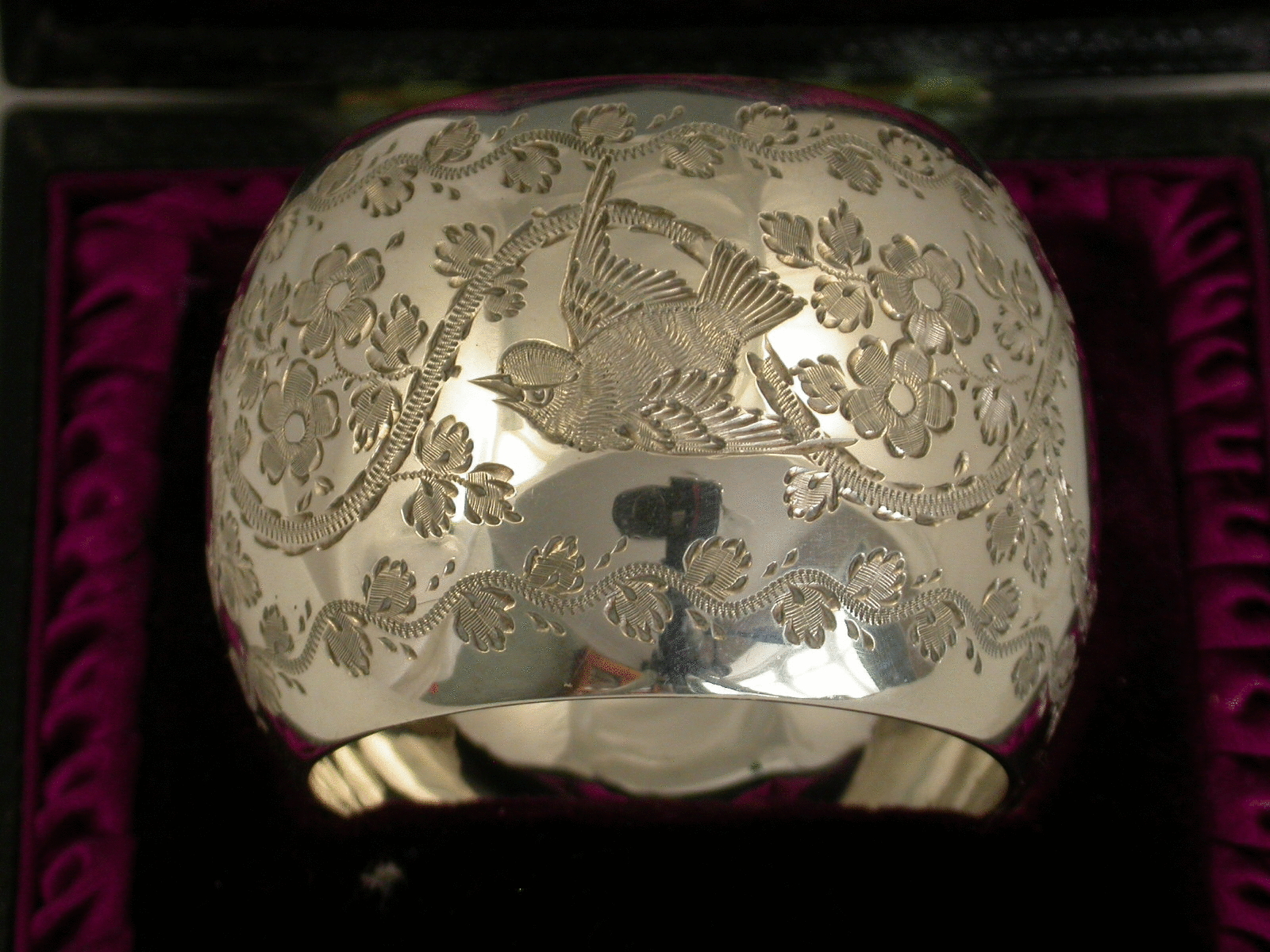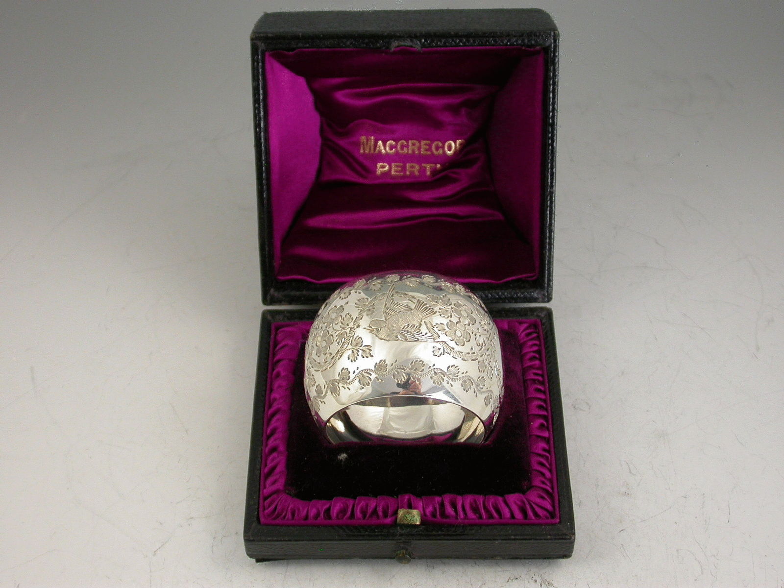 A good Victorian silver Napkin Ring finely engraved in the aesthetic style with birds flying amongst foliage, complete with silk and velvet lined leather case.