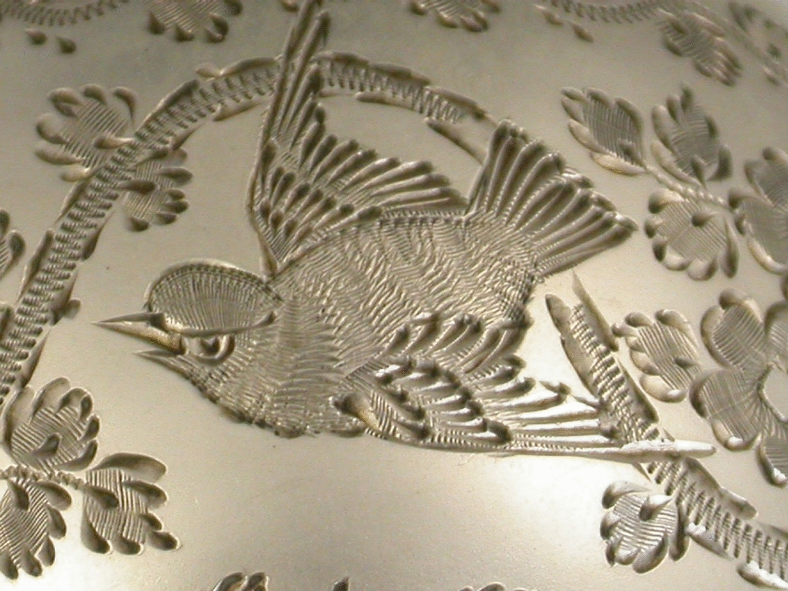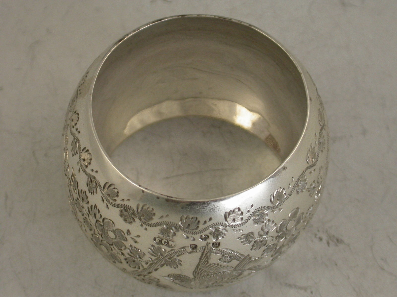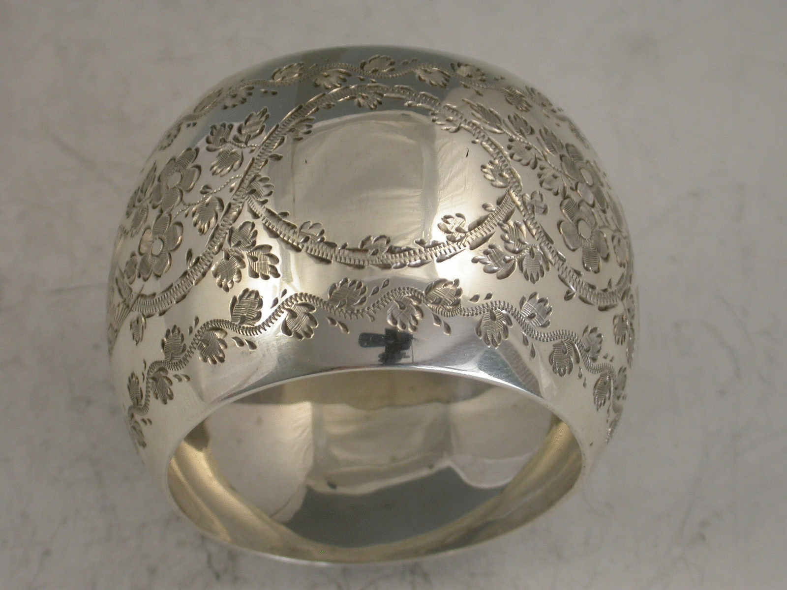 A good Victorian silver Napkin Ring finely engraved in the aesthetic style with birds flying amongst foliage, complete with silk and velvet lined leather case.
