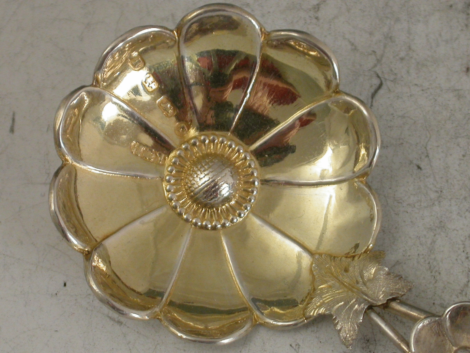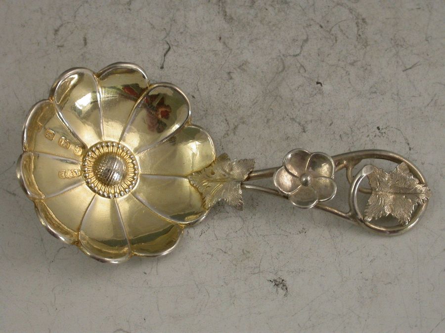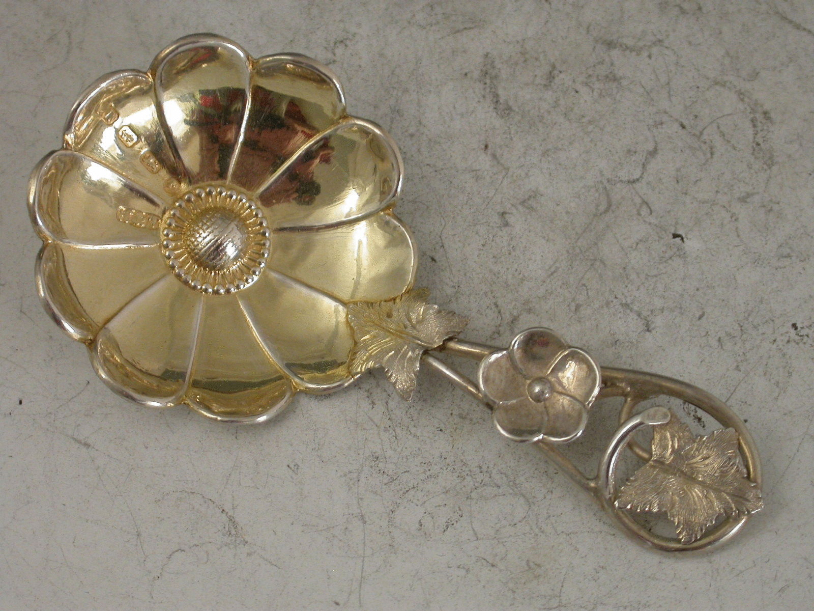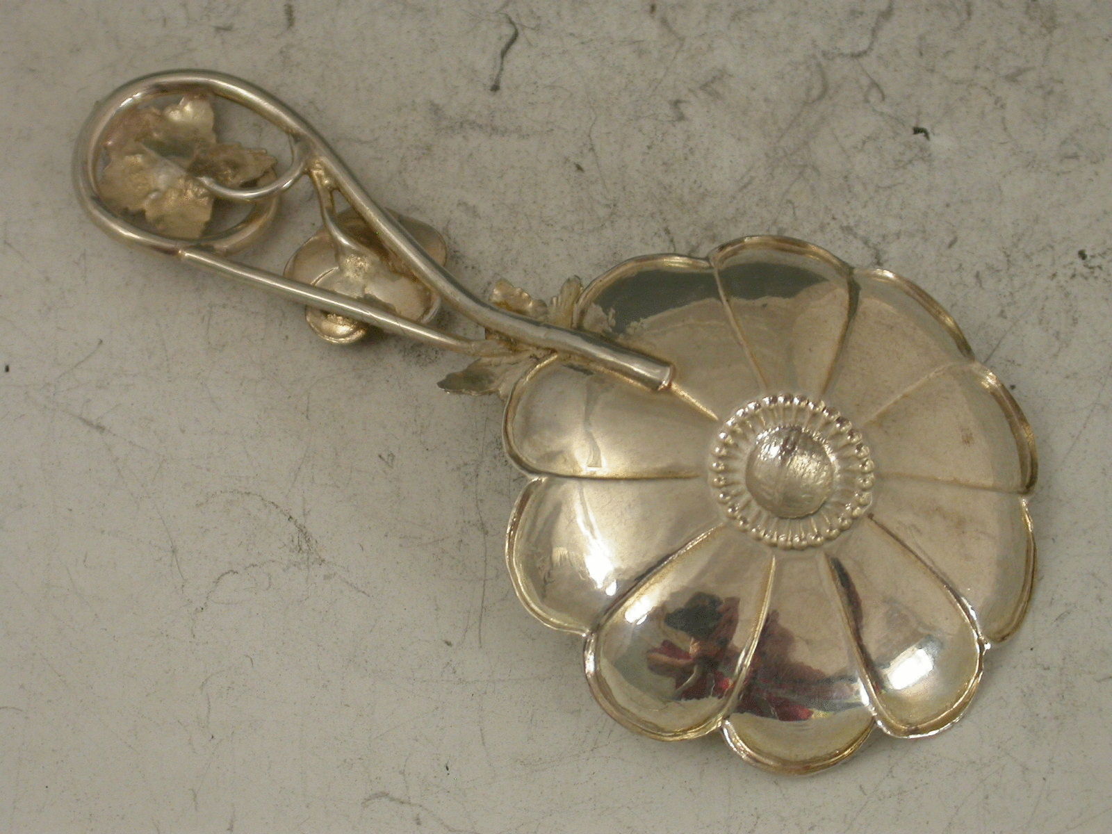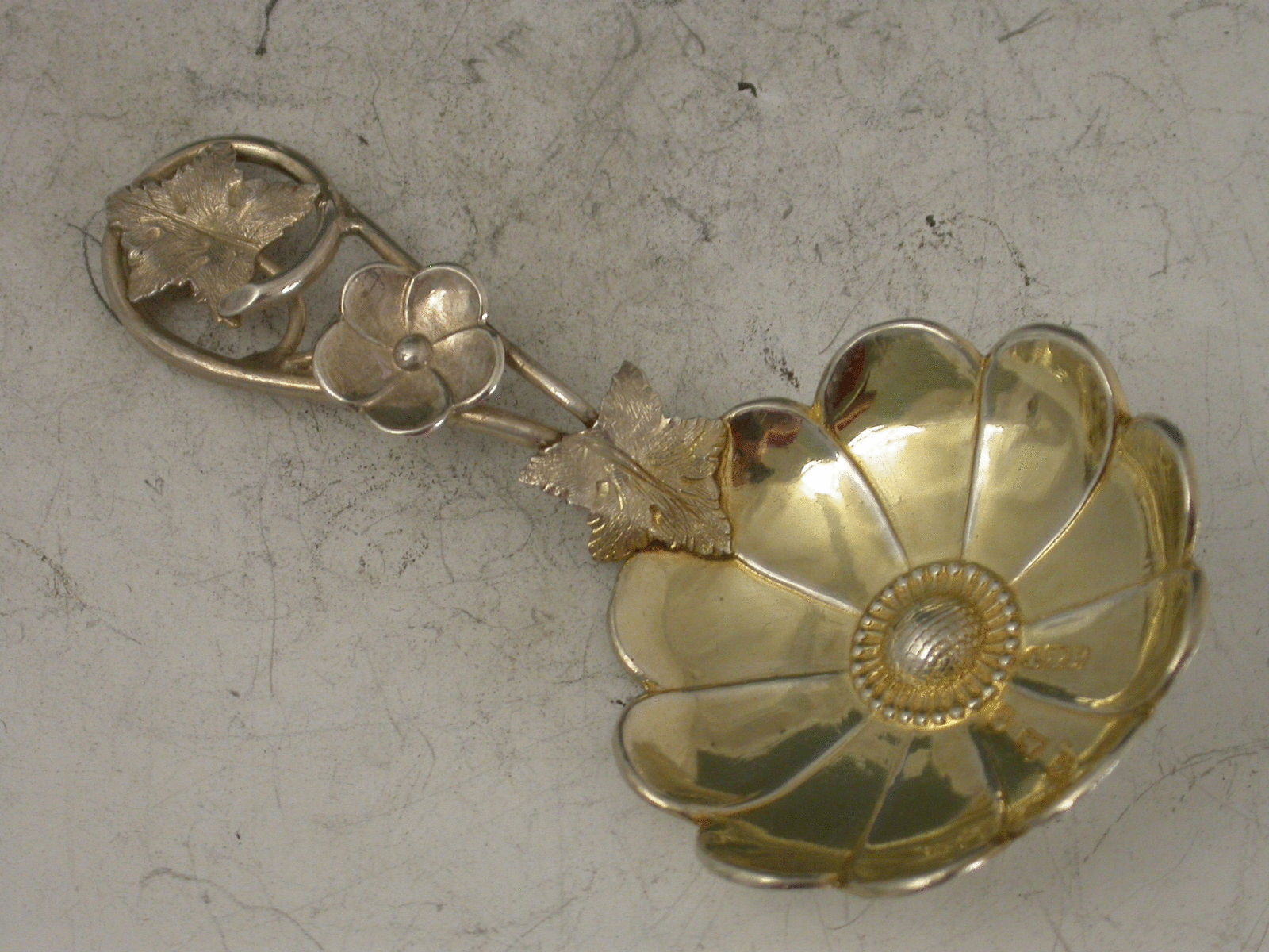 A fine Victorian silver Caddy Spoon with pierced twisted wire work handle with applied vine leaves and flower head, the gilded bowl in the form of an Anemone flower.