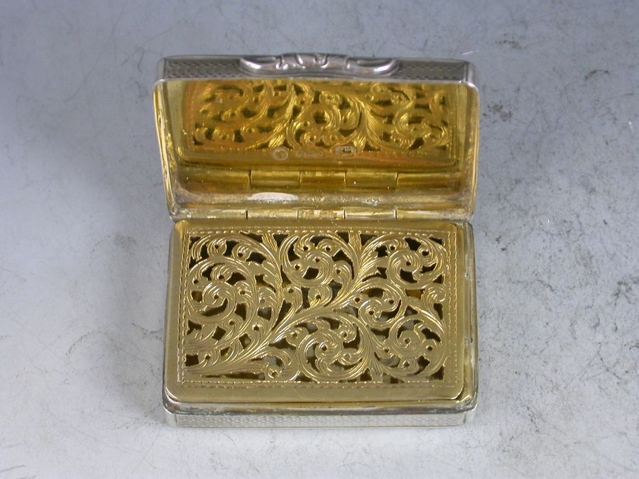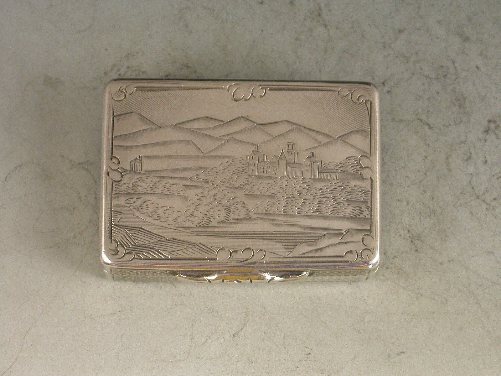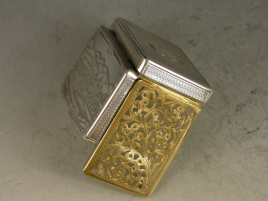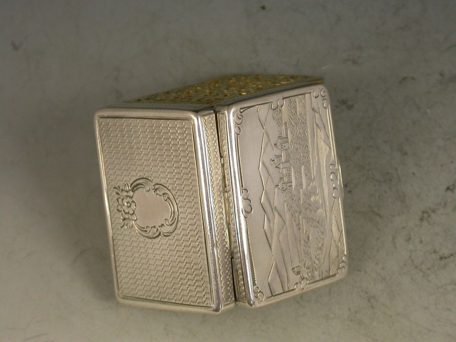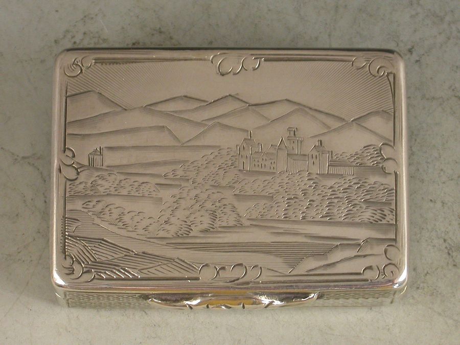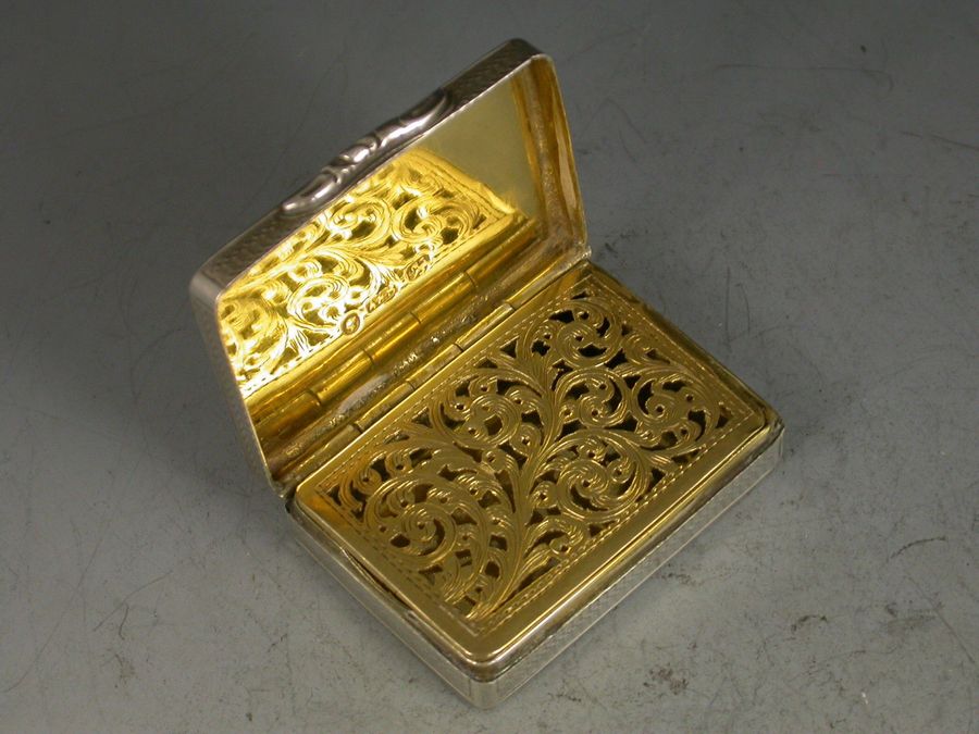 An extremely rare Victorian silver Vinaigrette with engine turned decoration to the base and sides, the lid engraved with a rare view of Balmoral Castle. The silver gilt interior with foliate scroll pierced grille.