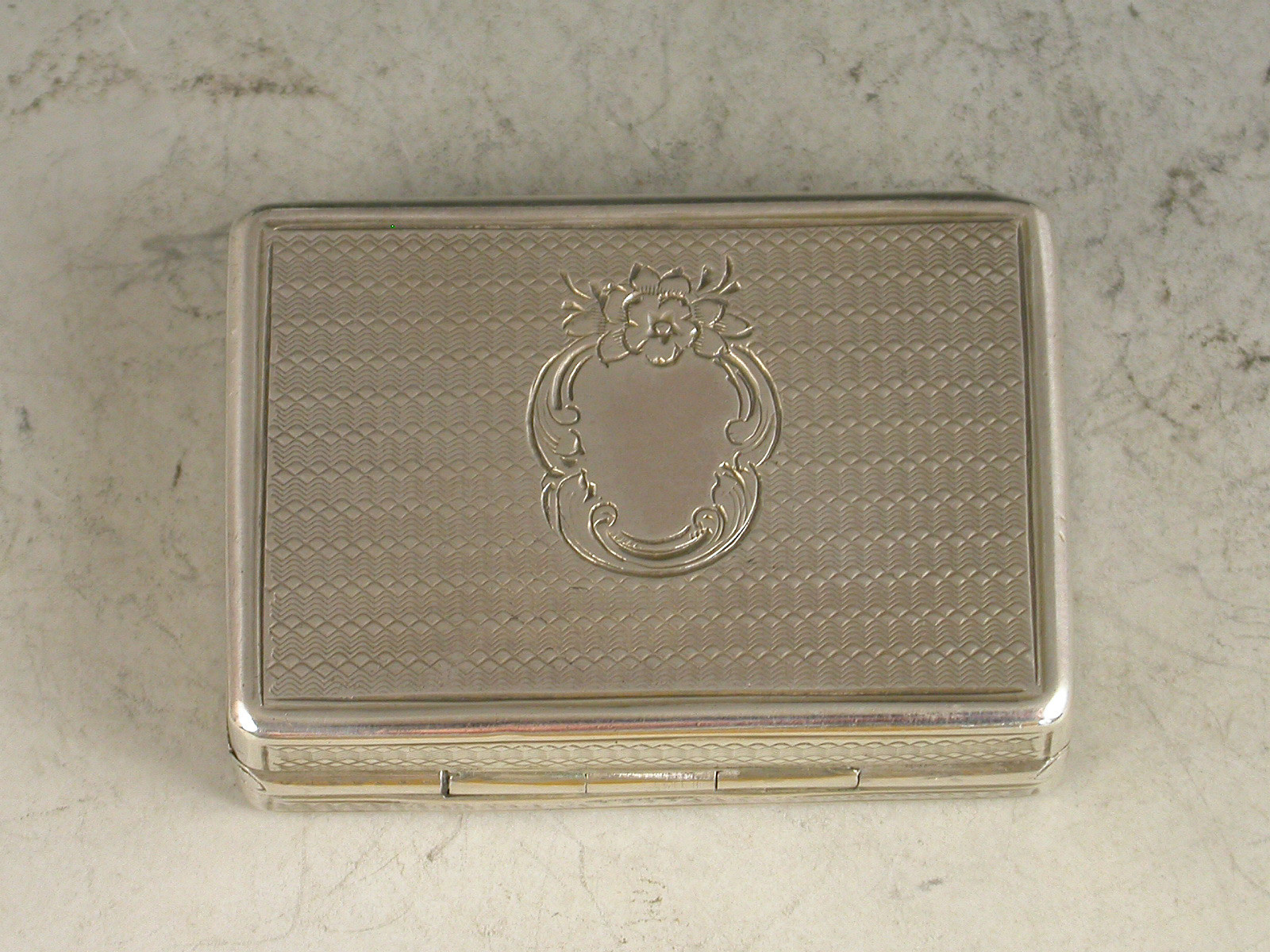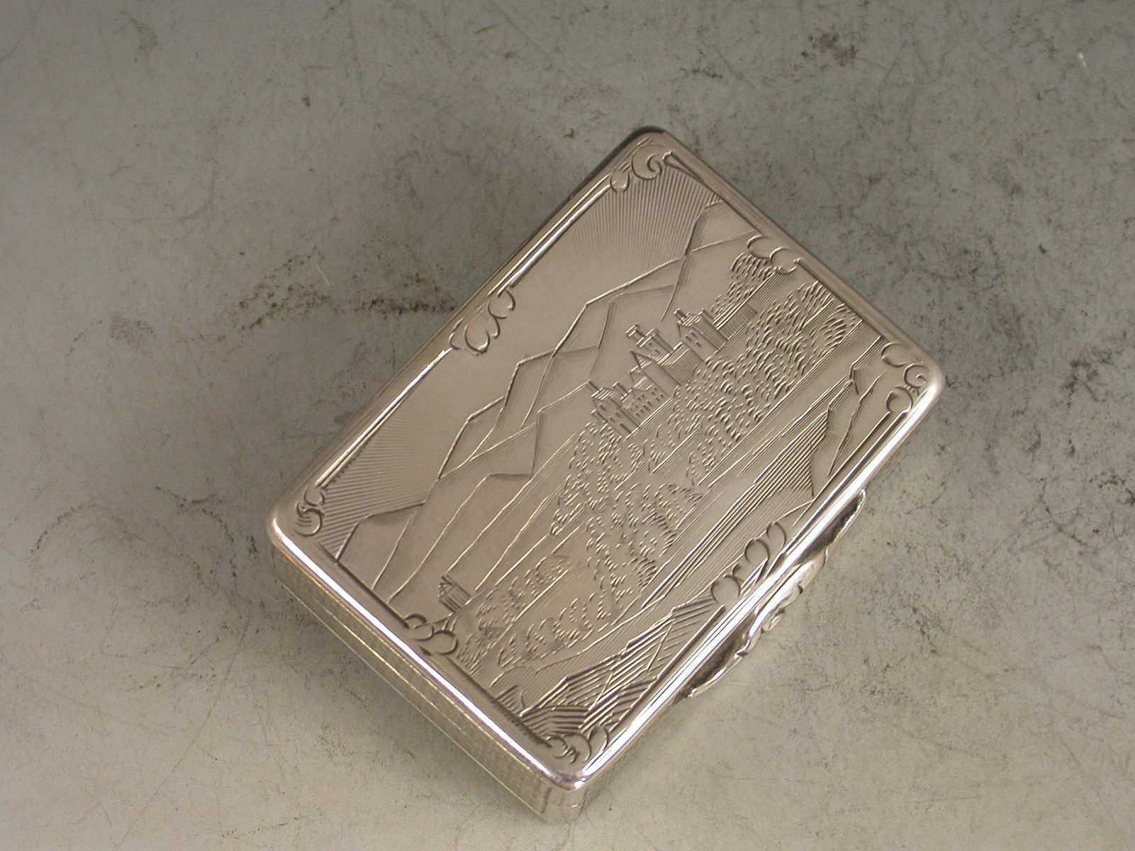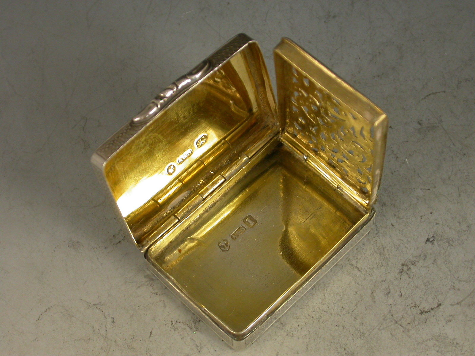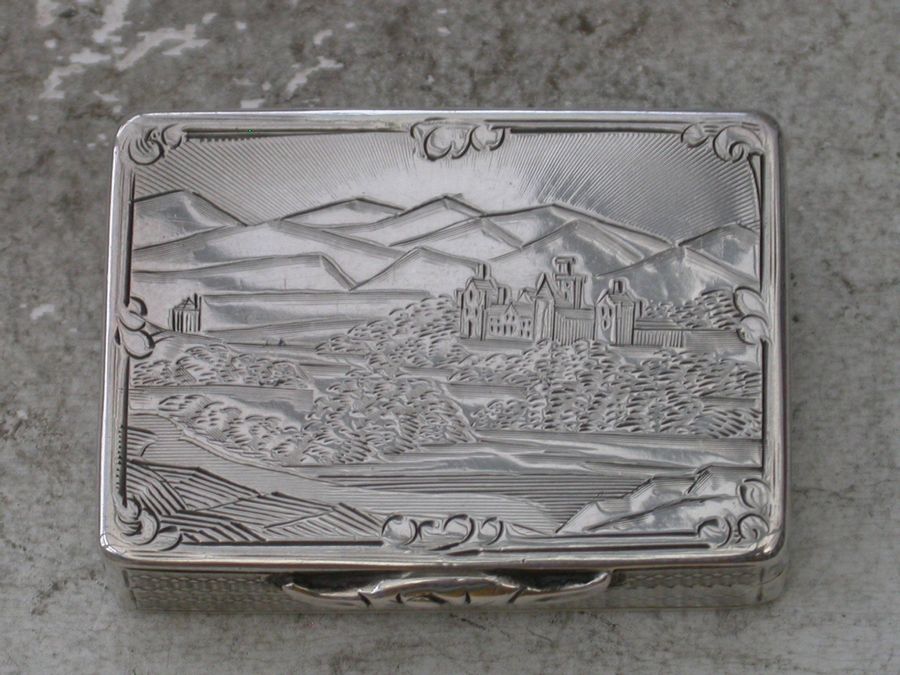 An extremely rare Victorian silver Vinaigrette with engine turned decoration to the base and sides, the lid engraved with a rare view of Balmoral Castle. The silver gilt interior with foliate scroll pierced grille.