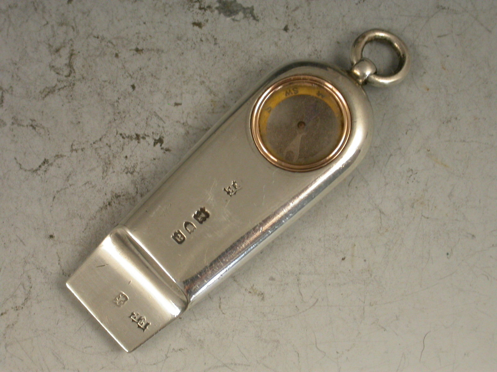 A good quality Victorian silver Whistle with attached suspension ring, the handle inset with a gold framed Compass.