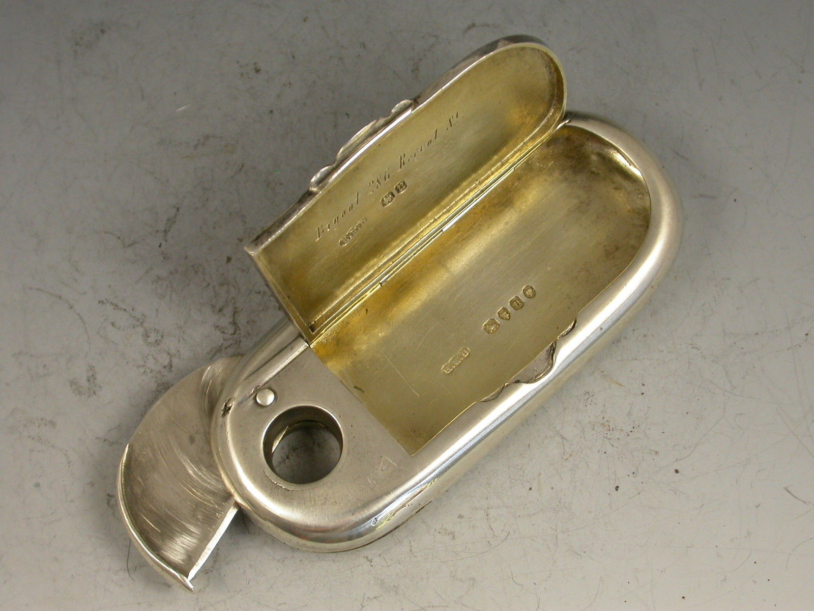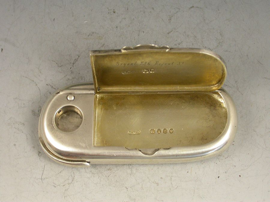 A good quality Victorian silver combined Vesta Case and Cigar Cutter of rounded rectangular form with sharp swiveling blade to one end. The hinged cover opening to reveal a silver gilt interior.