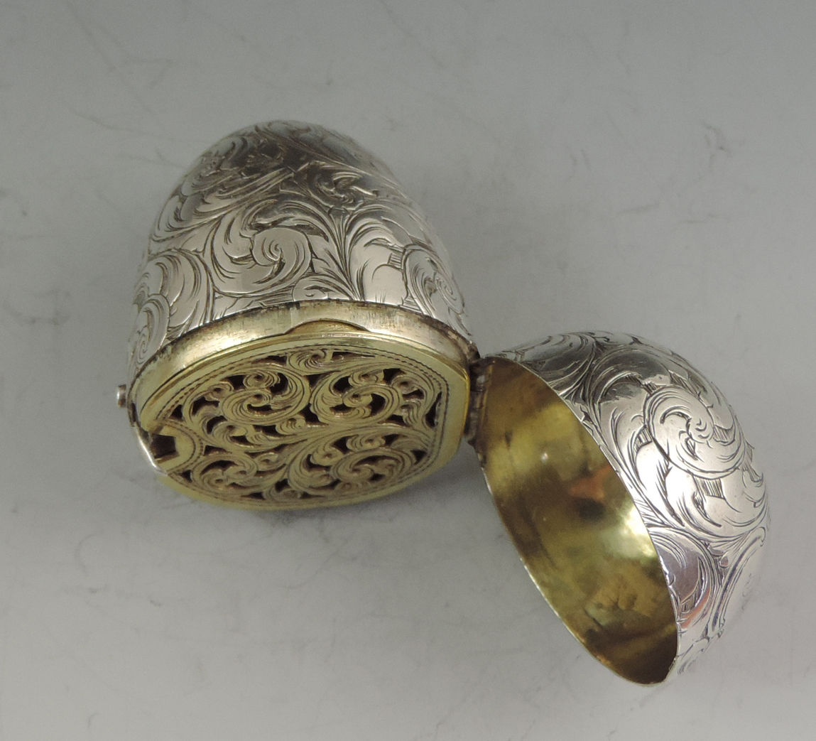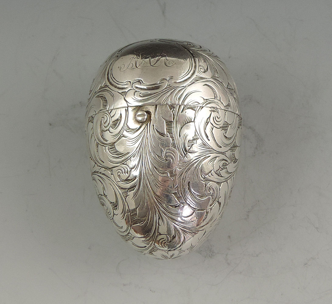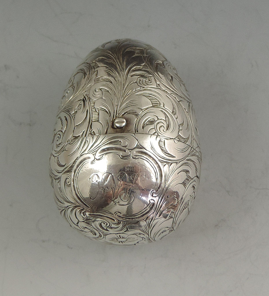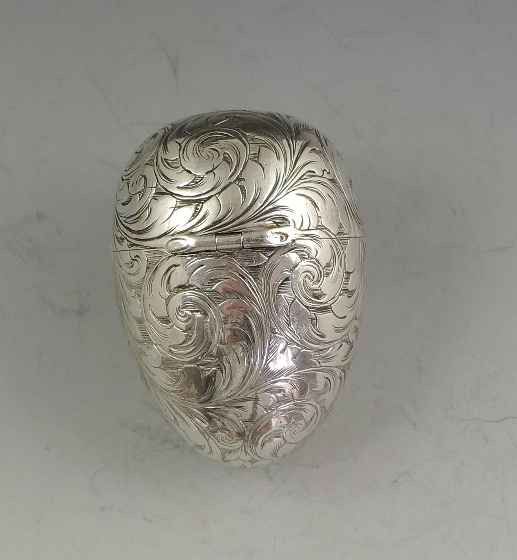 A fine and unusual Victorian silver Vinaigrette made in the form of an Egg, finely engraved with foliate scroll decoration and a cartouche engraved with contemporary initials, with unusual sprung push-button opening mechanism revealing the silver gilt interior with finely pierced foliate scroll grille.