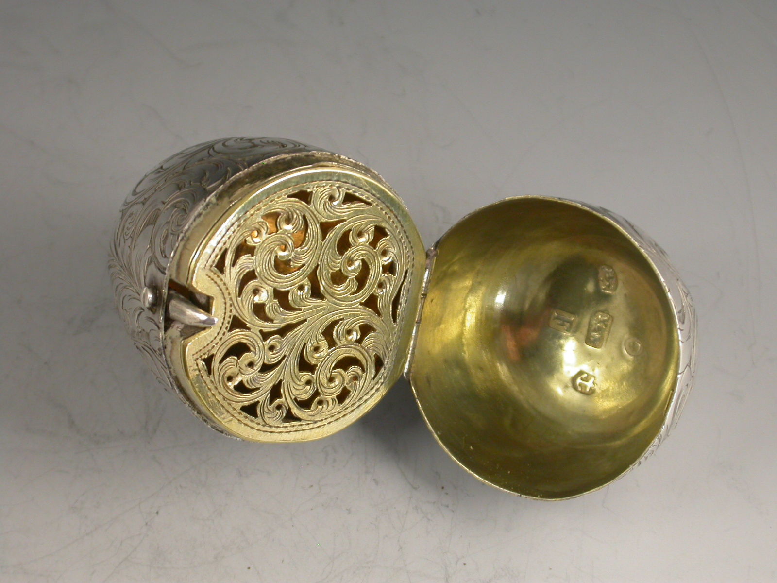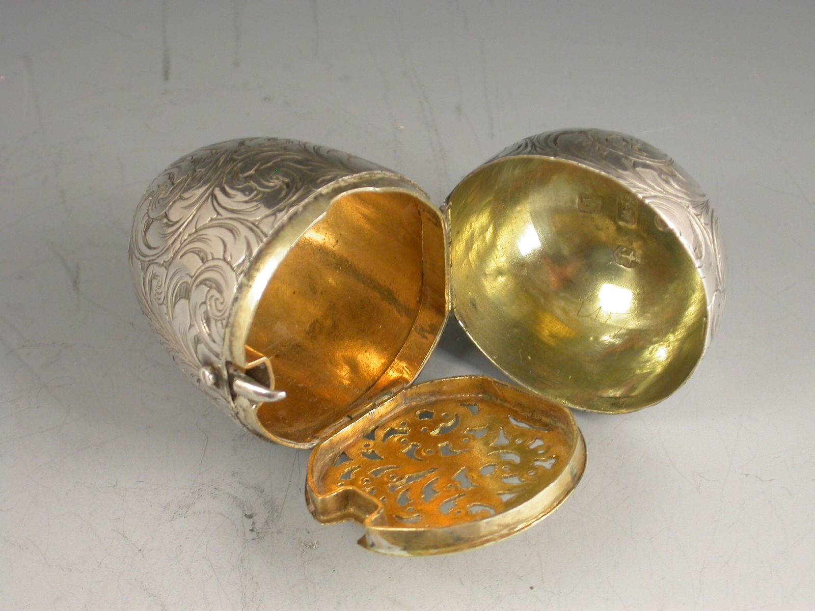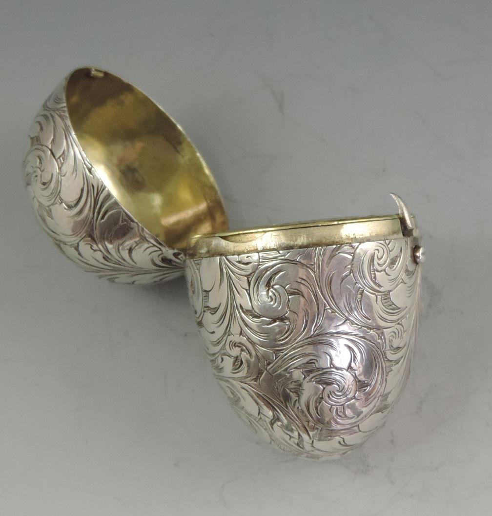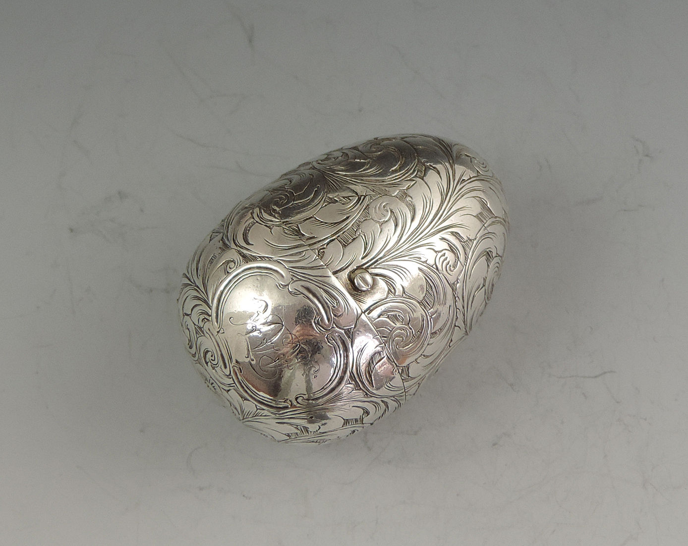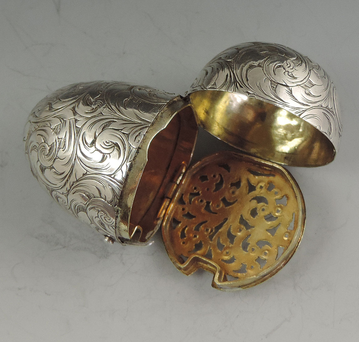 A fine and unusual Victorian silver Vinaigrette made in the form of an Egg, finely engraved with foliate scroll decoration and a cartouche engraved with contemporary initials, with unusual sprung push-button opening mechanism revealing the silver gilt interior with finely pierced foliate scroll grille.
