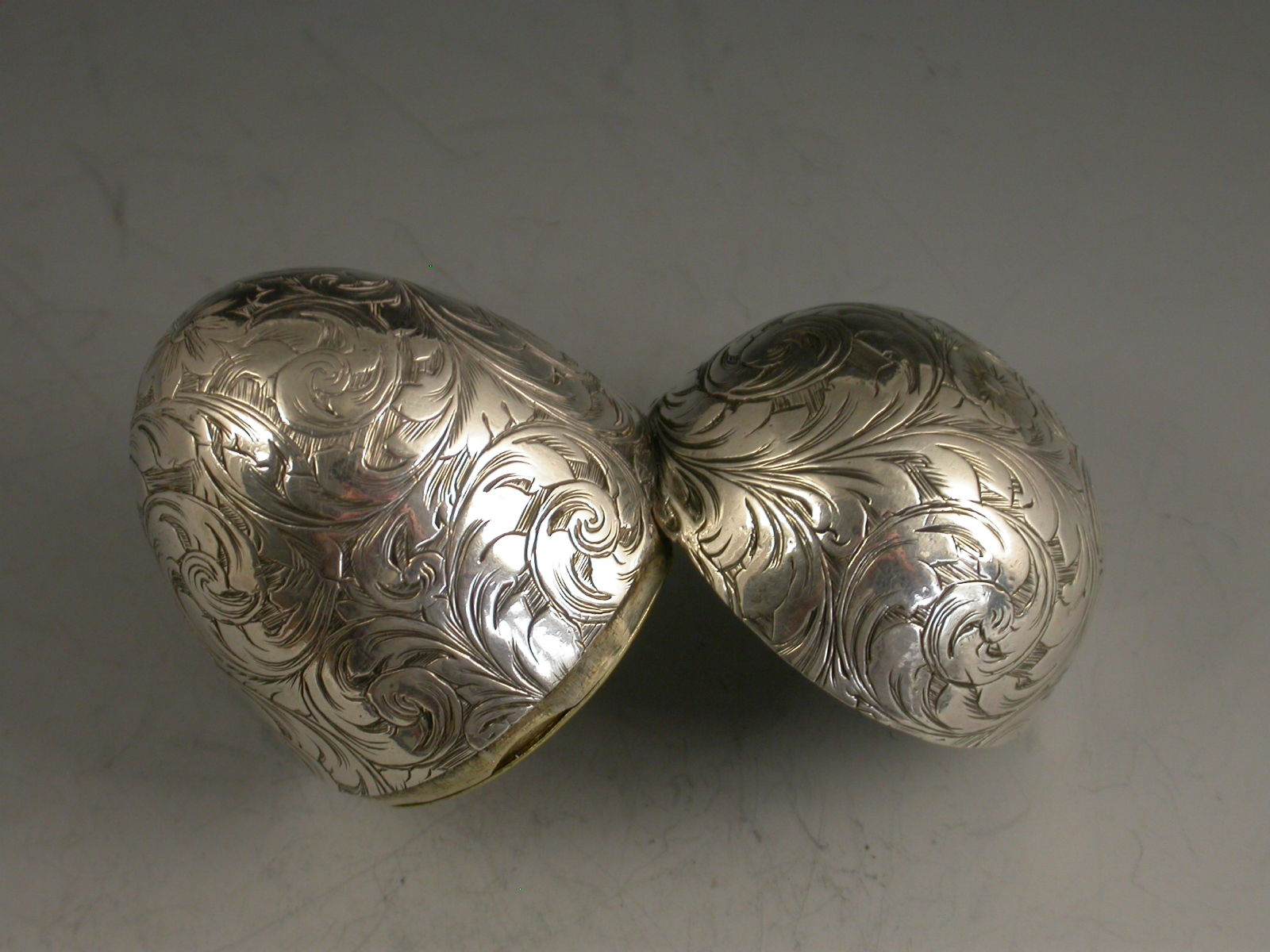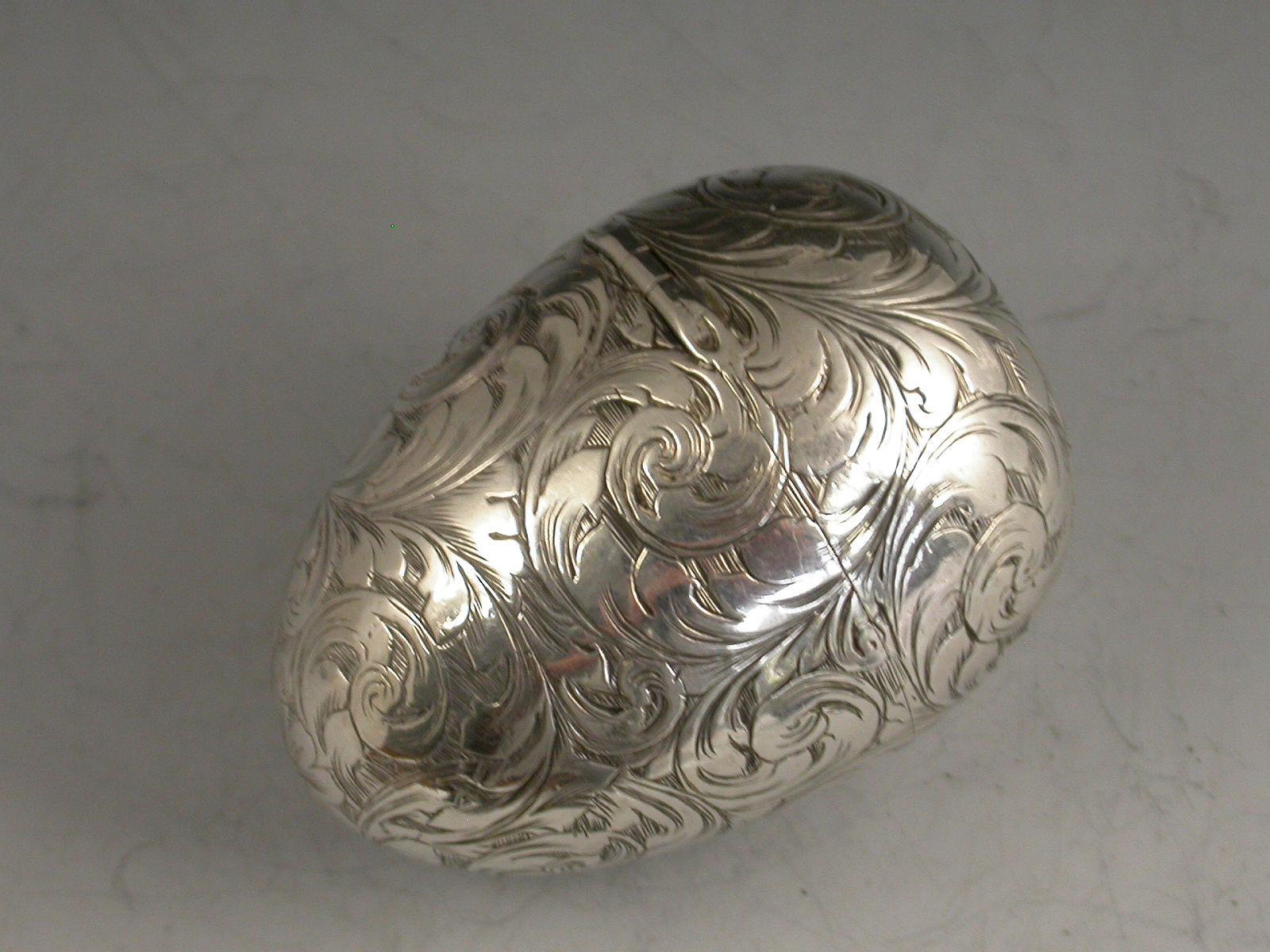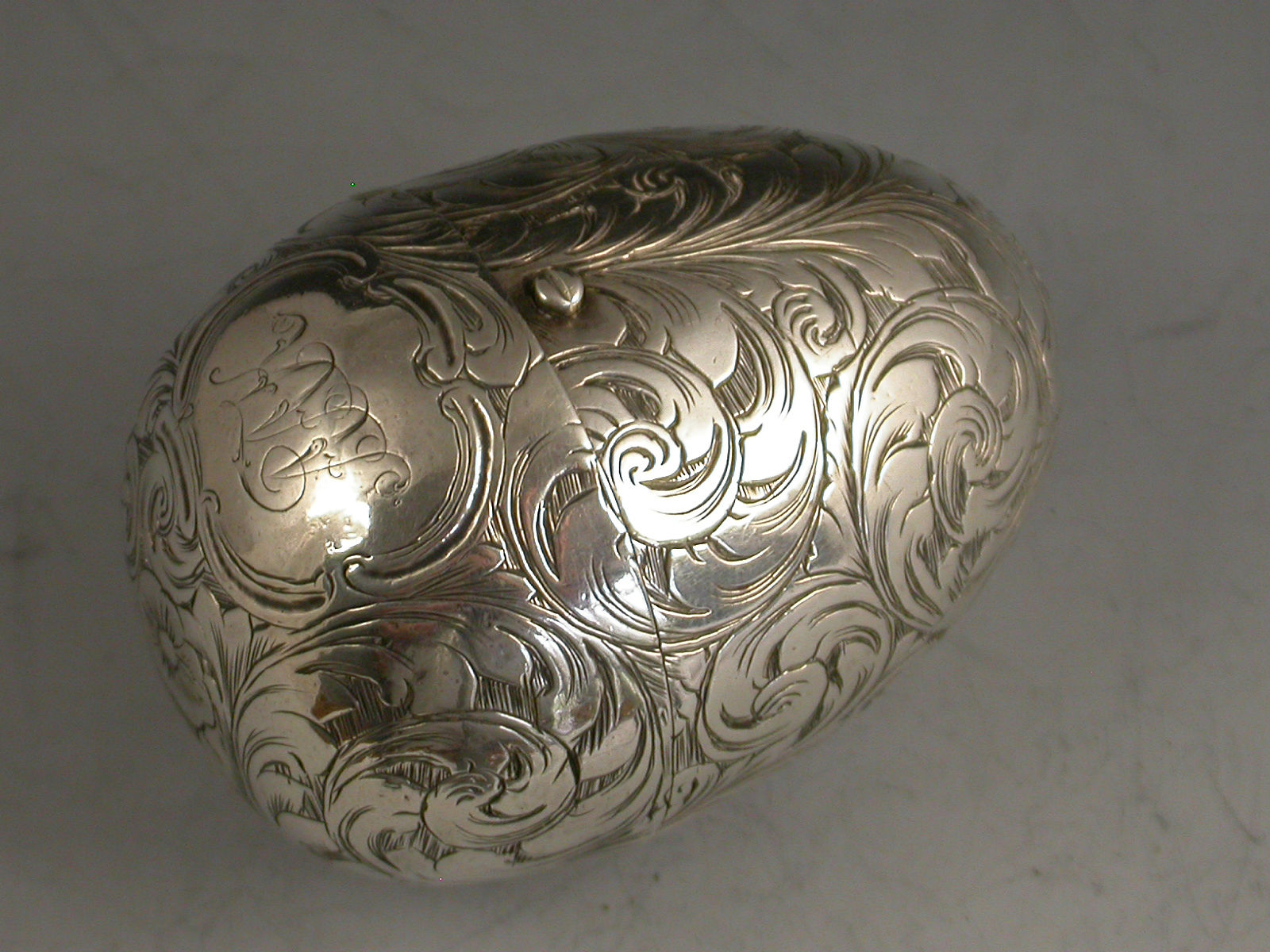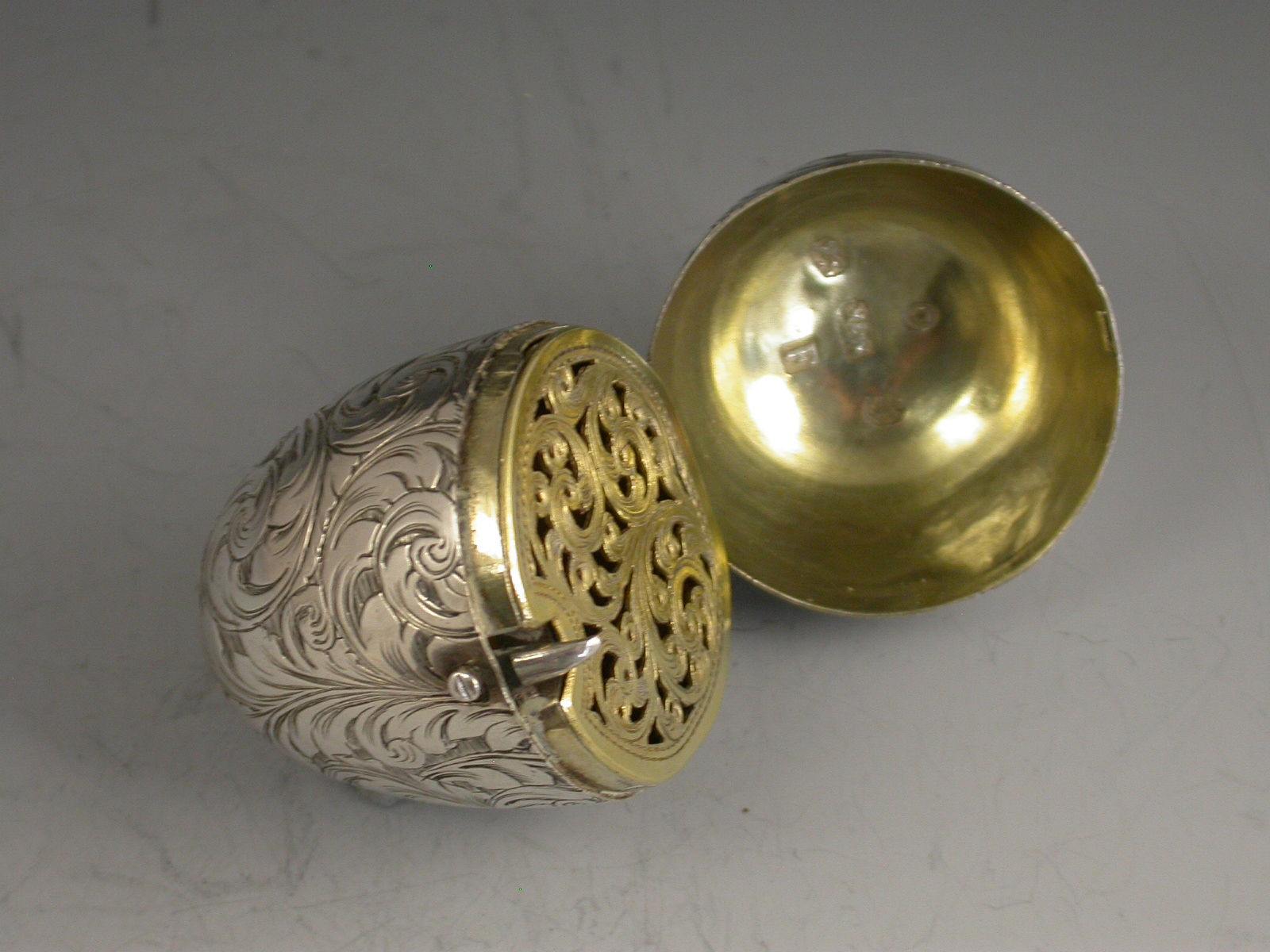 A fine and unusual Victorian silver Vinaigrette made in the form of an Egg, finely engraved with foliate scroll decoration and a cartouche engraved with contemporary initials, with unusual sprung push-button opening mechanism revealing the silver gilt interior with finely pierced foliate scroll grille.