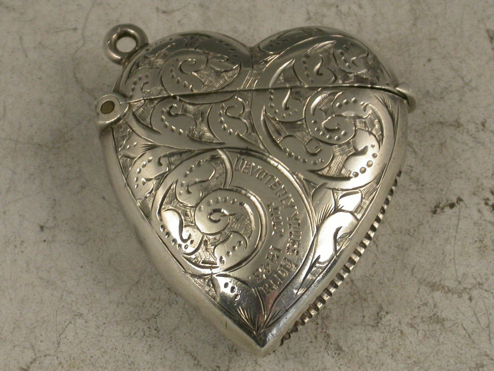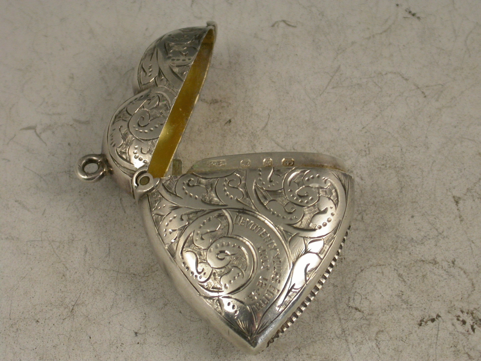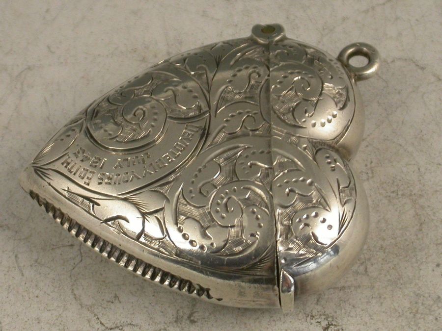 A good Victorian silver Vesta Case of heart shape with hinged flip top lid, engraved with foliate scroll decoration to each side. A panel engraved with the message ""Devotedly Yours Edith July 1943"", appropriate to the love heart. Silver gilt interior.