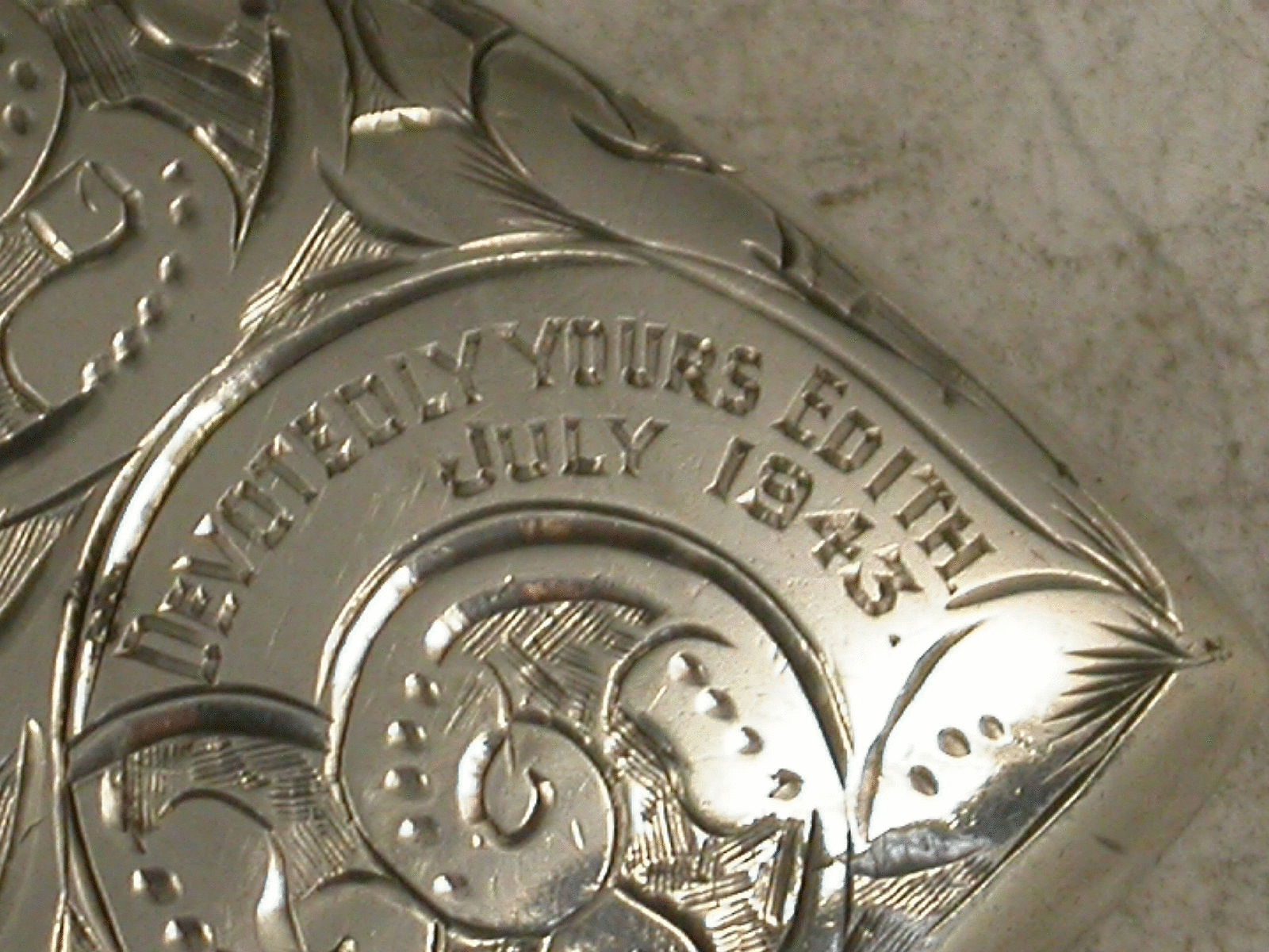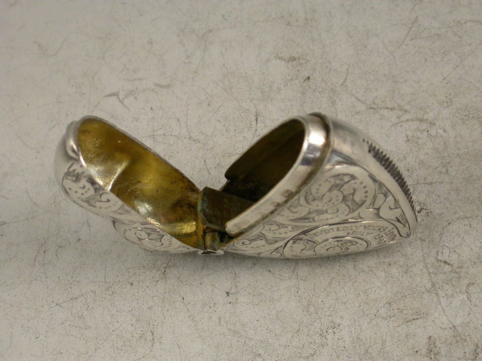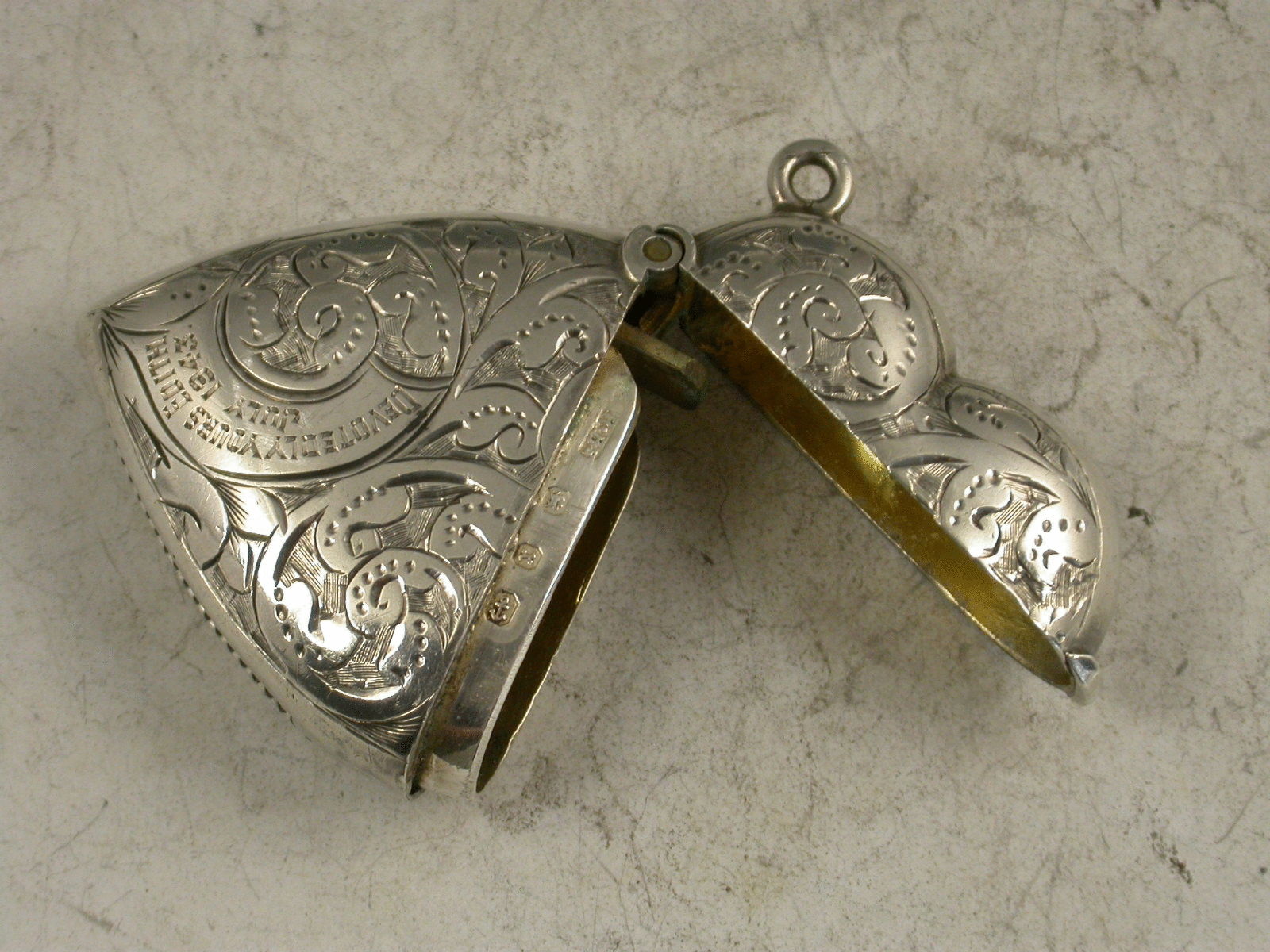 A good Victorian silver Vesta Case of heart shape with hinged flip top lid, engraved with foliate scroll decoration to each side. A panel engraved with the message ""Devotedly Yours Edith July 1943"", appropriate to the love heart. Silver gilt interior.