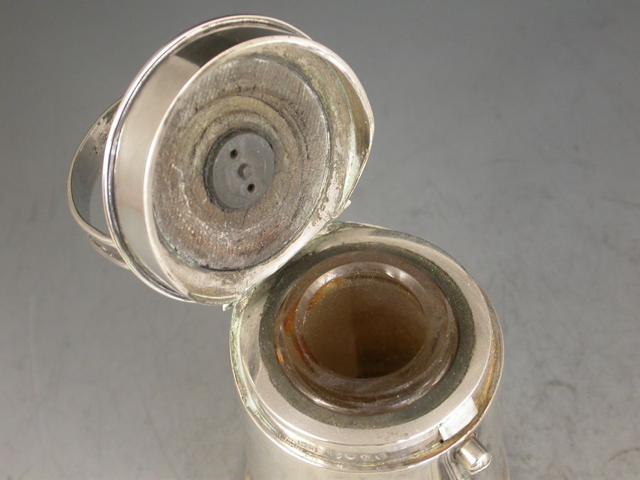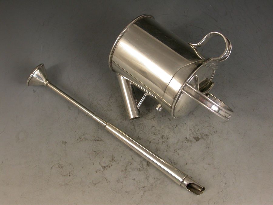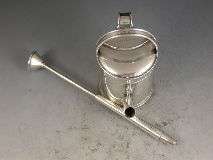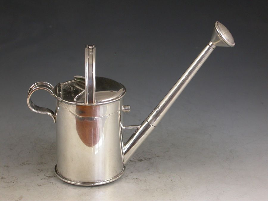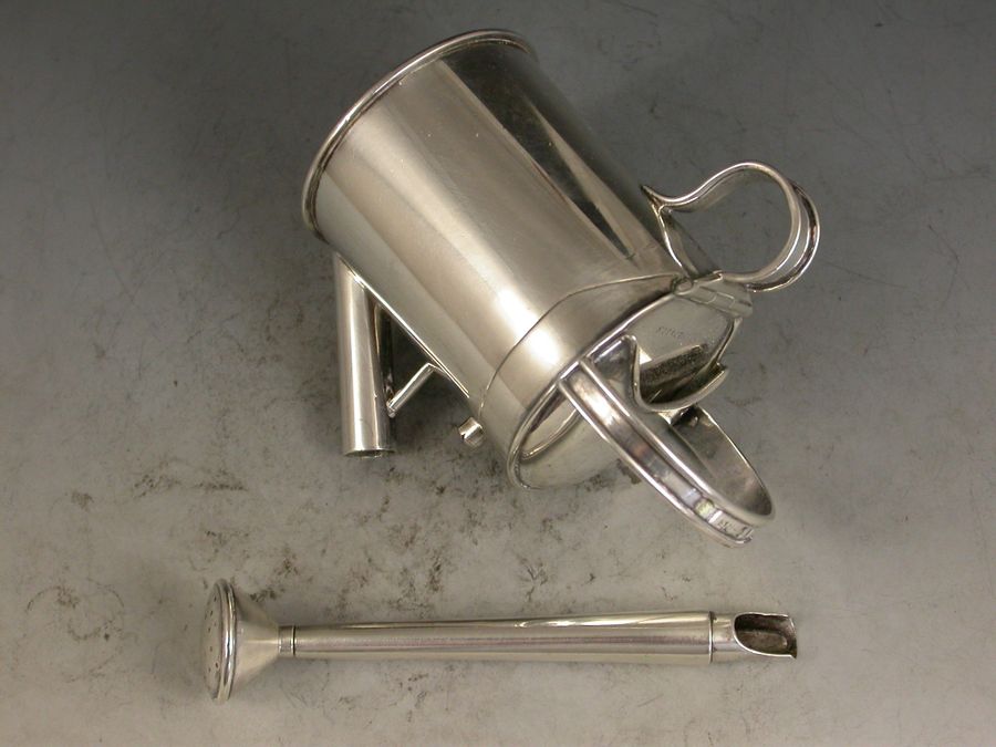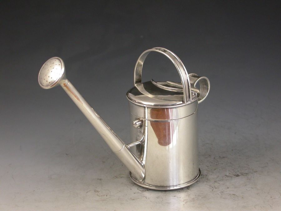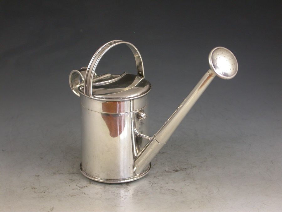 An outstanding Victorian novelty silver Inkwell with integral Dip Pen, made in the form of a Watering Can and of a registered design, the sprung hinged cover with compartment to take stamps or seals and opening to reveal a glass lined inkwell. The spout and rose spray forming a dip pen with extendable shaft.