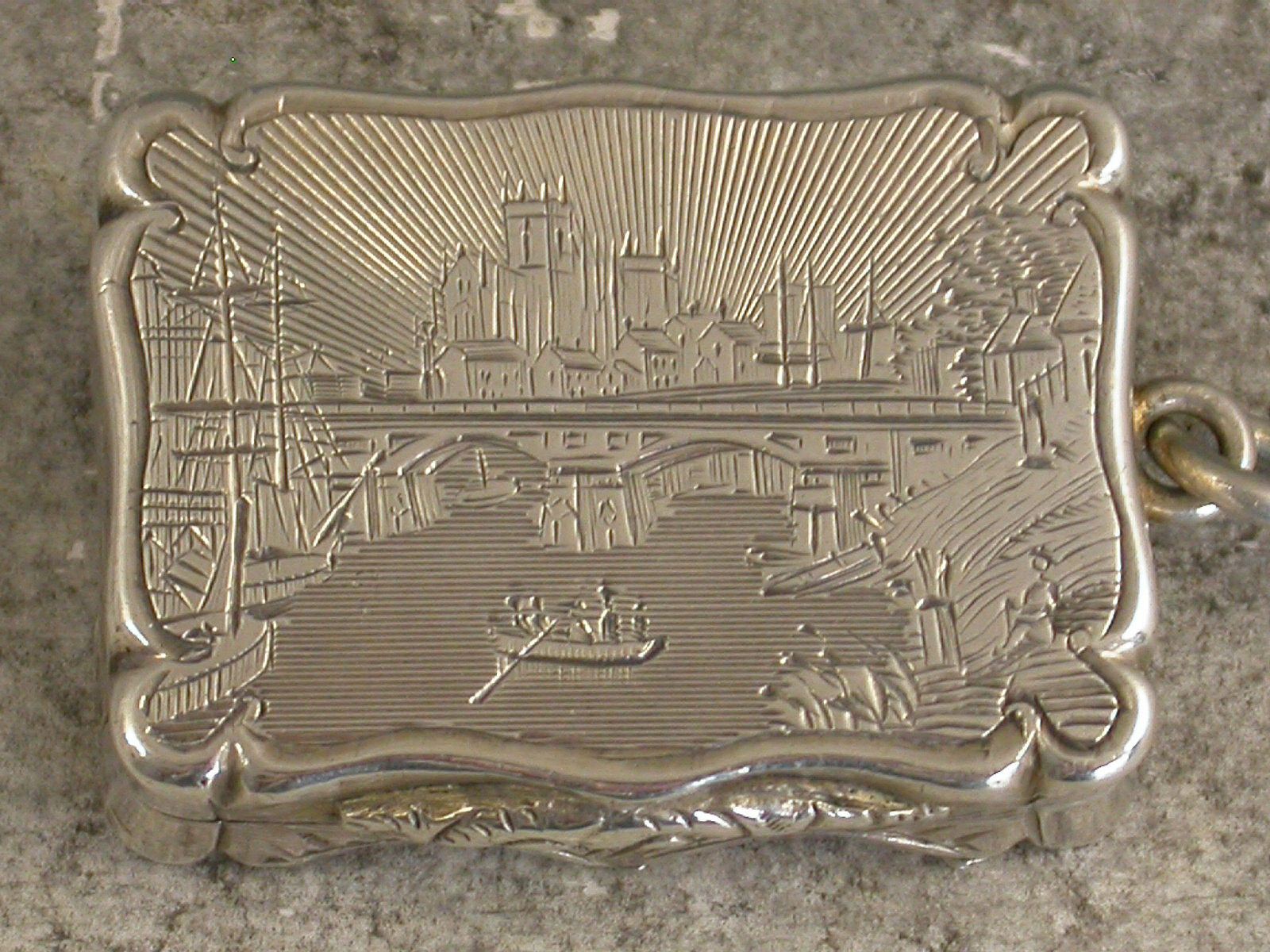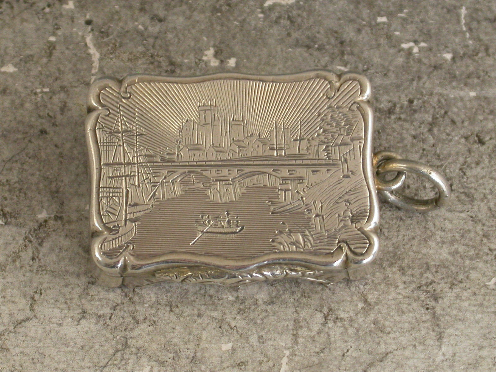An extremely rare Victorian silver Vinaigrette of shaped rectangular form, the base with engraved tartan decoration surrounding a vacant cartouche, the lid engraved with a scene depicting Selby Bridge in Yorkshire with boats in the foreground, a steam train crossing the bridge and Selby Abbey in the background. Attached suspension ring.