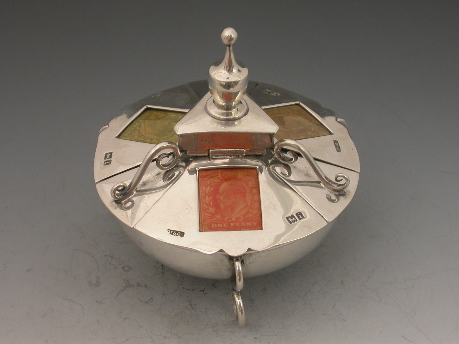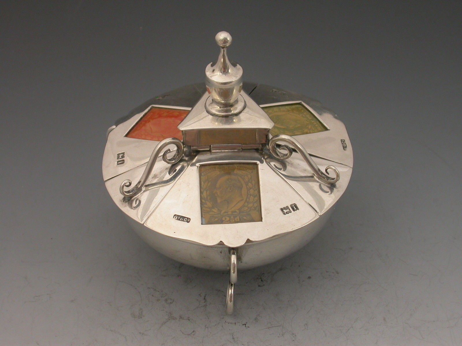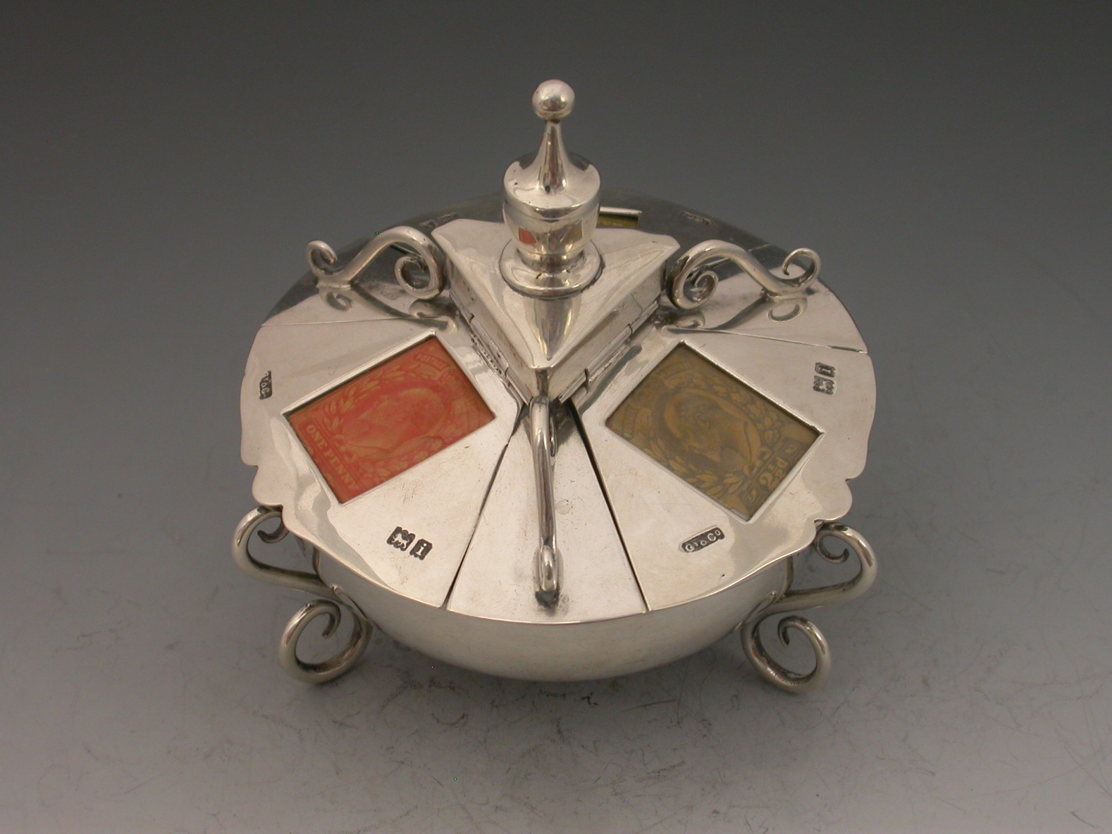 An extremely rare Victorian large silver triple Stamp Box of shaped circular form with urn finial and three sprung lids with glass apertures concealing stamps divided by wire work scrolls, the dished base on three scroll feet, silver gilt interior.