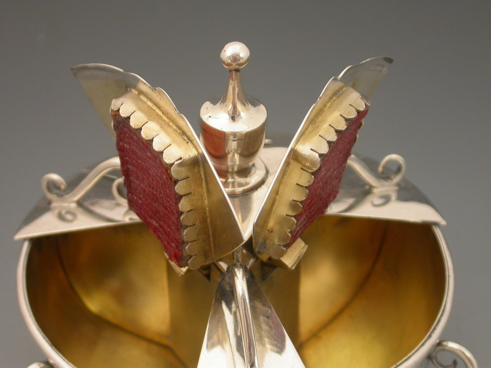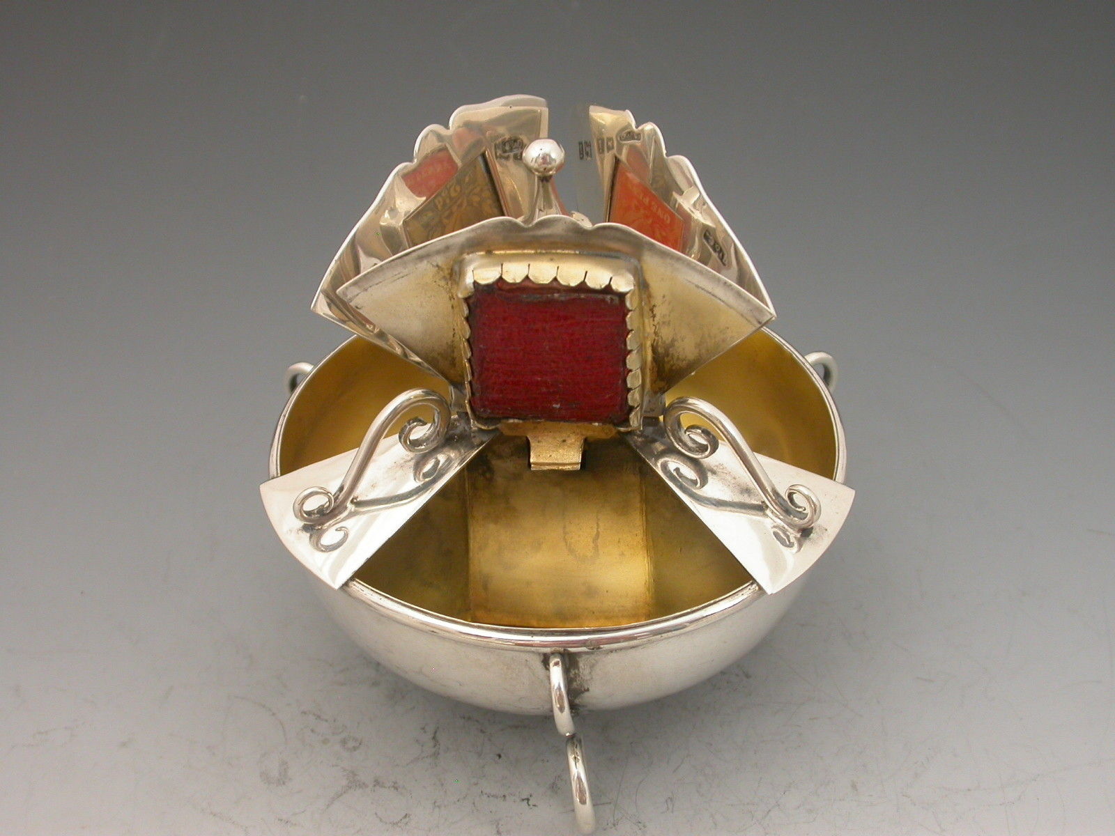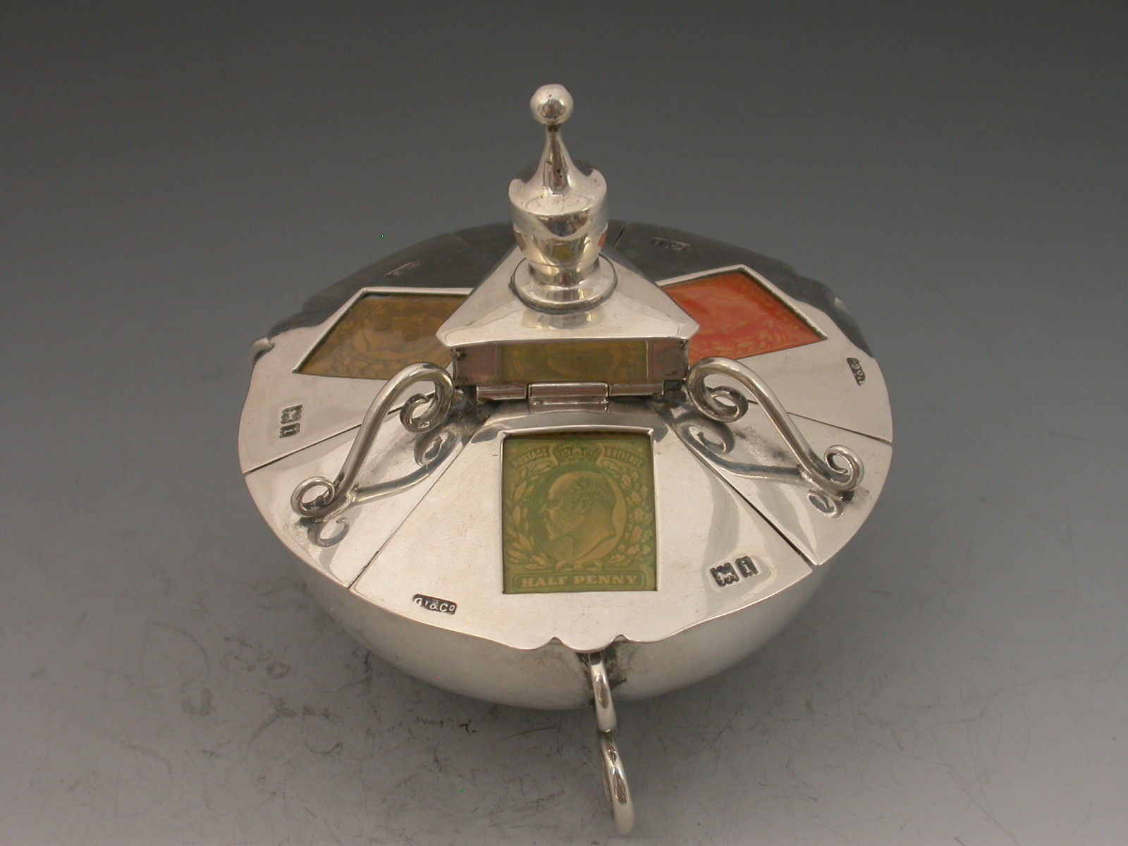 An extremely rare Victorian large silver triple Stamp Box of shaped circular form with urn finial and three sprung lids with glass apertures concealing stamps divided by wire work scrolls, the dished base on three scroll feet, silver gilt interior.