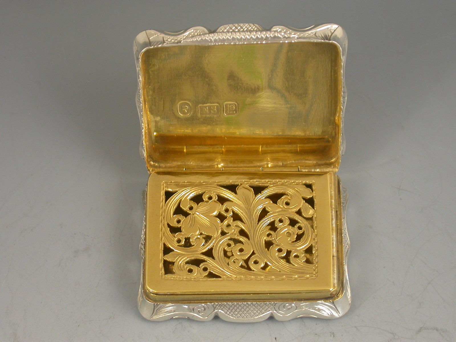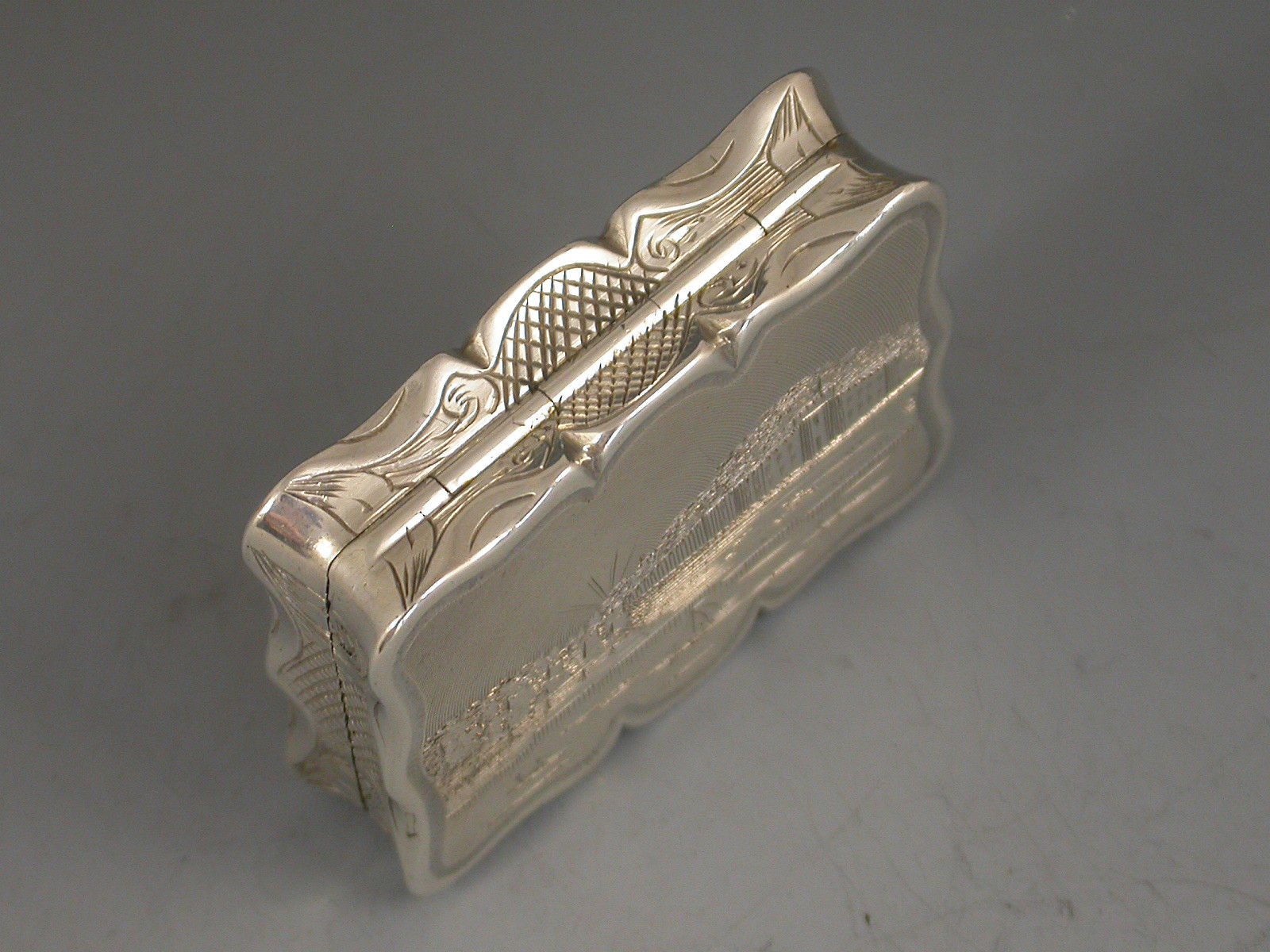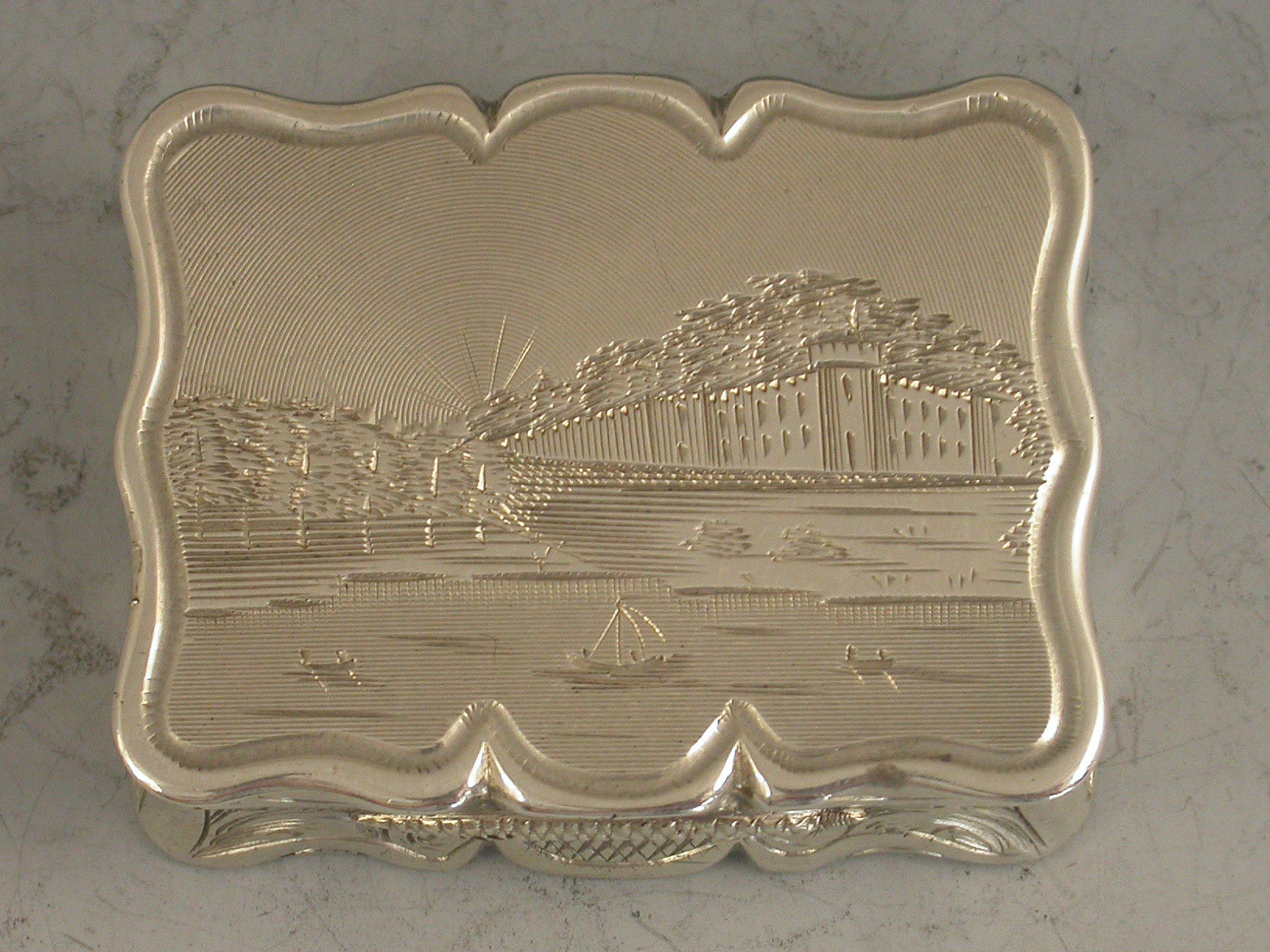A rare Victorian silver Vinaigrette of shaped rectangular form, the base engraved with scrolls and a cartouche with presentation inscription, the lid engraved with a scene depicting an unidentified castle or stately home with a lake in the foreground. Silver gilt interior with pierced hinged grille.