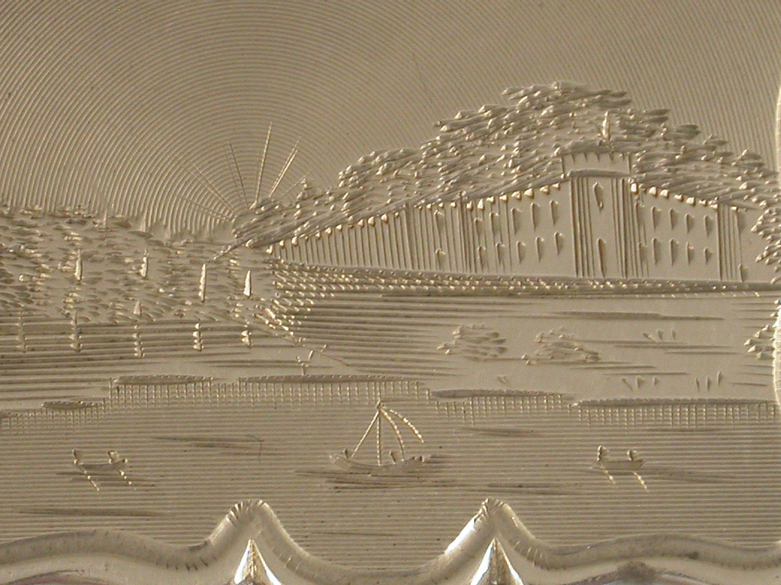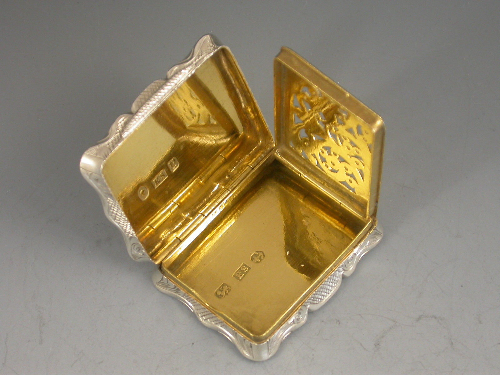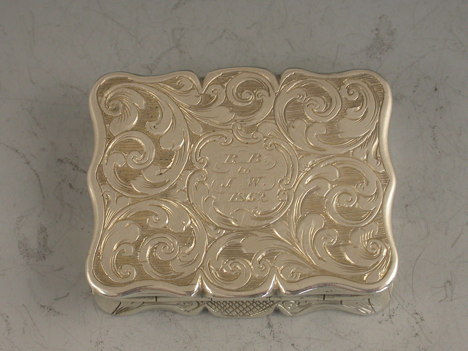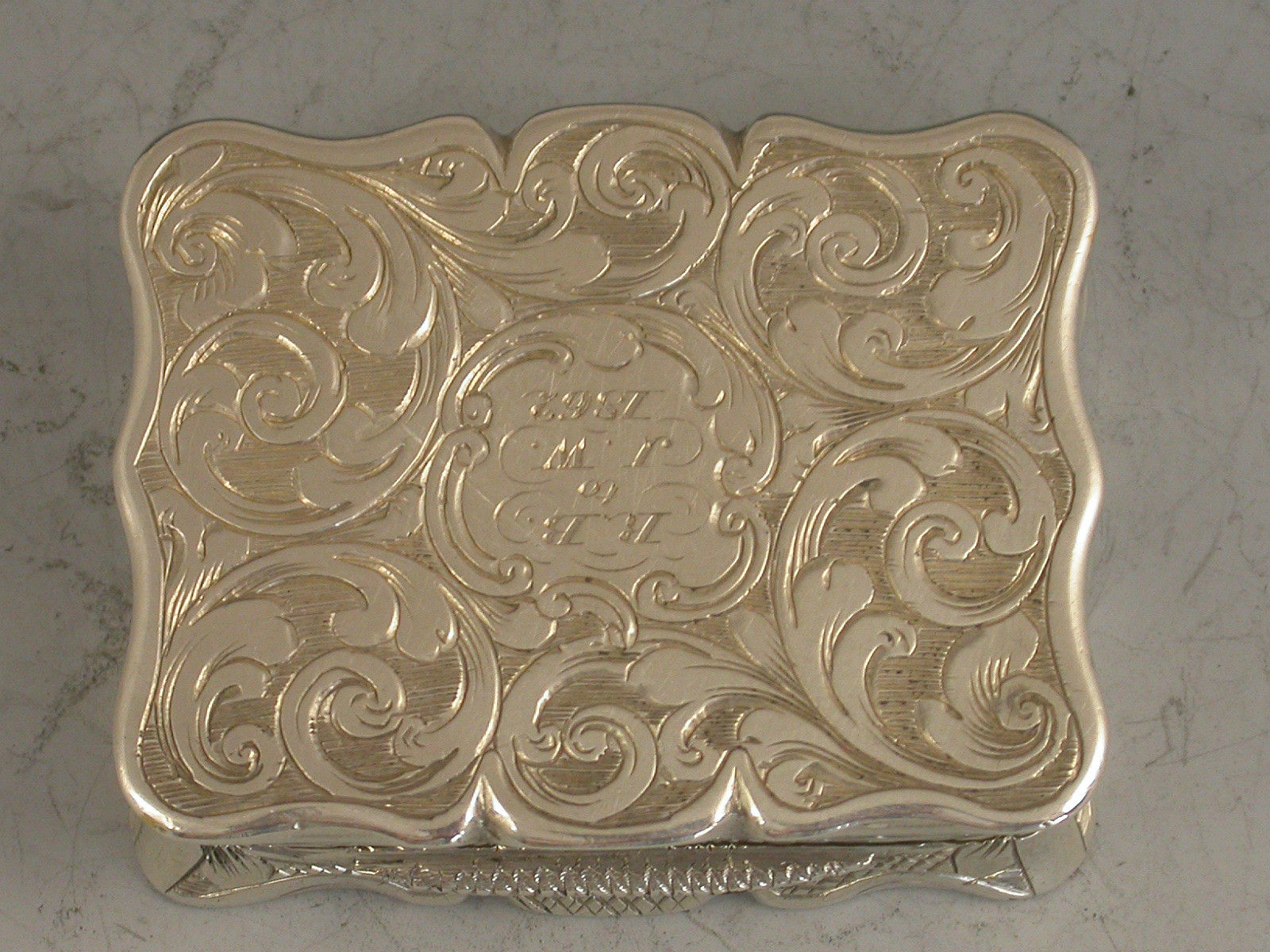 A rare Victorian silver Vinaigrette of shaped rectangular form, the base engraved with scrolls and a cartouche with presentation inscription, the lid engraved with a scene depicting an unidentified castle or stately home with a lake in the foreground. Silver gilt interior with pierced hinged grille.