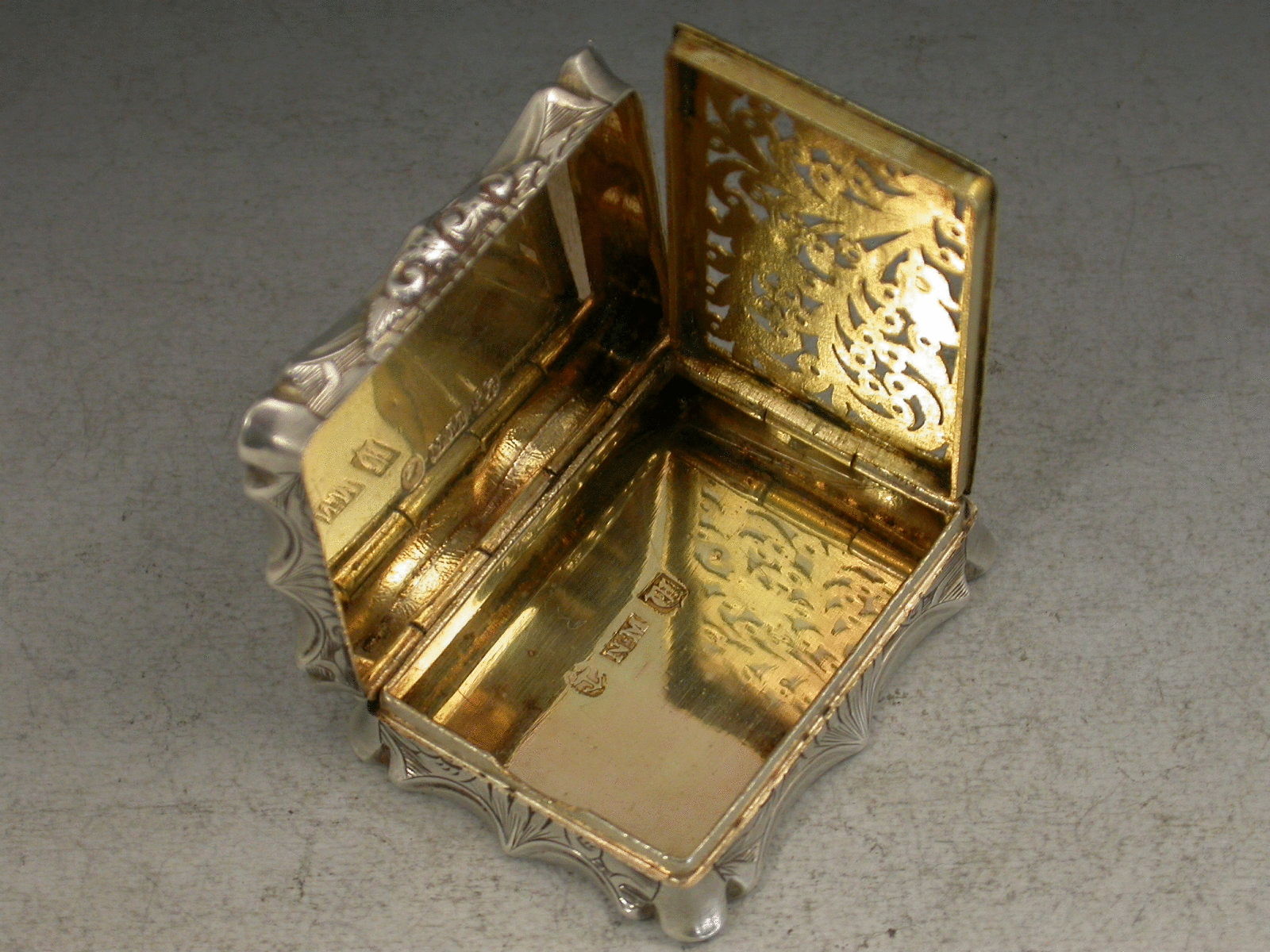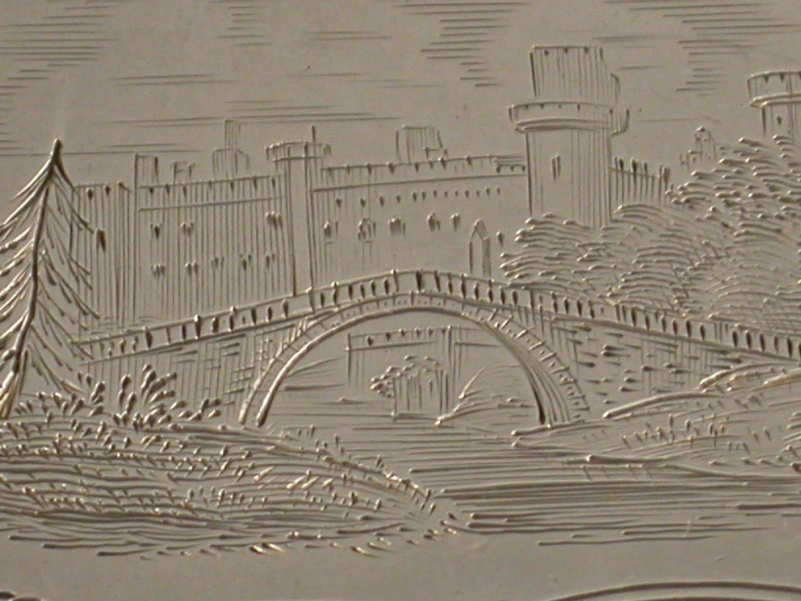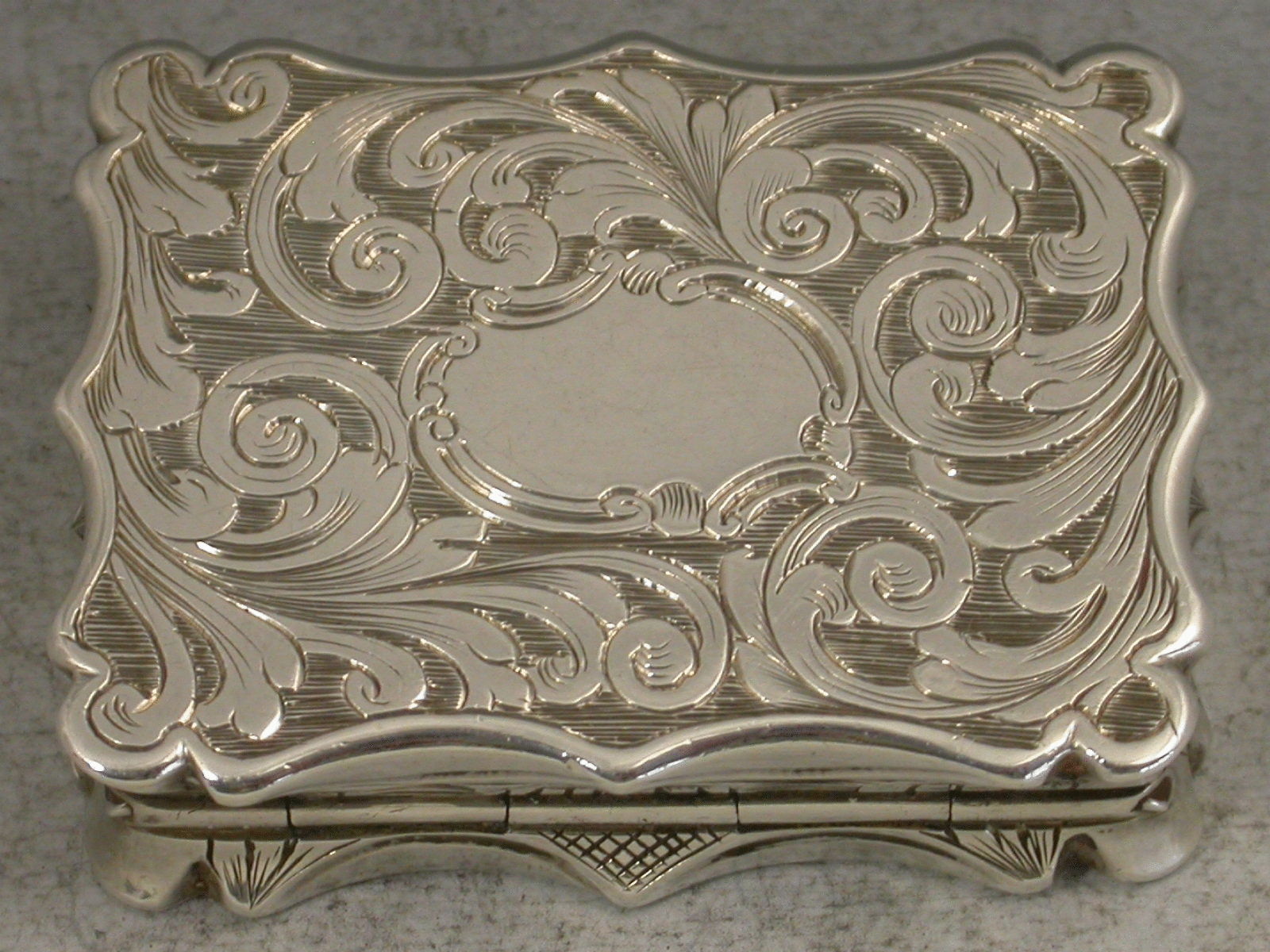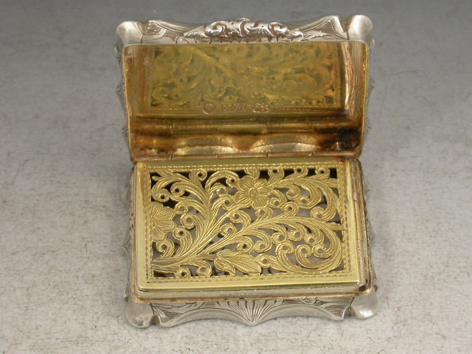 A rare Victorian silver Vinaigrette of shaped rectangular form with foliate scroll engraved decoration to the base and sides, the lid engraved with a scarce scene depicting Warwick Castle from the river Avon, a bridge in the foreground, the silver gilt interior with intricately pierced grille.
