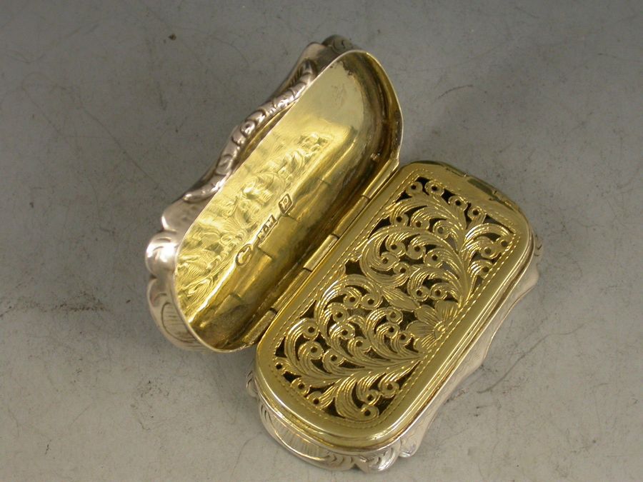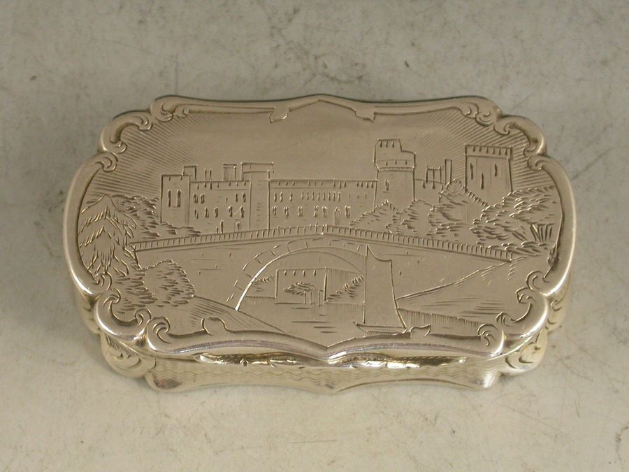 A rare Victorian silver Vinaigrette of rounded shaped rectangular form, the base with bands of engine turned decoration, the lid engraved with a rare view of Warwick Castle from the River Avon with a boat and a bridge in the foreground. The silver gilt interior with foliate scroll pierced grille.