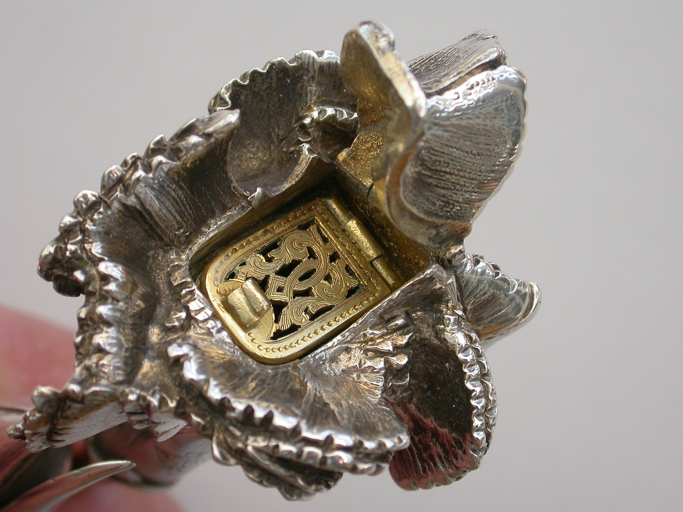 A large Victorian novelty silver Vinaigrette cast in the form of a Carnation flower and bud on a leafy stem, the centre of the flower opening to reveal a hinged silver gilt grille. Complete with original silk and velvet lined leather fitted case initialed ""FB"".