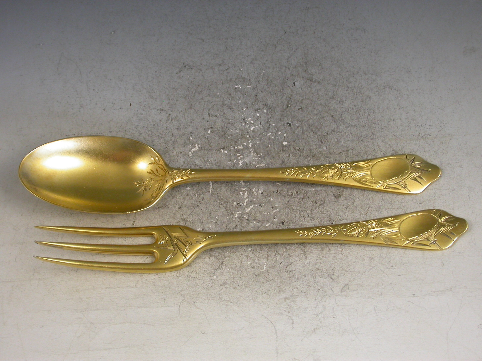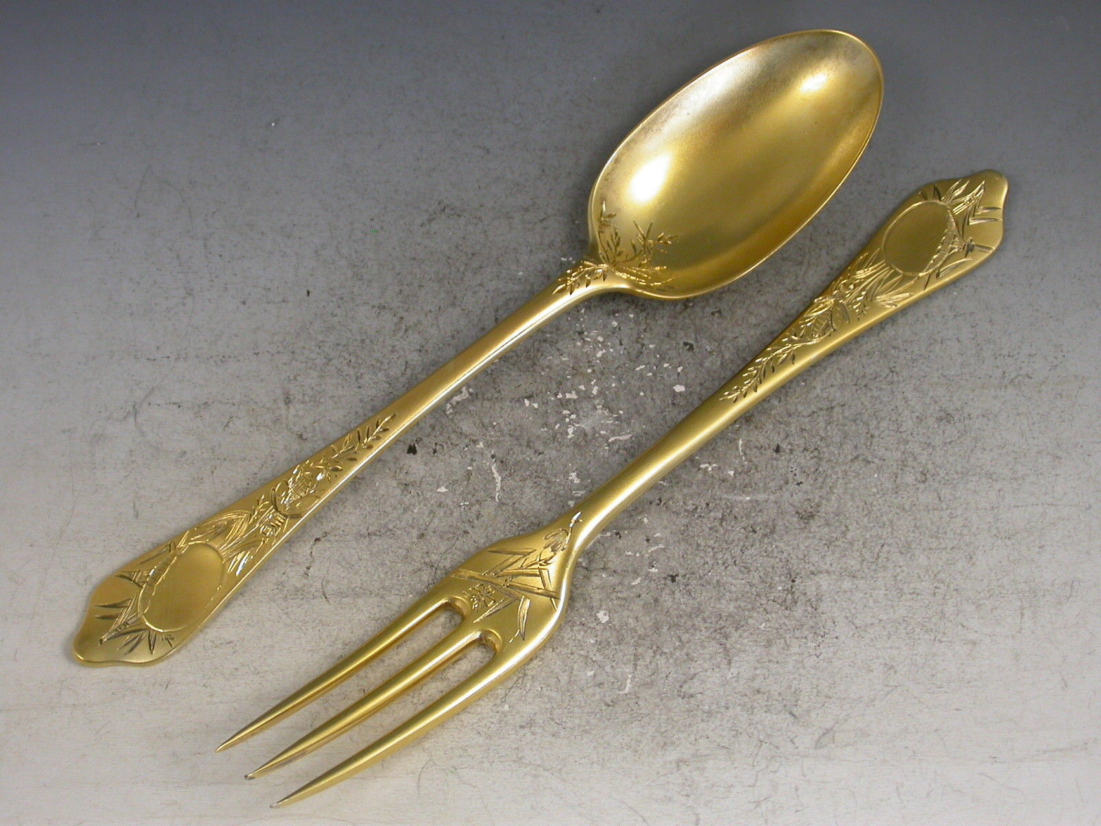 An extremely fine quality cased pair of Victorian silver gilt dognose pattern Christening Spoon and Fork with thick matt gilding and engraved with aesthetic style decoration including Oriental figures, birds and insects.