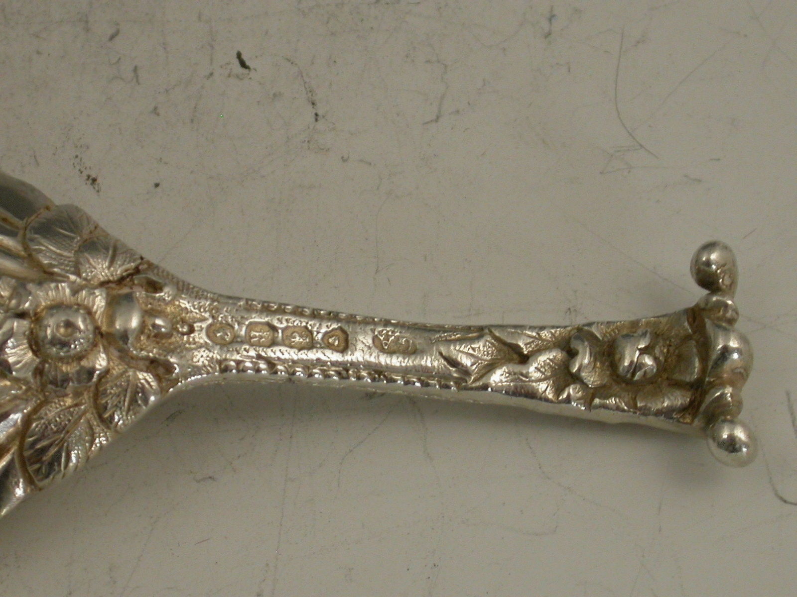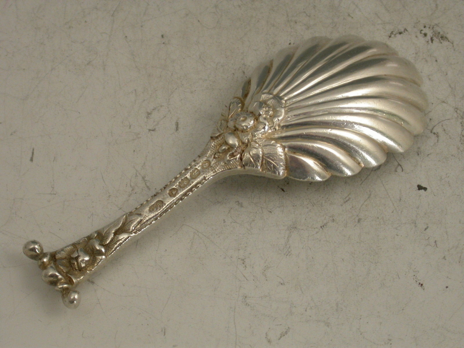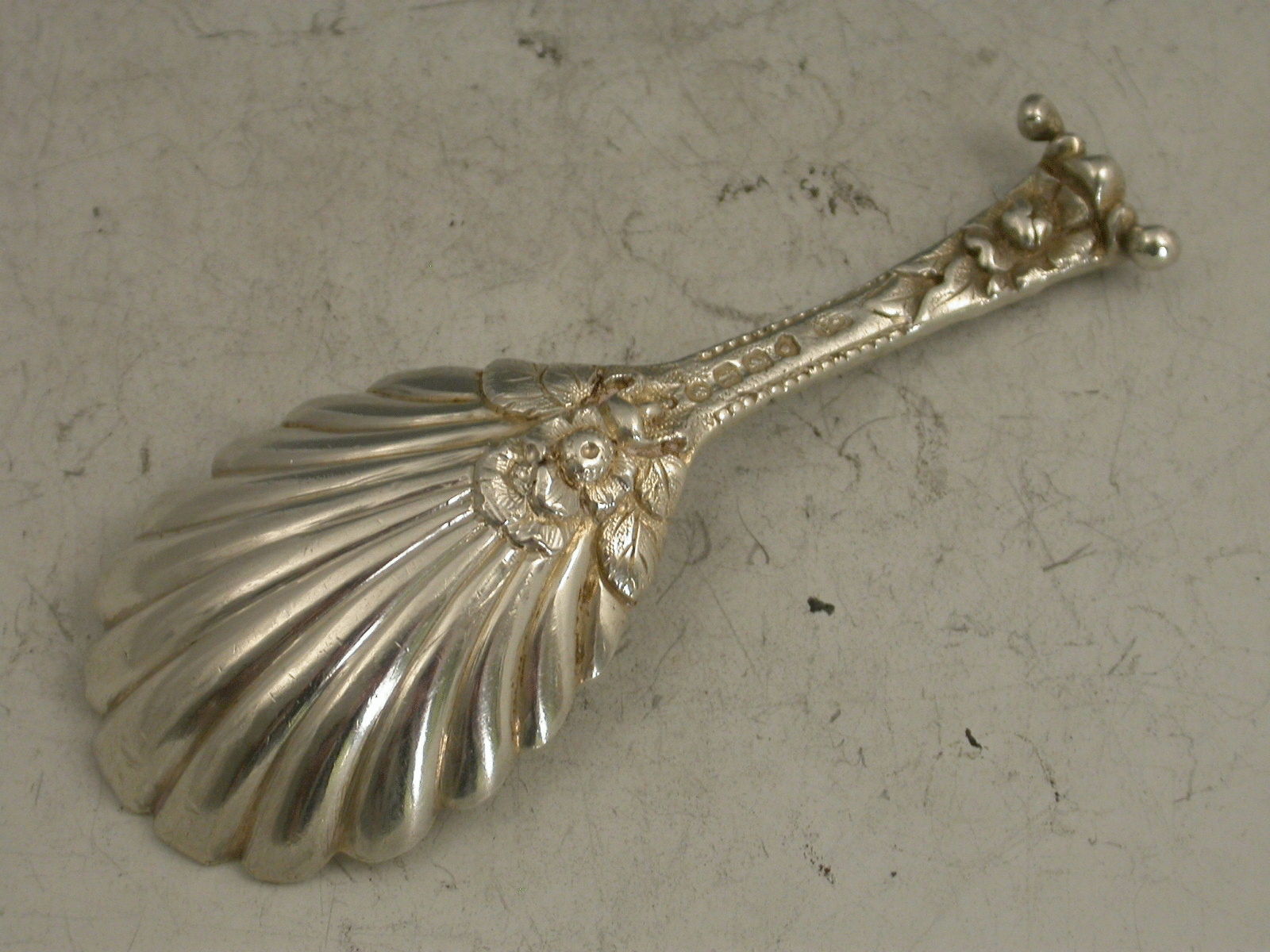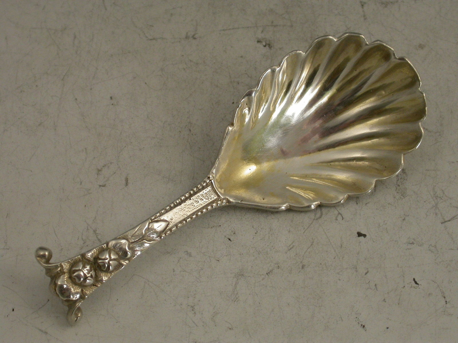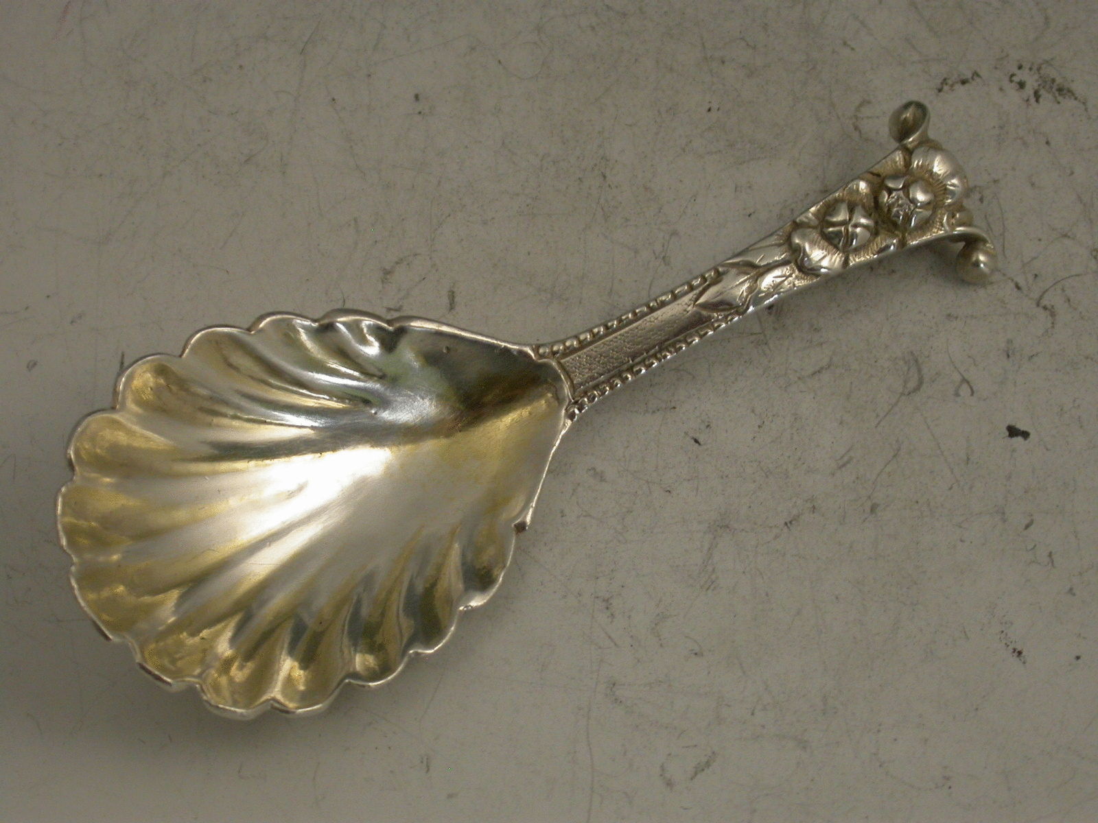 A good quality cast silver Caddy Spoon with oval fluted and gilded bowl, the bead edge Onslow type handle chased with flower heads and foliage.
