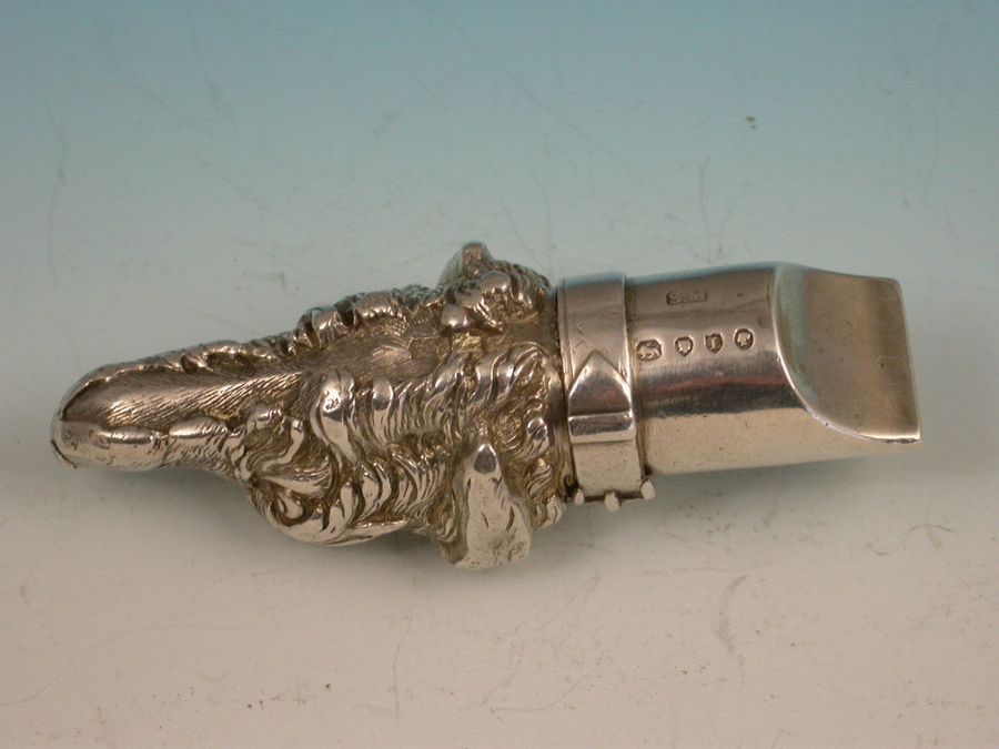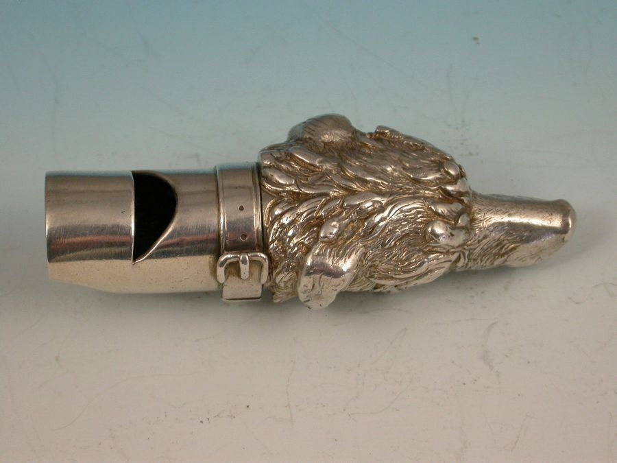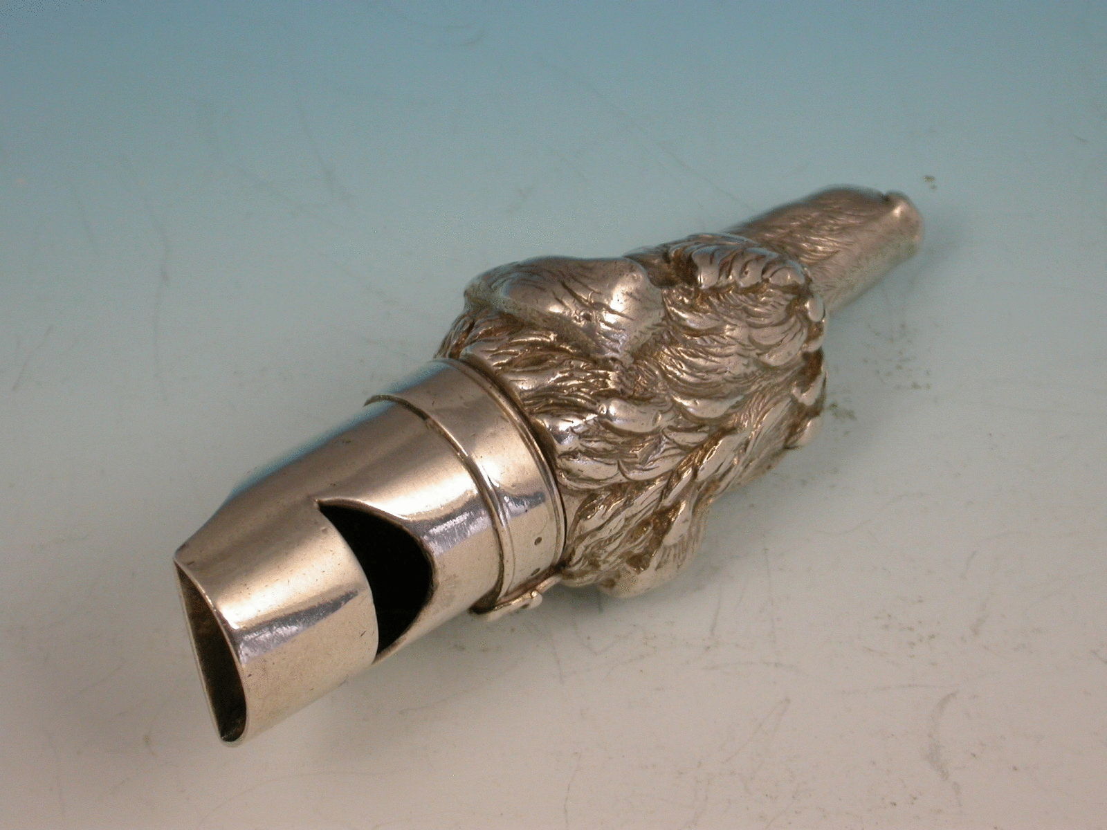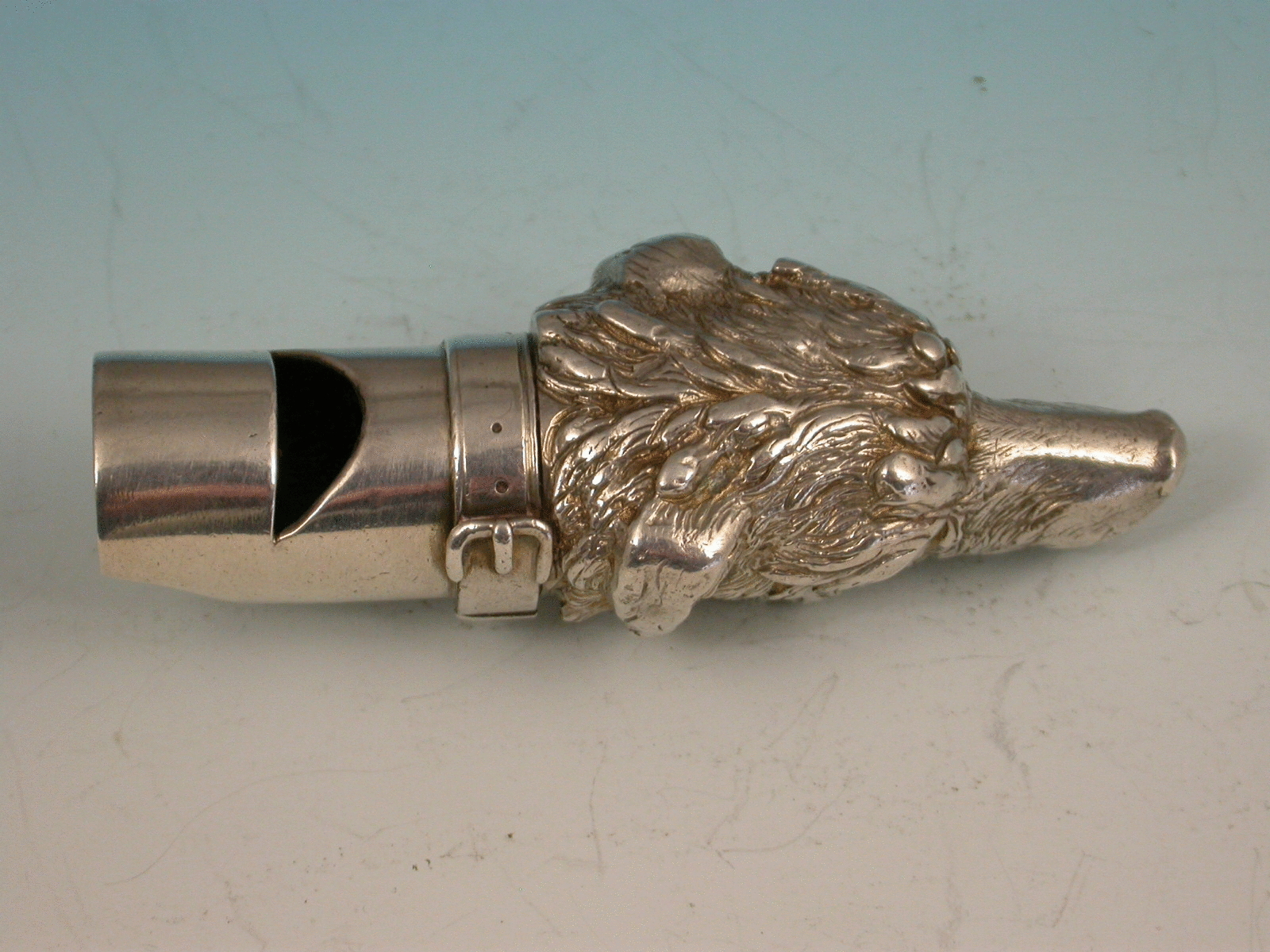 A very fine quality Victorian heavy cast silver Whistle, formed as the head of a Lurcher Dog.