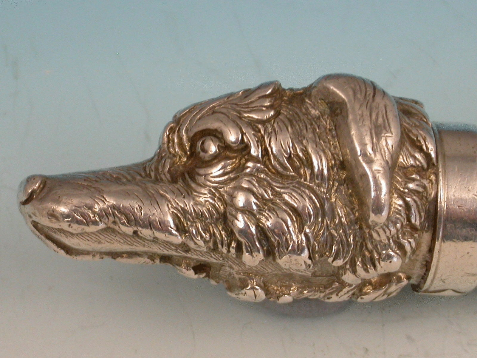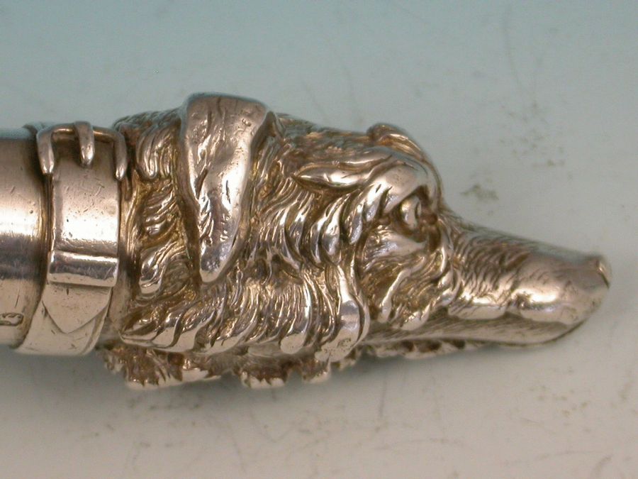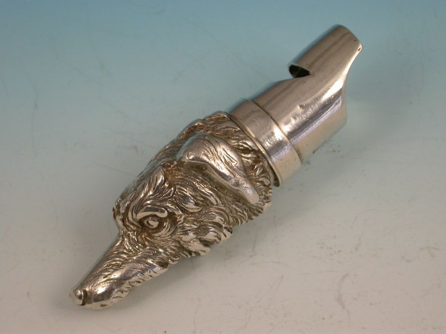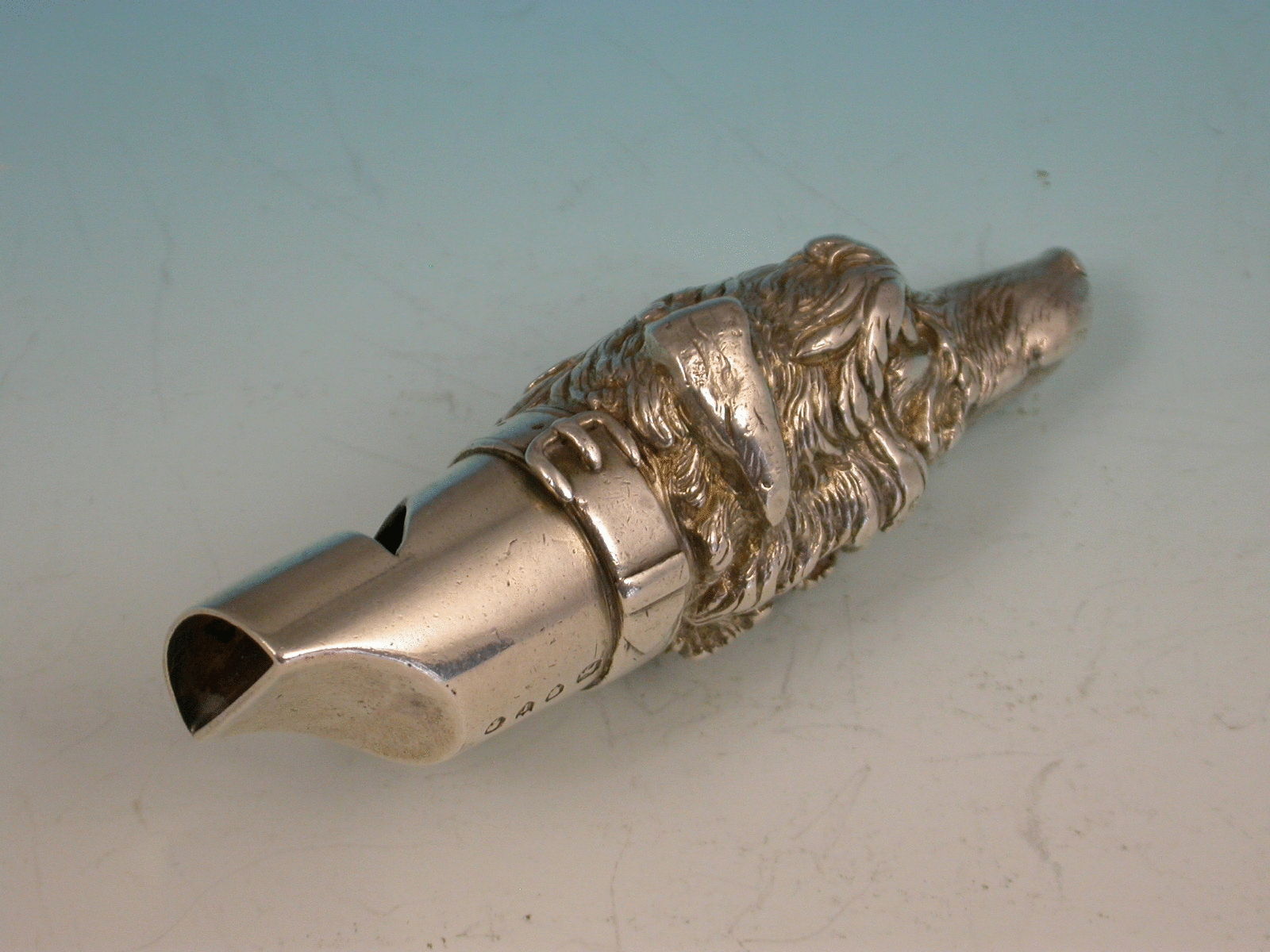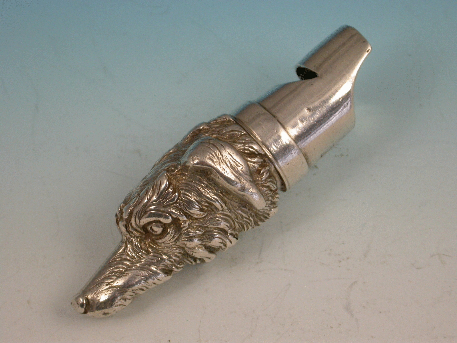 A very fine quality Victorian heavy cast silver Whistle, formed as the head of a Lurcher Dog.