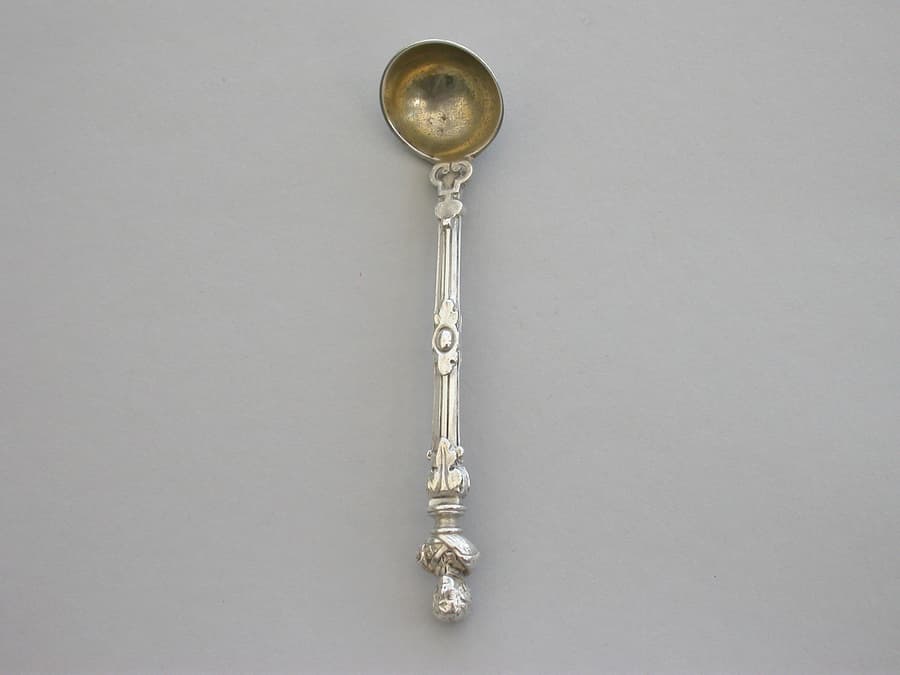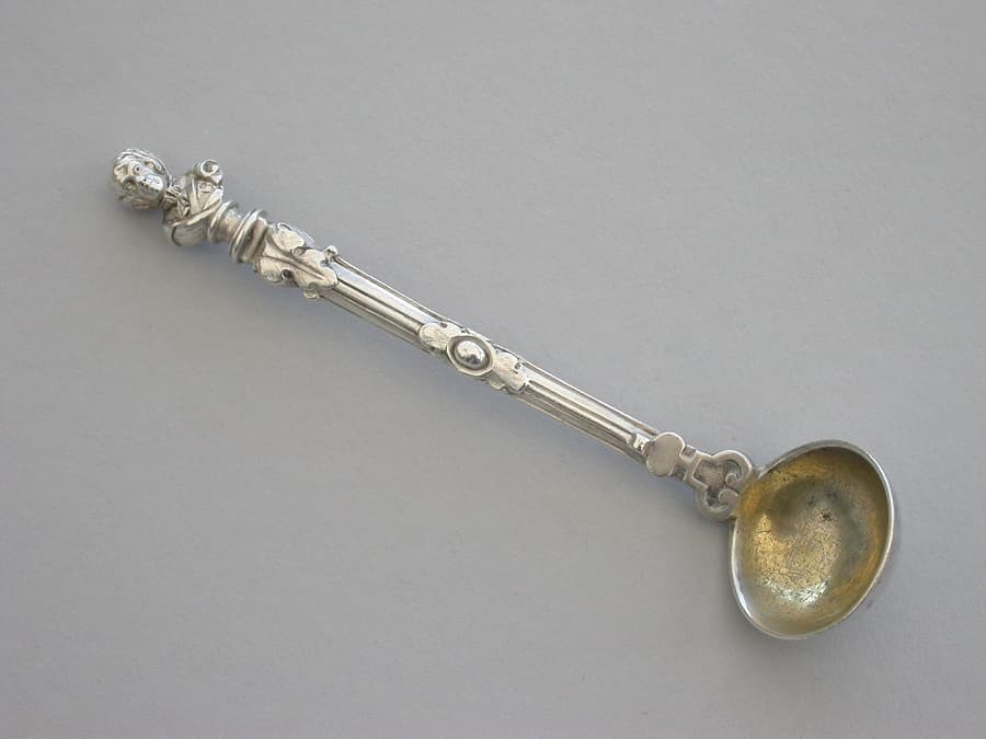 A good quality Victorian cast silver Salt Spoon with circular gilded bowl, the finial formed as a bust of The Duke of Wellington and made to commemorate his death in 1852.