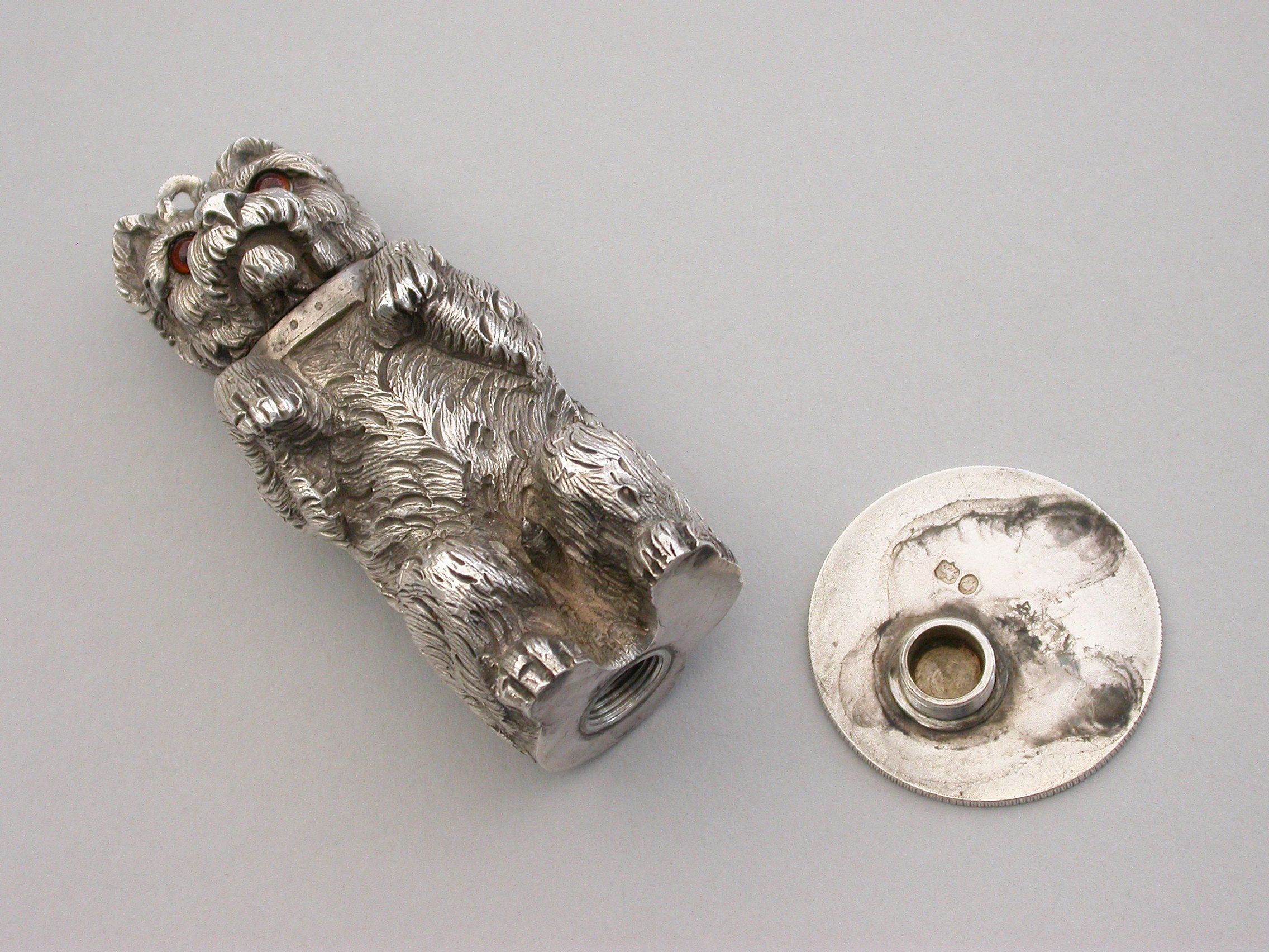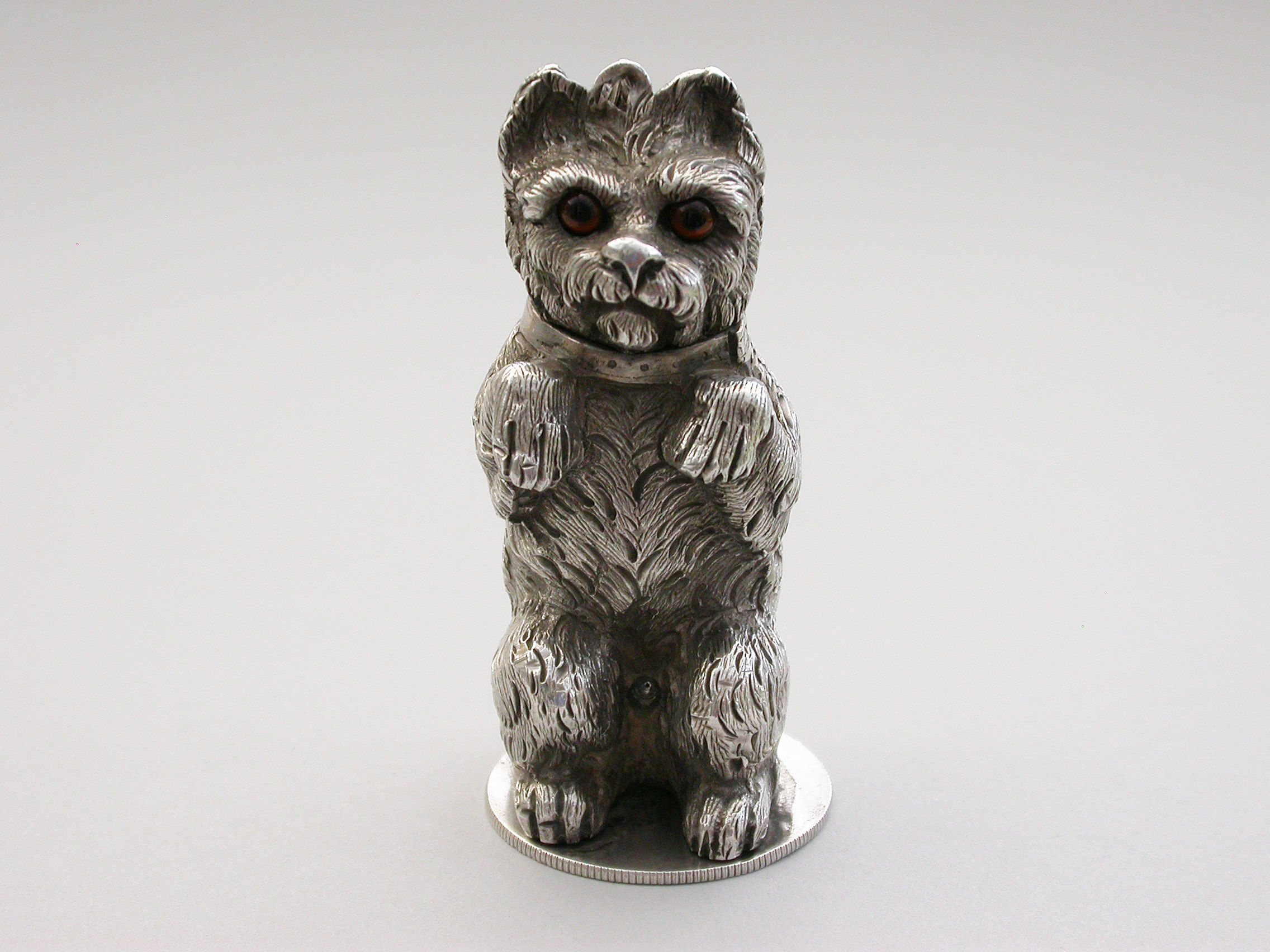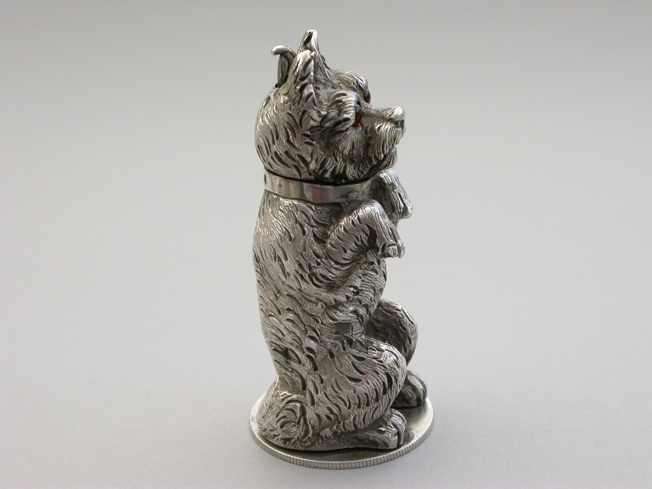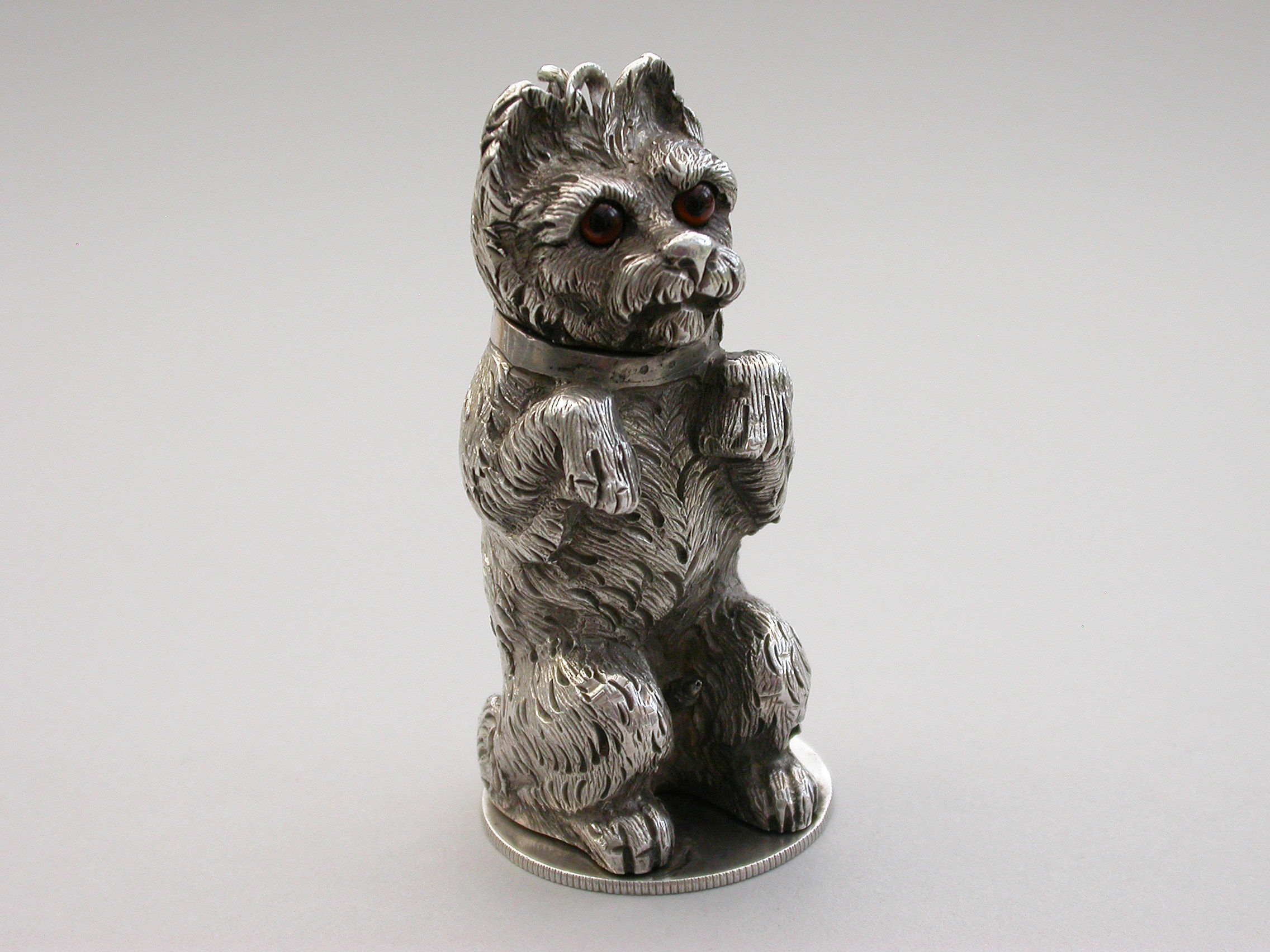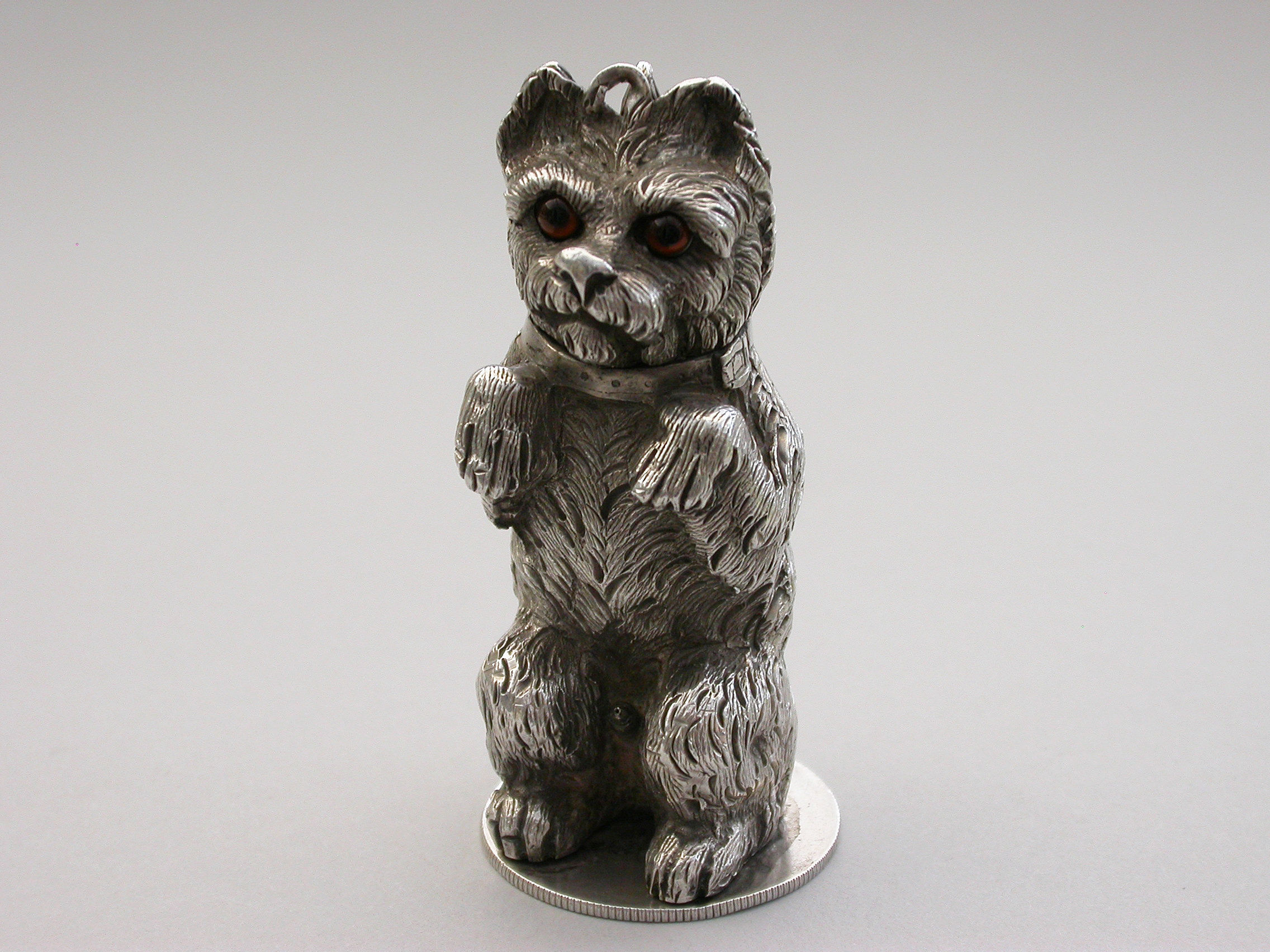An extremely rare Victorian cast silver novelty Scent Atomiser made in the form of an excited terrier, sitting up on his haunches in an appealing begging pose, with coloured glass eyes, a circular screw-off base and a button at the back of his head which, when depressed repeatedly, sprays scent, most imaginatively through the act of micturation (or peeing).