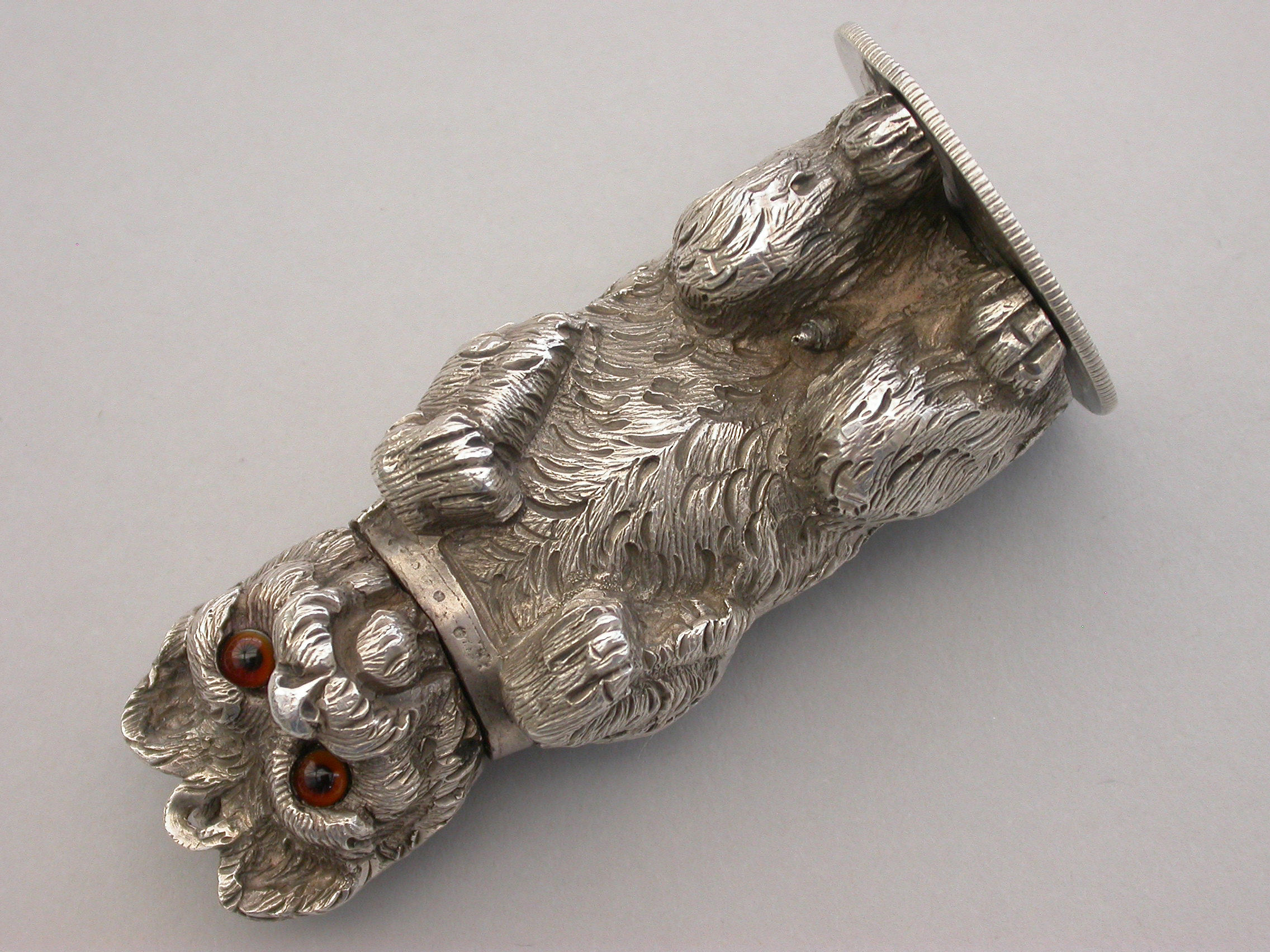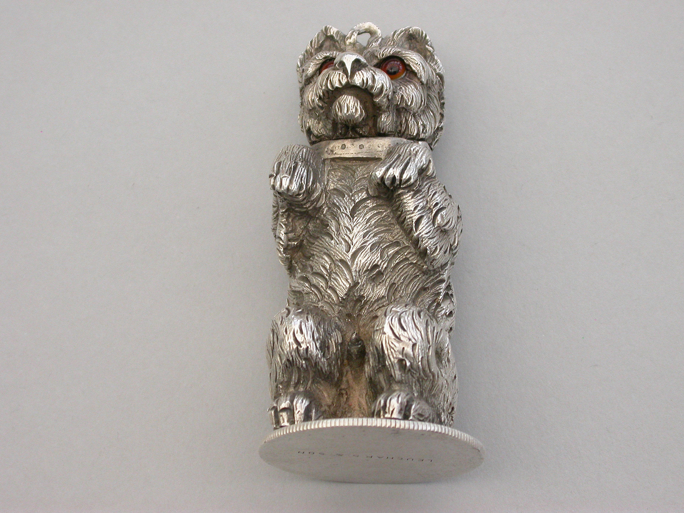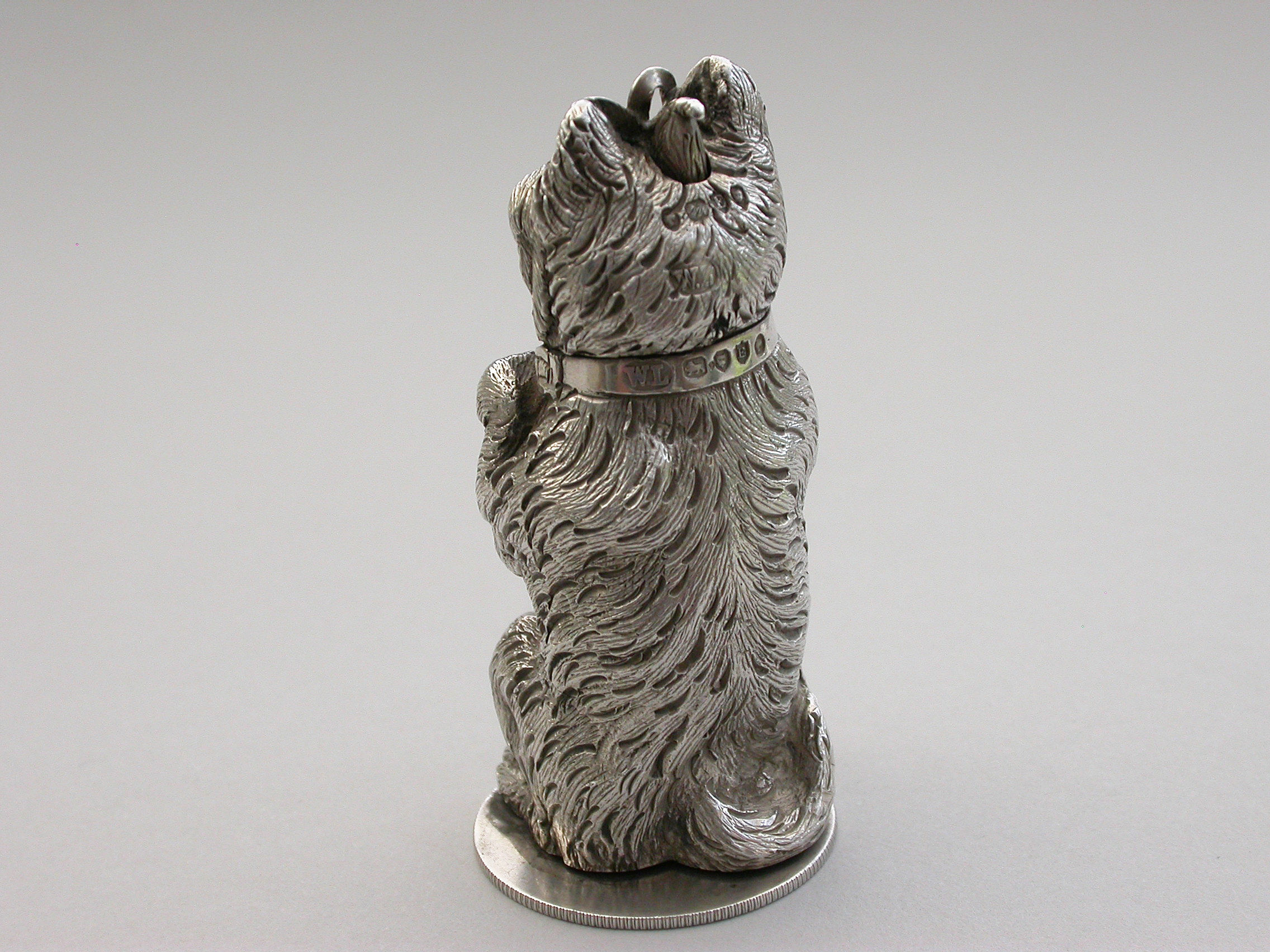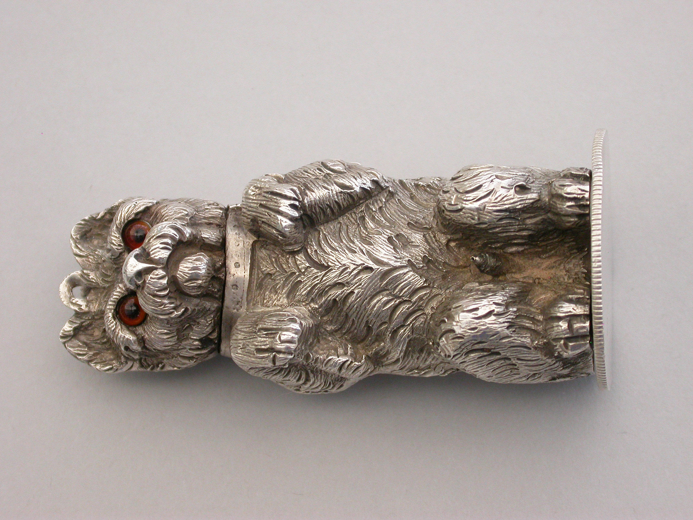 An extremely rare Victorian cast silver novelty Scent Atomiser made in the form of an excited terrier, sitting up on his haunches in an appealing begging pose, with coloured glass eyes, a circular screw-off base and a button at the back of his head which, when depressed repeatedly, sprays scent, most imaginatively through the act of micturation (or peeing).