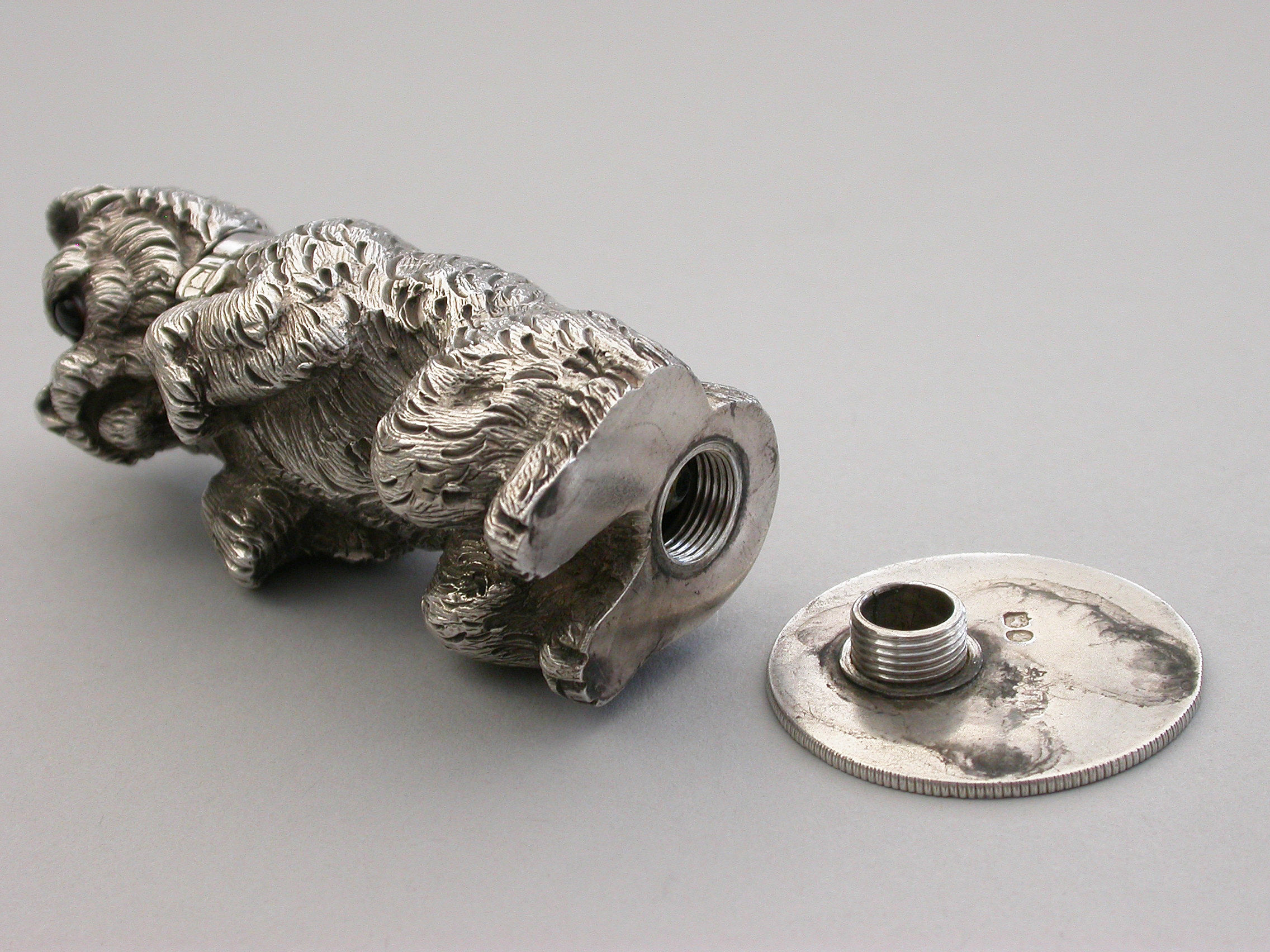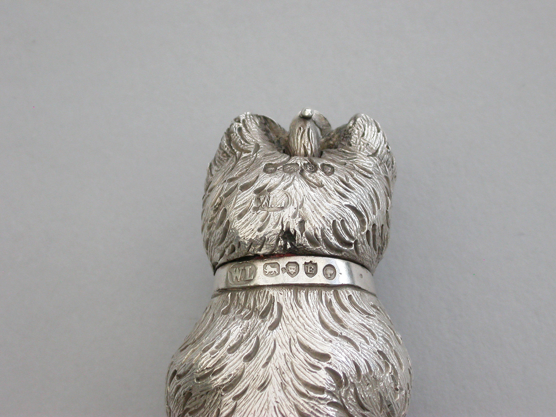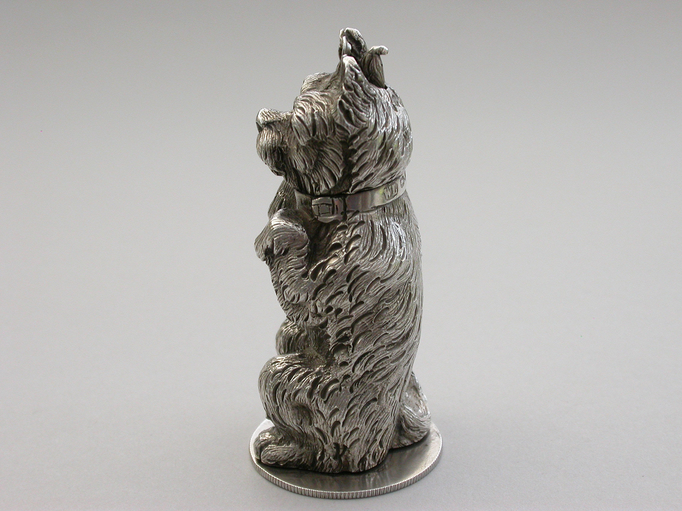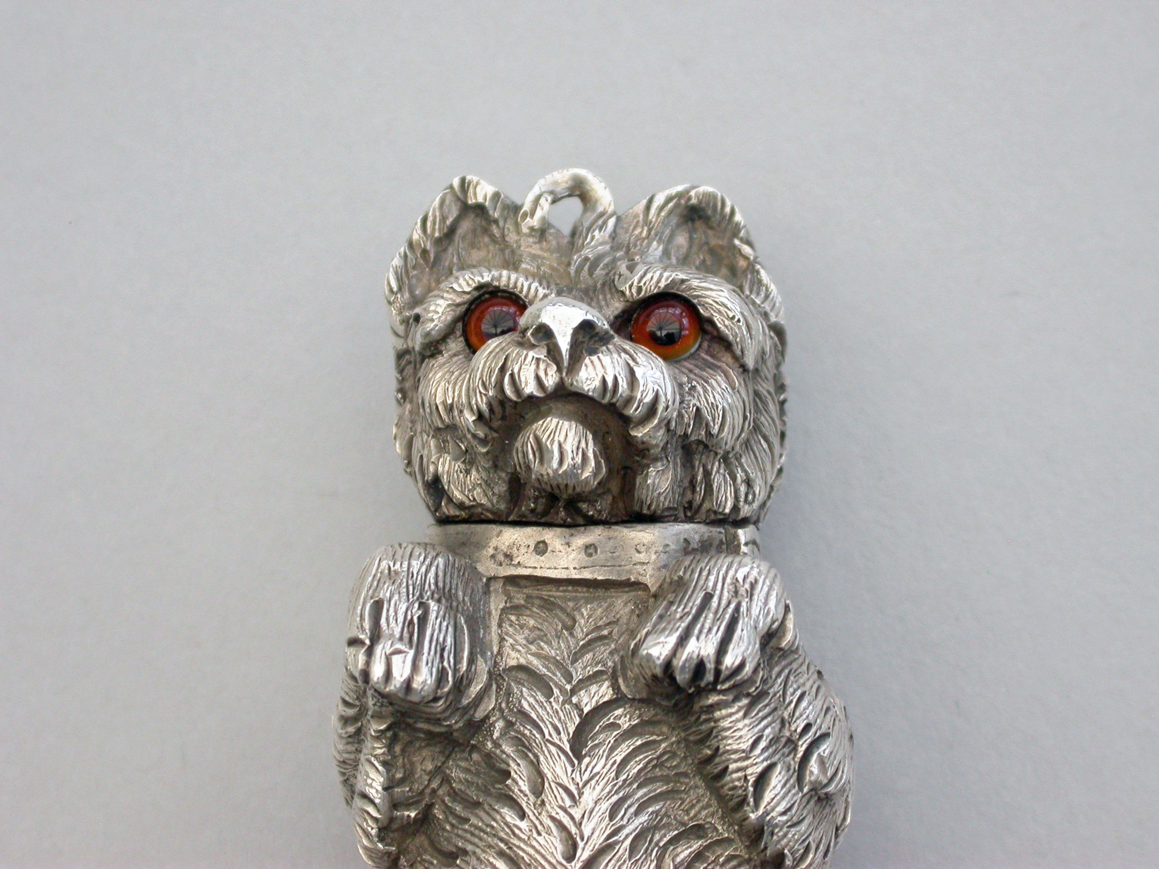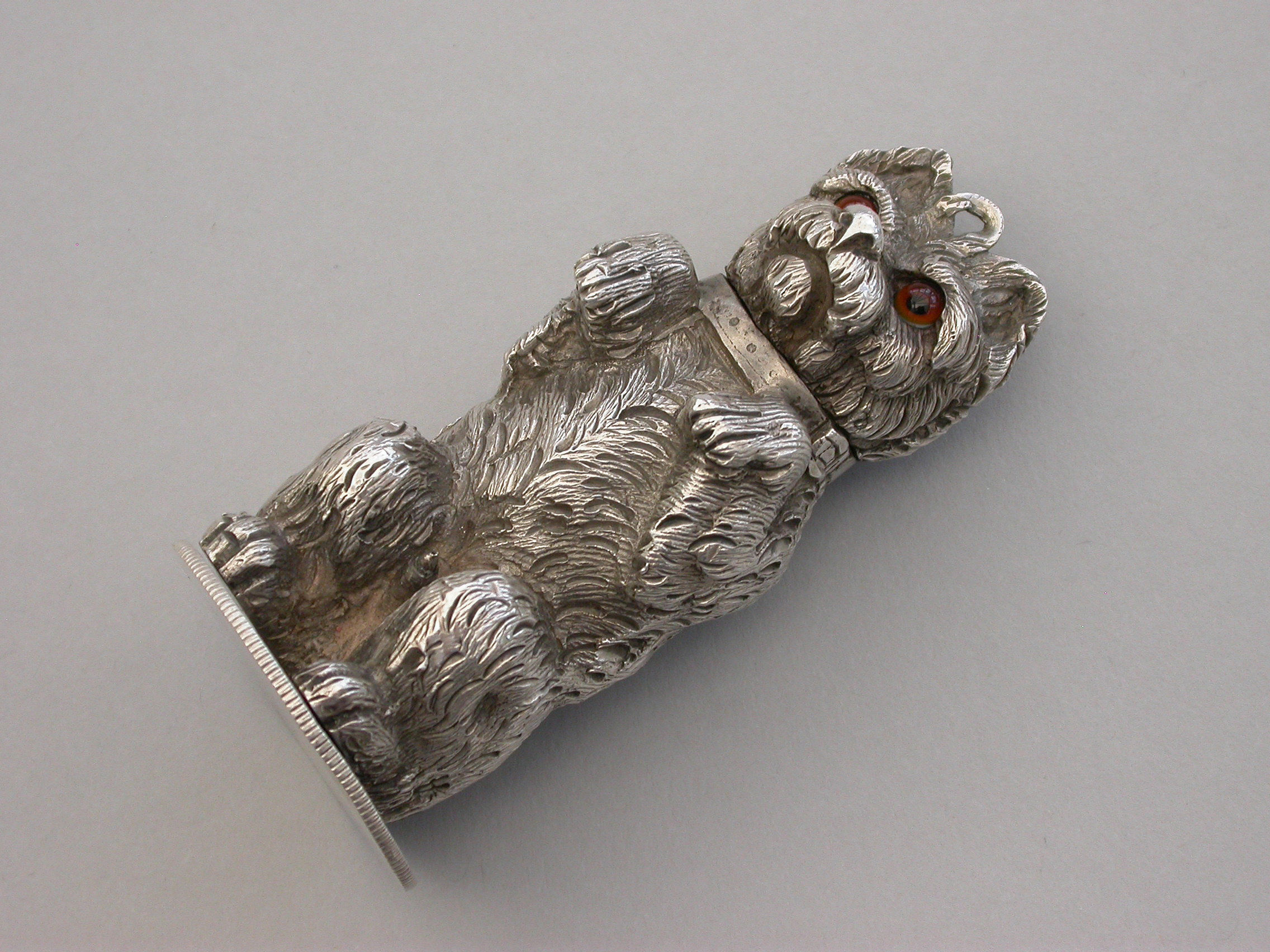 An extremely rare Victorian cast silver novelty Scent Atomiser made in the form of an excited terrier, sitting up on his haunches in an appealing begging pose, with coloured glass eyes, a circular screw-off base and a button at the back of his head which, when depressed repeatedly, sprays scent, most imaginatively through the act of micturation (or peeing).
