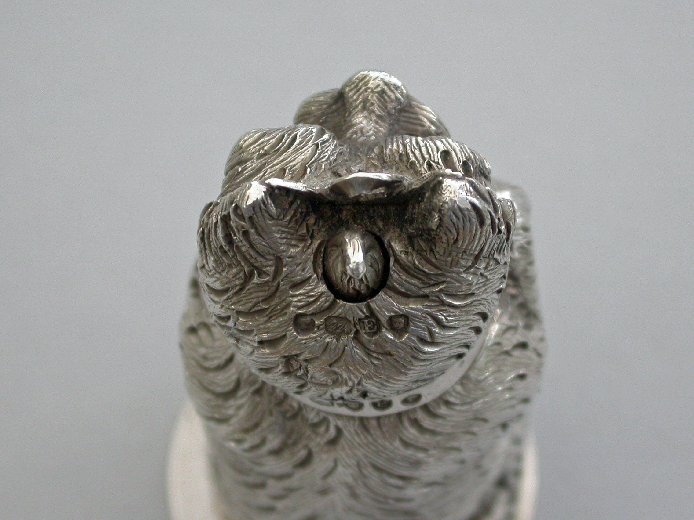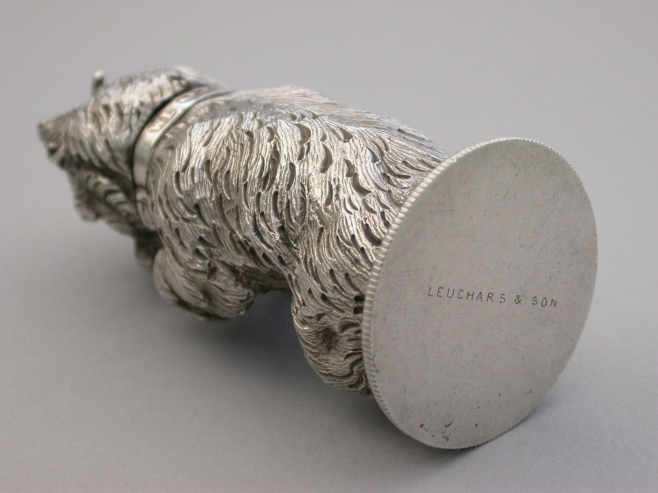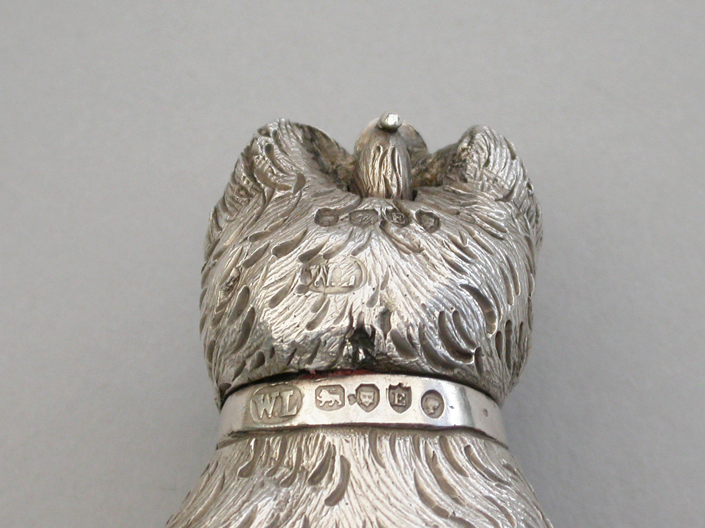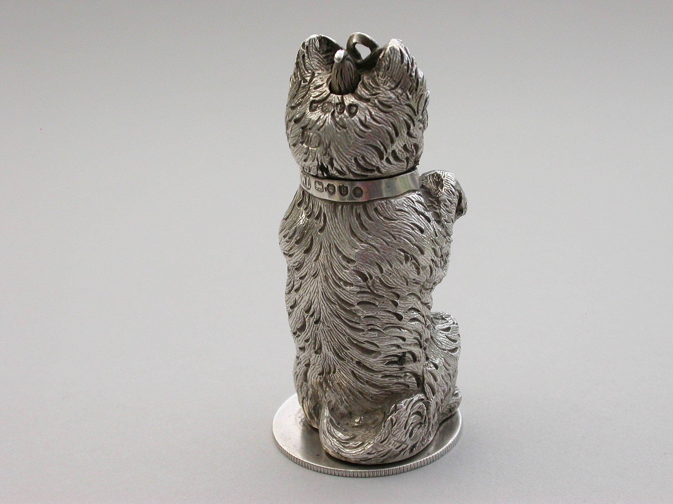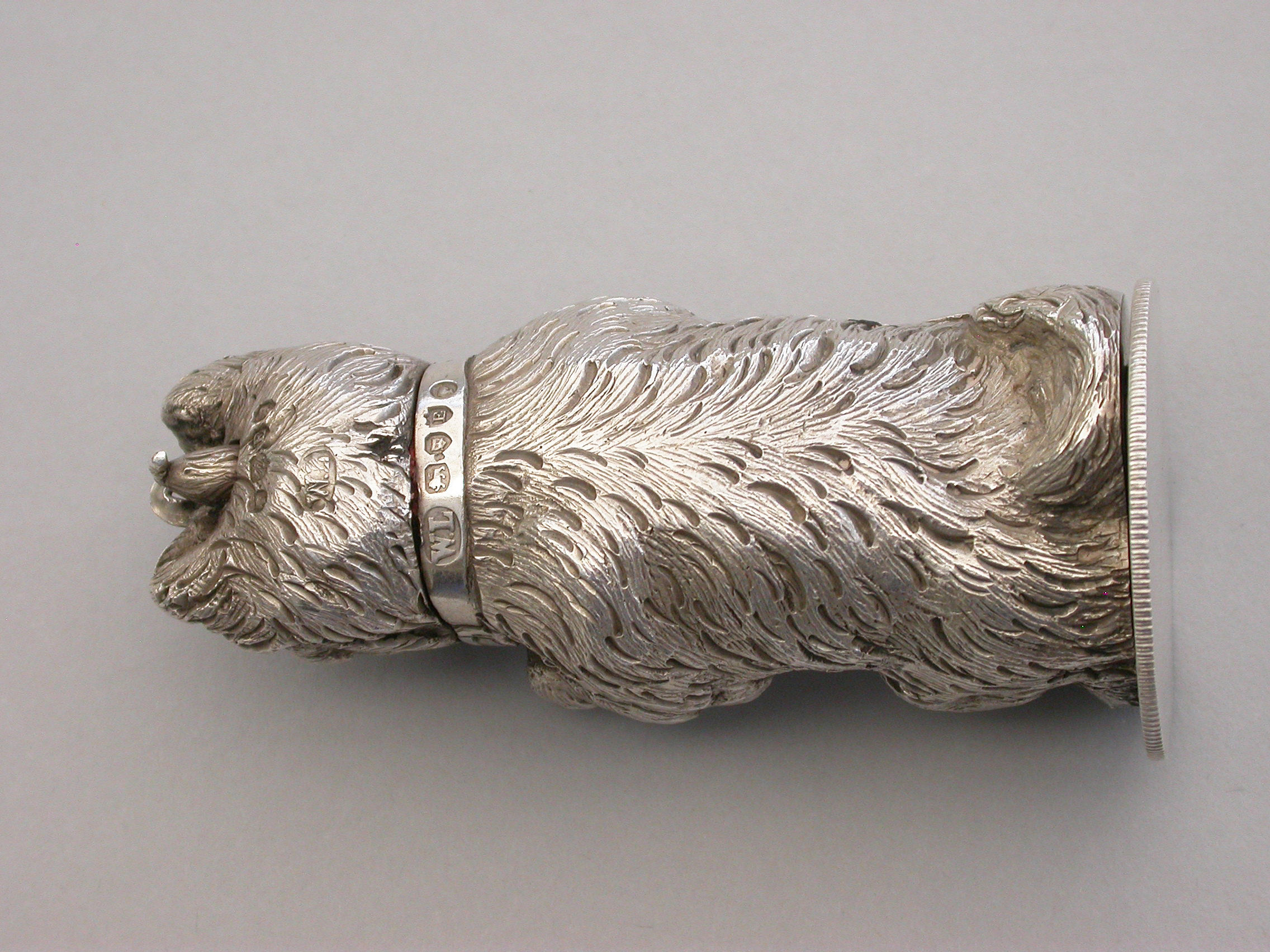 An extremely rare Victorian cast silver novelty Scent Atomiser made in the form of an excited terrier, sitting up on his haunches in an appealing begging pose, with coloured glass eyes, a circular screw-off base and a button at the back of his head which, when depressed repeatedly, sprays scent, most imaginatively through the act of micturation (or peeing).