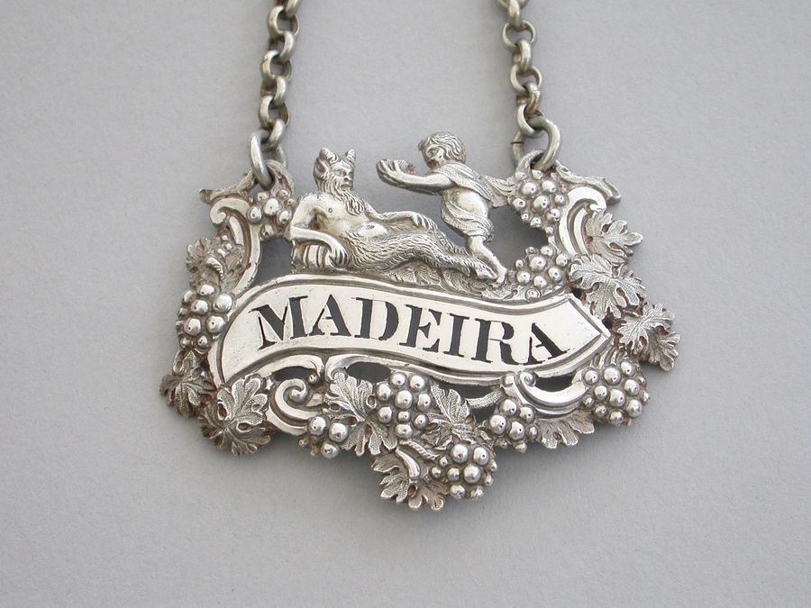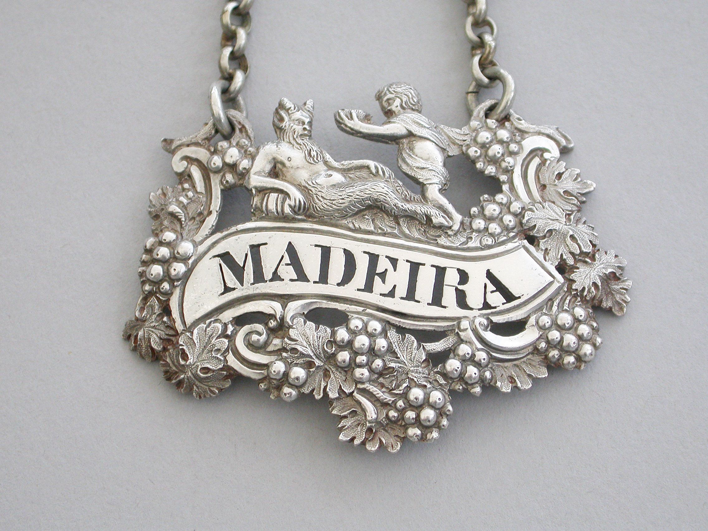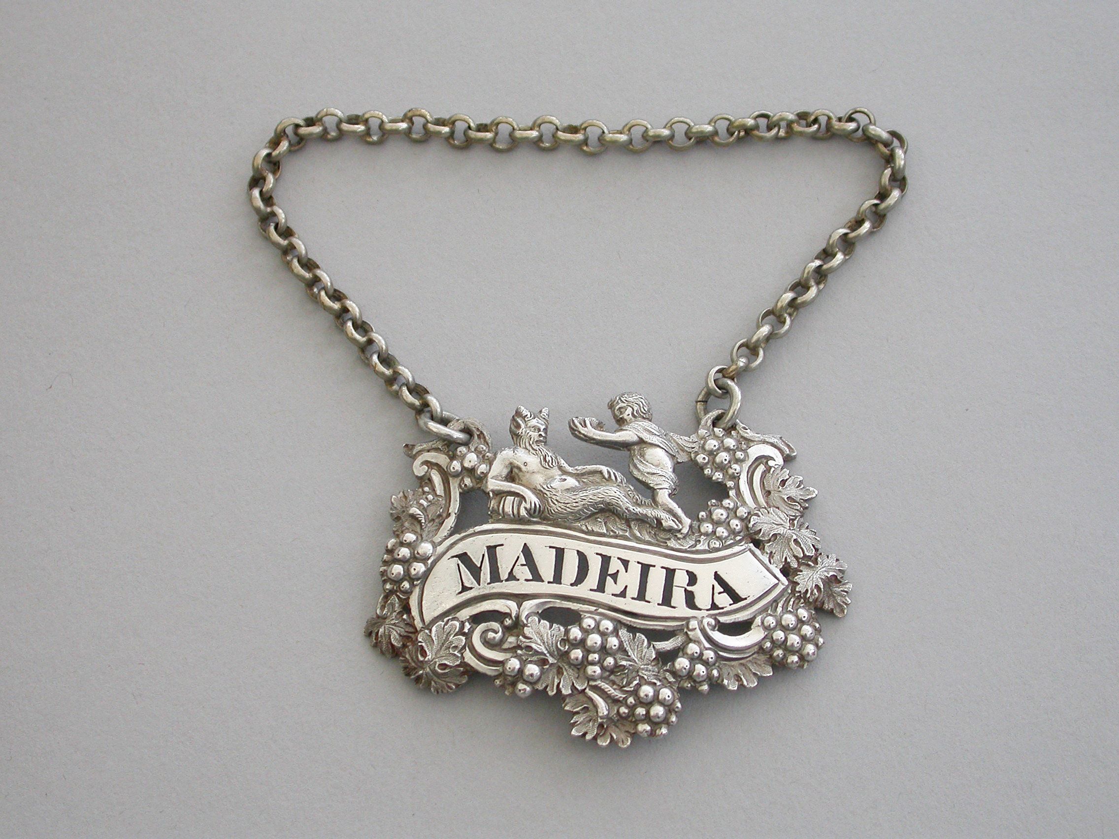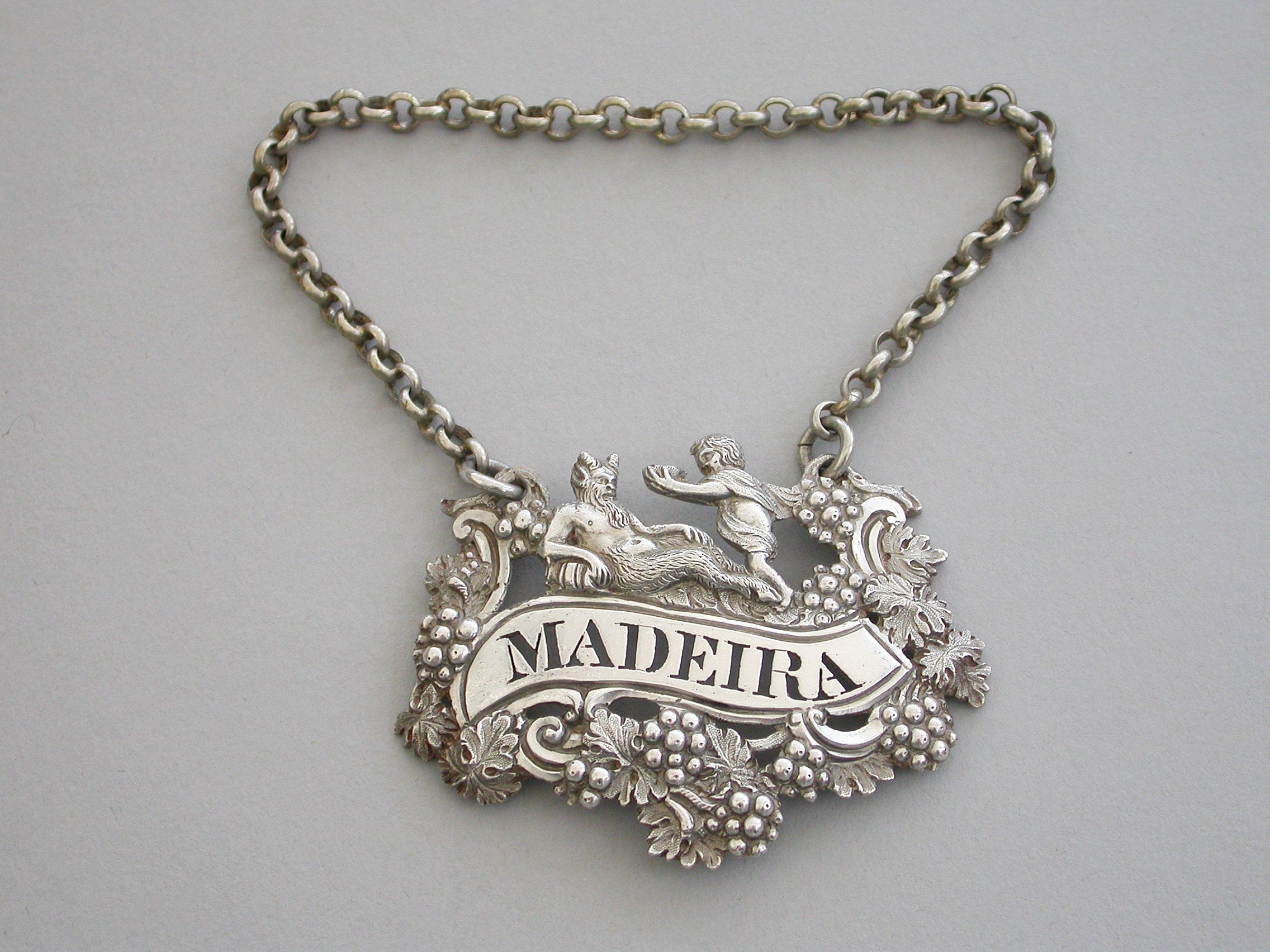 A fine quality early Victorian heavy cast and pierced silver Wine Label depicting a reclining Dionysus being offered a cup of wine by a cloaked putto, a fruiting vine border surrounding the scrolled name plate incised for Madeira.
