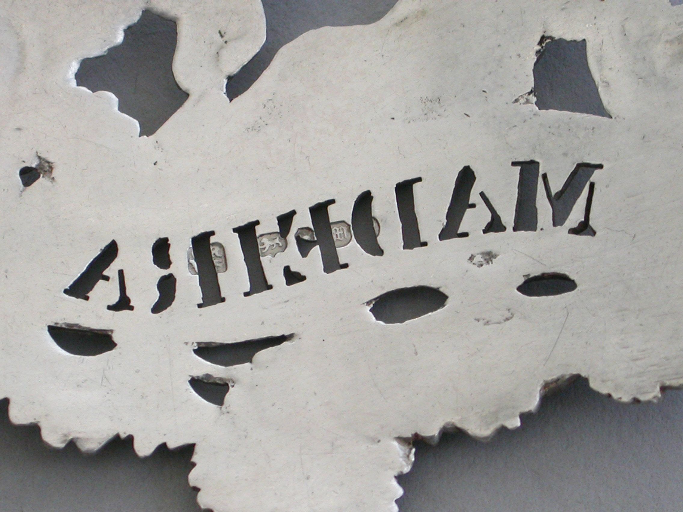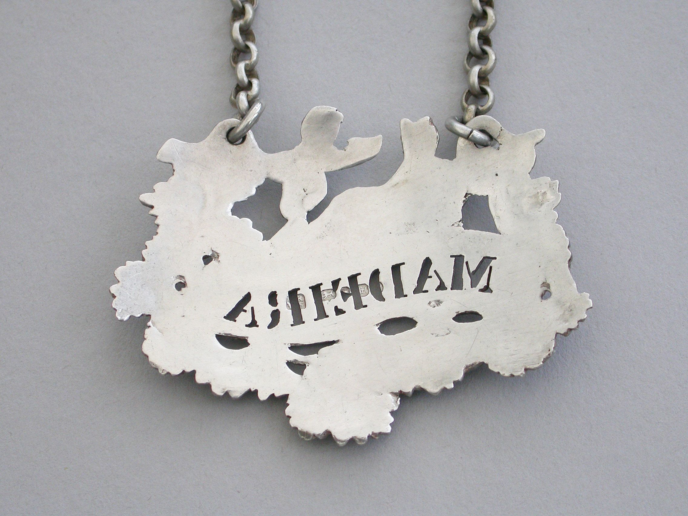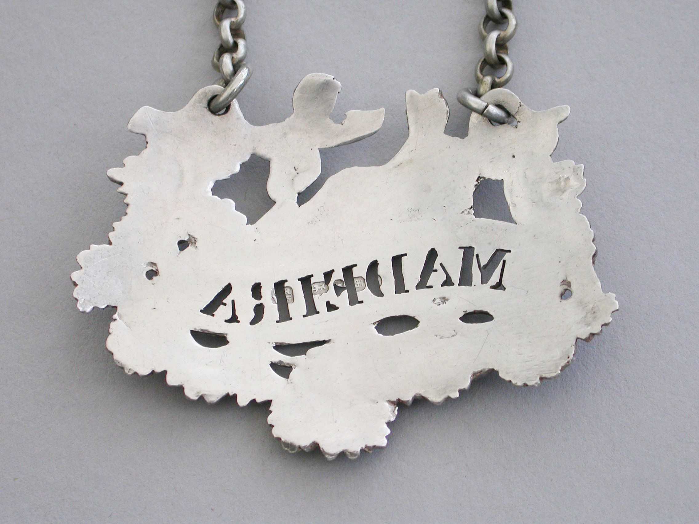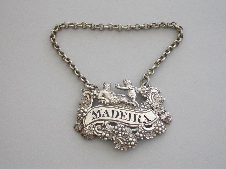 A fine quality early Victorian heavy cast and pierced silver Wine Label depicting a reclining Dionysus being offered a cup of wine by a cloaked putto, a fruiting vine border surrounding the scrolled name plate incised for Madeira.