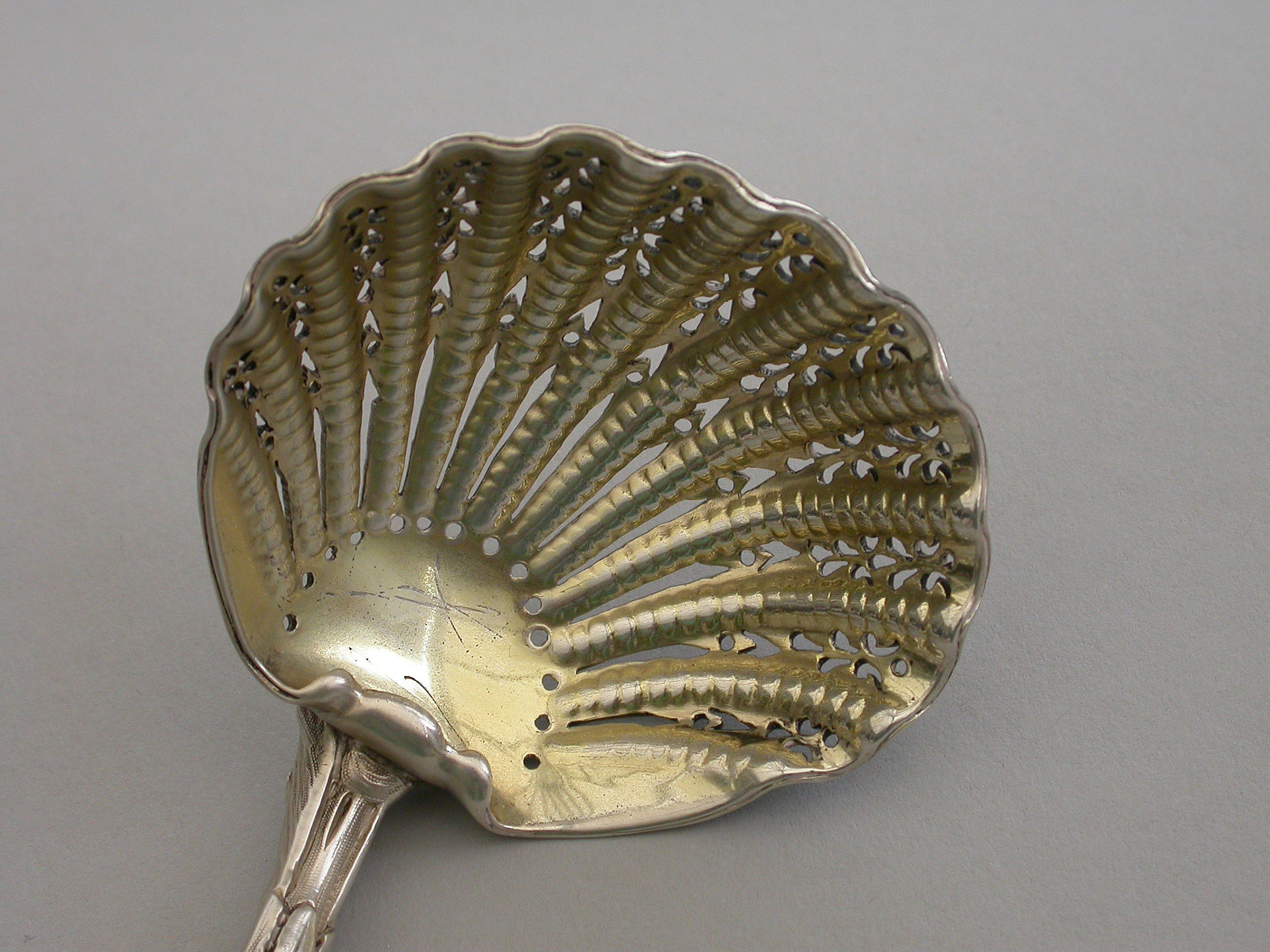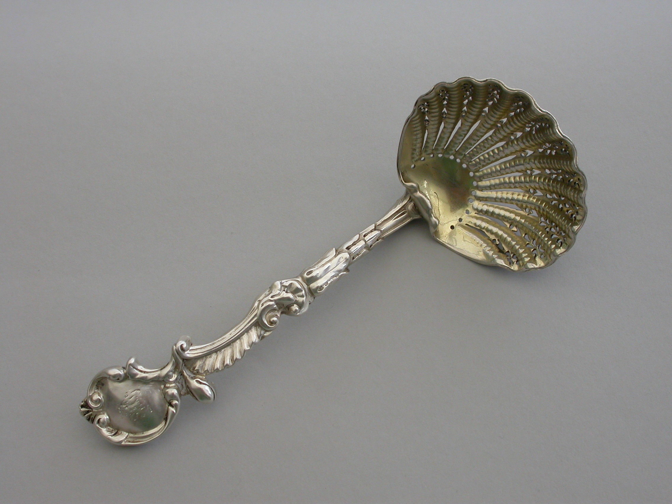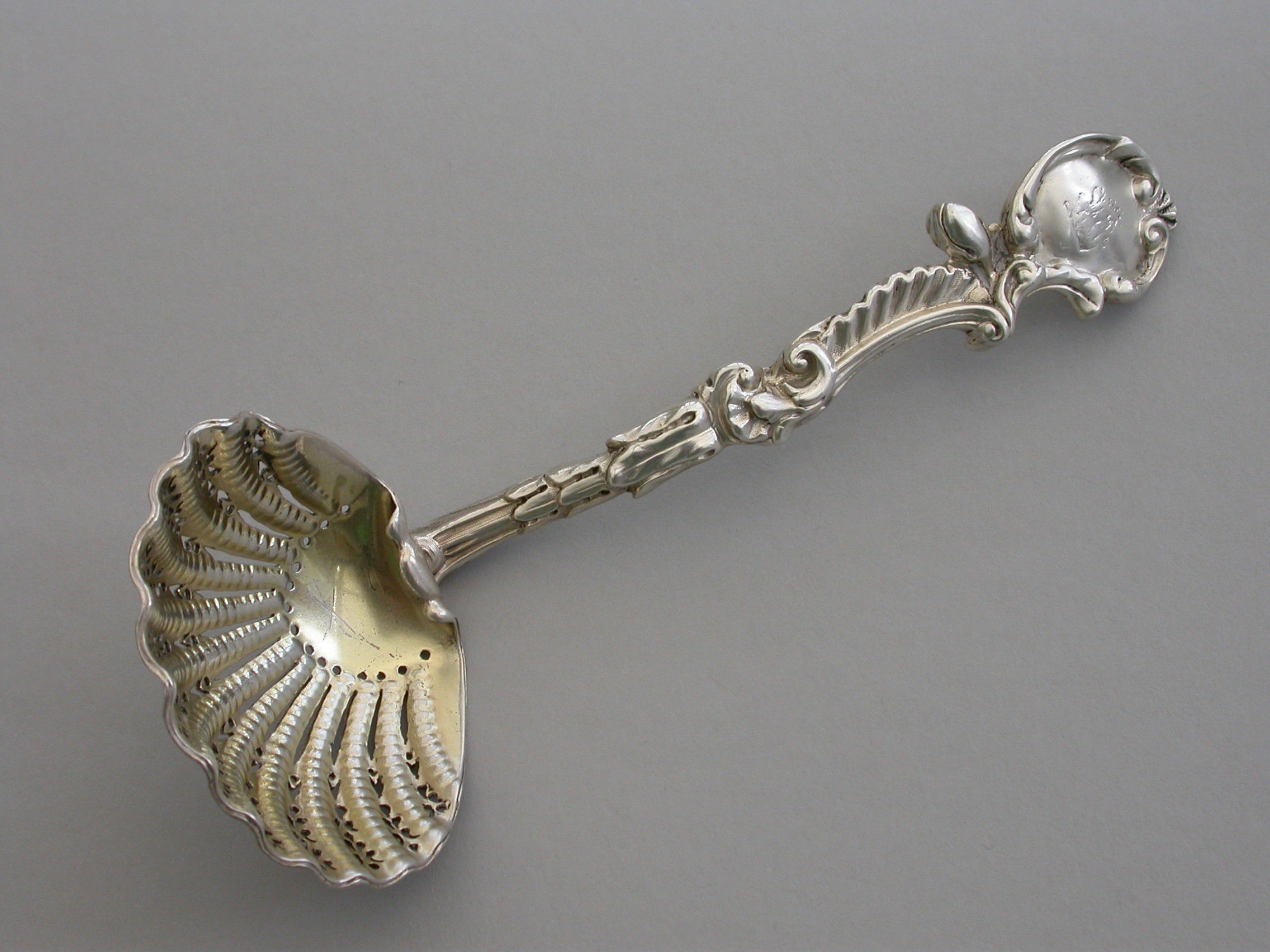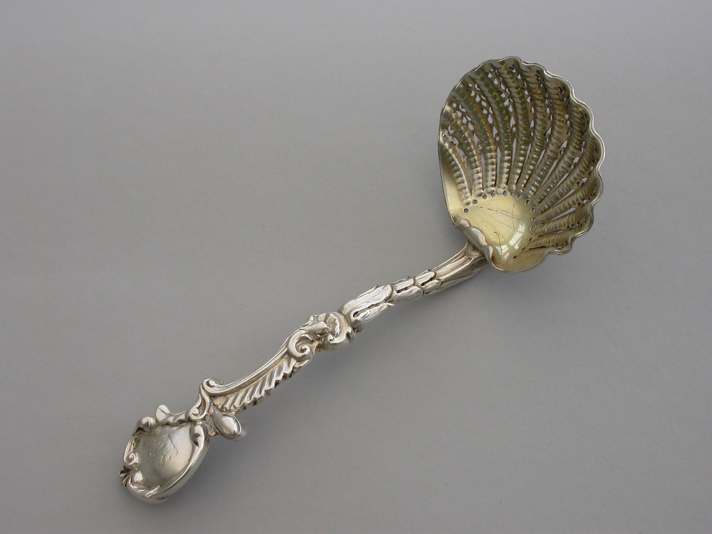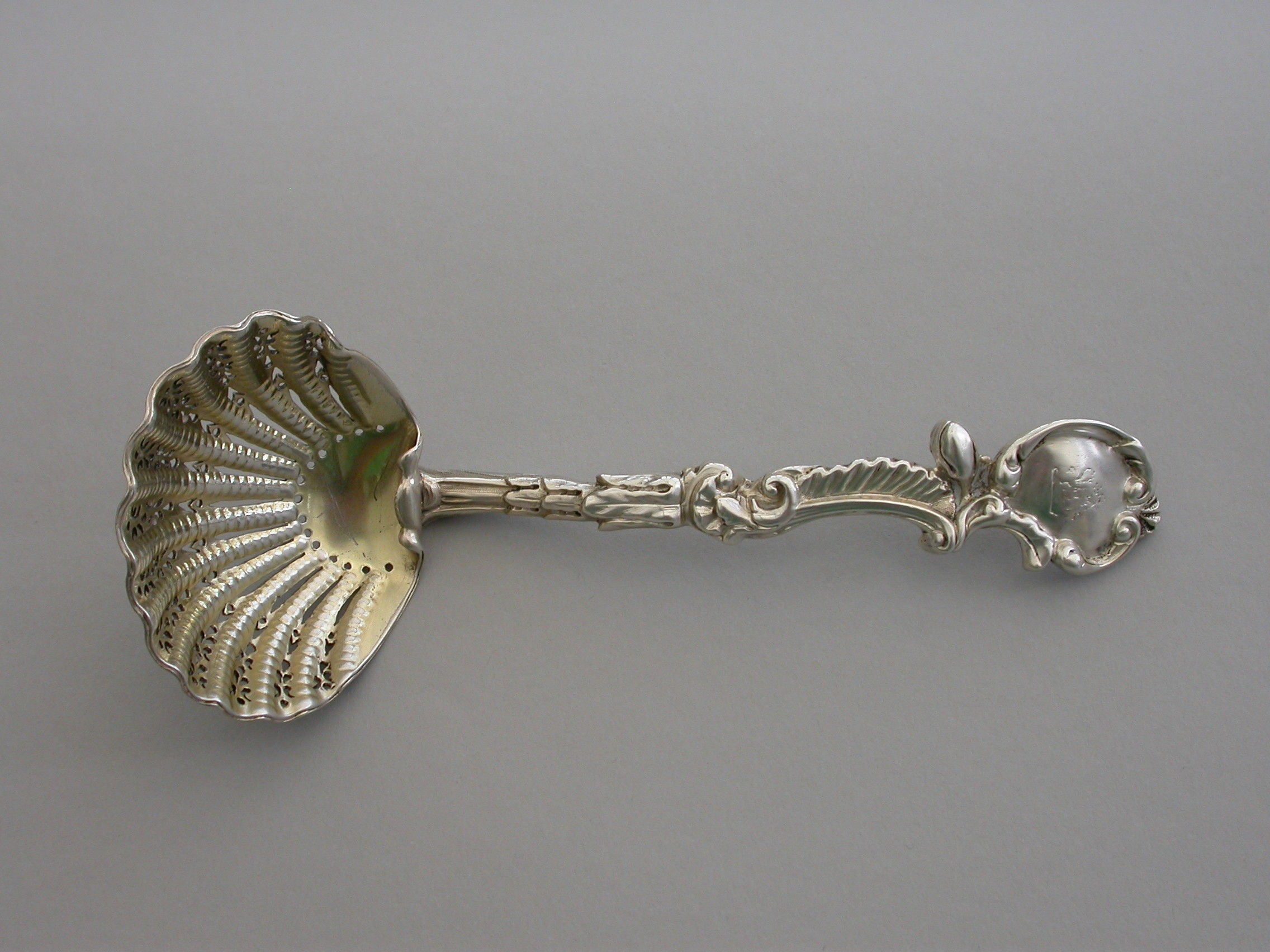 A good quality cast silver Sugar Sifter Ladle with Rococo scroll pattern handle, the pierced gilded scallop shaped bowl with turned over rim.