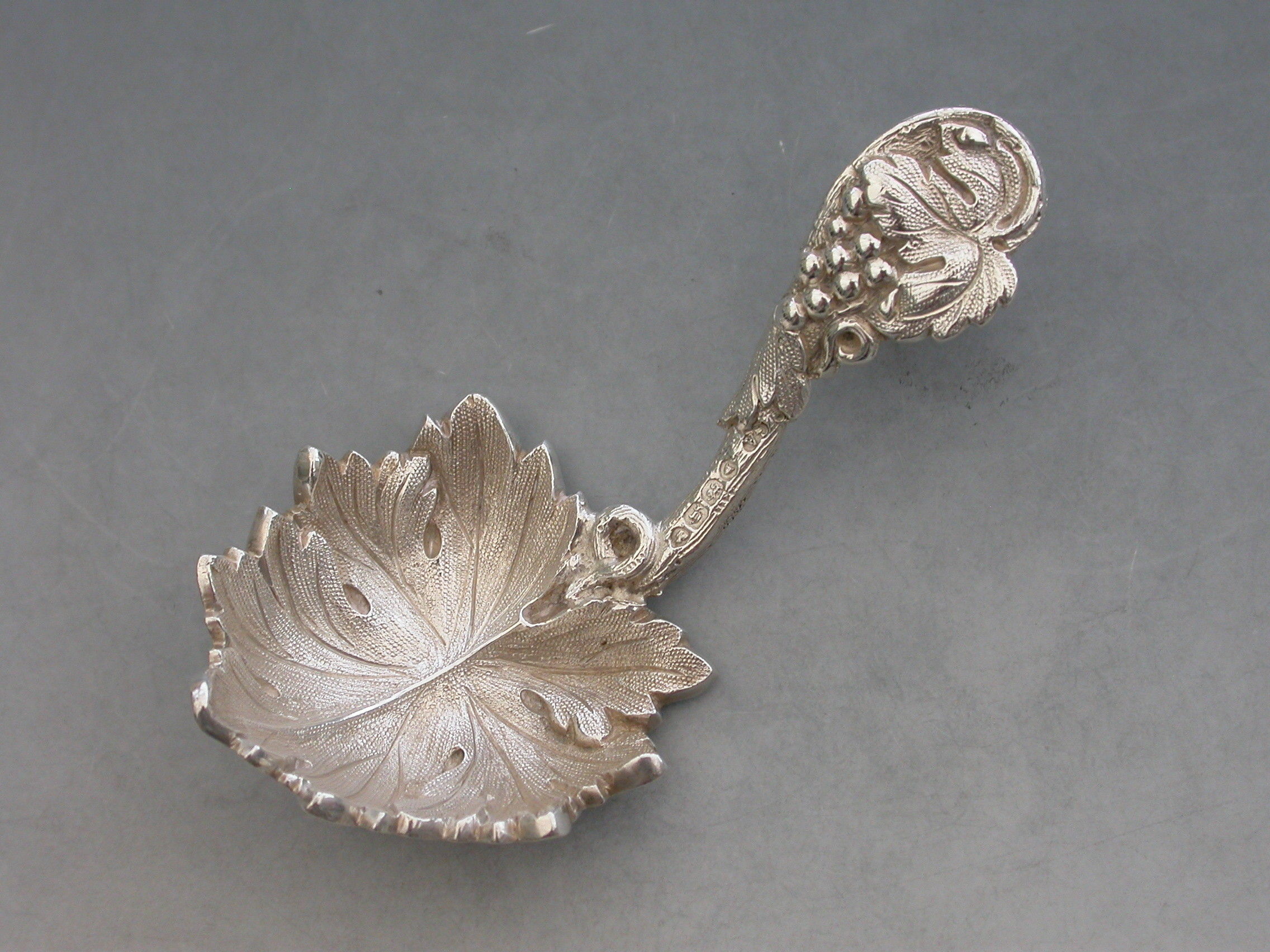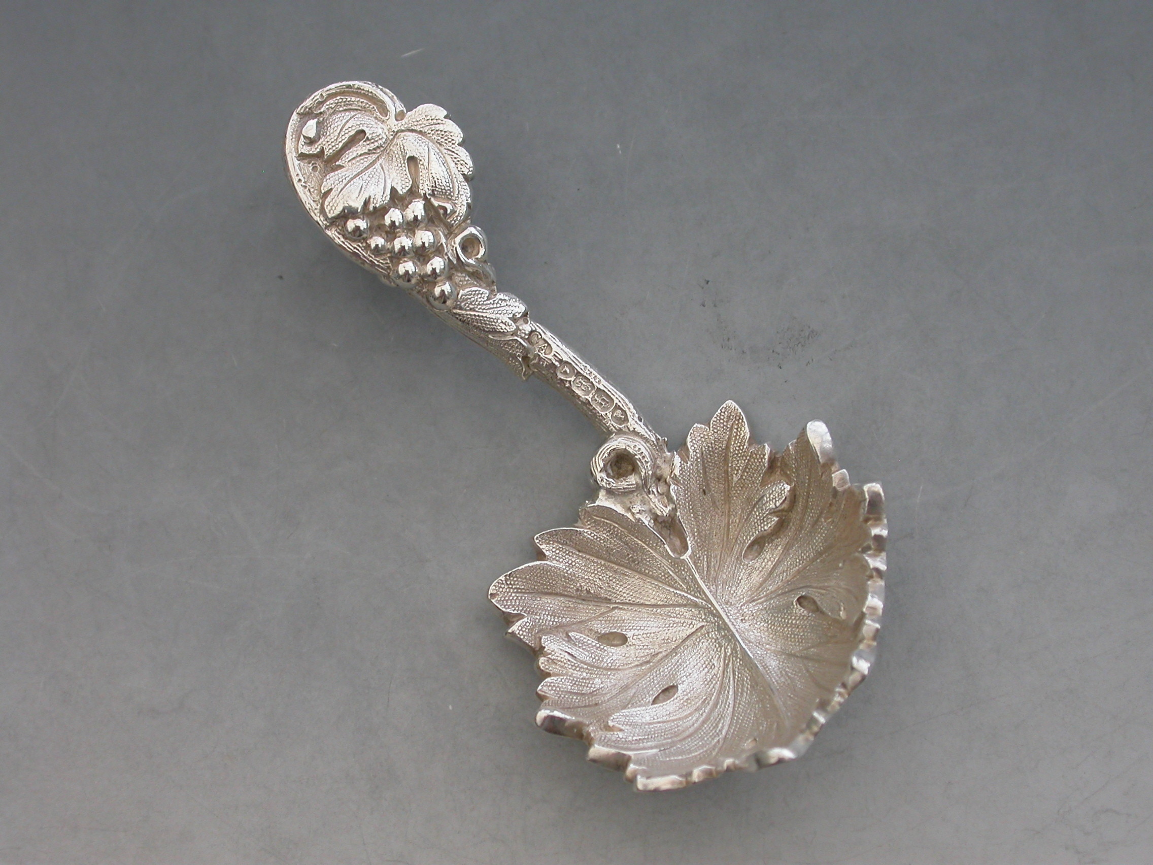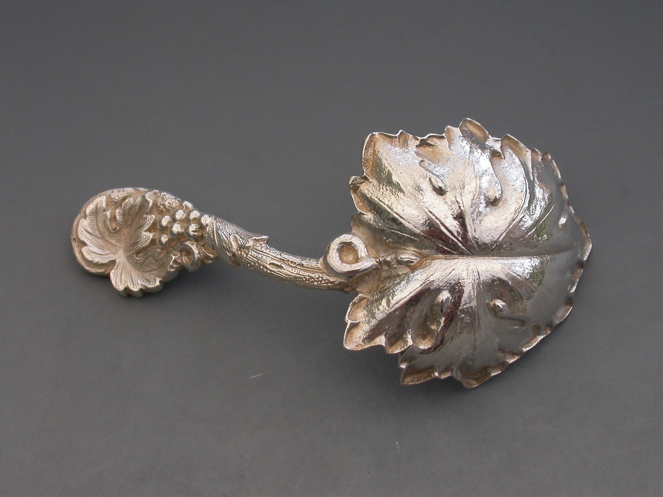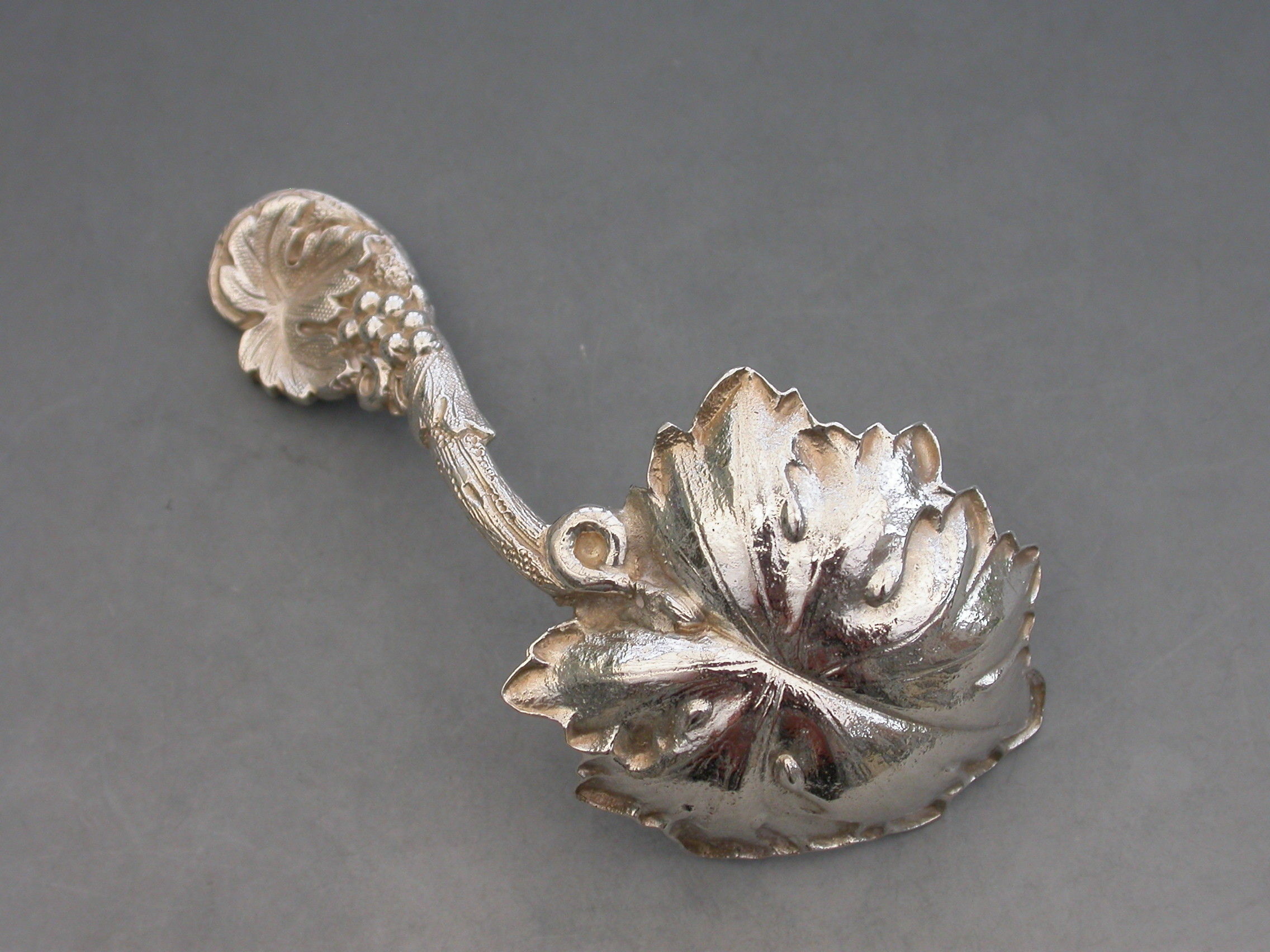 A fine quality Victorian cast silver Caddy Spoon, the bowl formed as a concave vine leaf, the handle as a vine tendrill with leaves and a bunch of grapes.