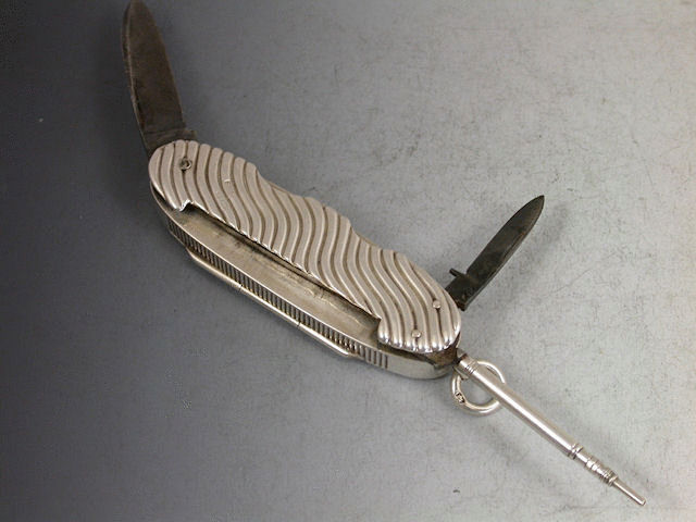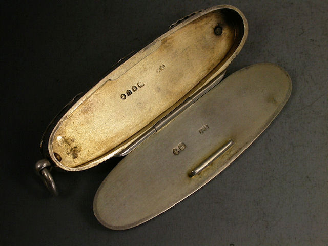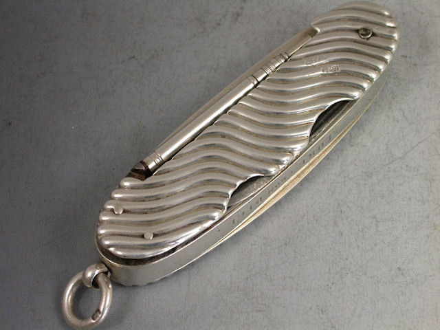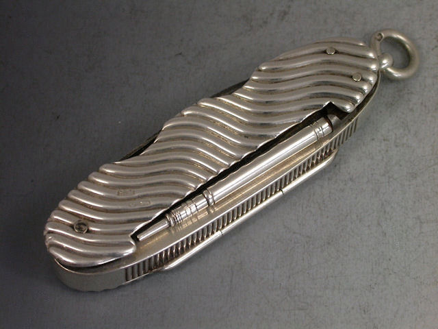 A rare Victorian silver combined Vesta Case / Pencil / Pen Knife / Quill Knife, with two steel blades and chased wave effect side panels, the hinged lid opening to reveal silver gilt interior, attached suspension ring. Engraved inscription – ‘Luke From Bill’ to one side and striker to the other.