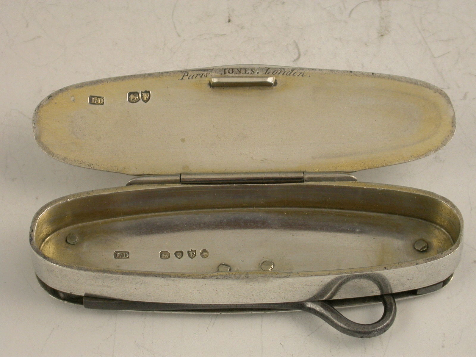 A good quality Victorian silver Vesta Case combined with integral steel button hook and pen knife, the lid engraved with contemporary initials, silver gilt interior, engraved with retailers mark of Jones, London and Paris.