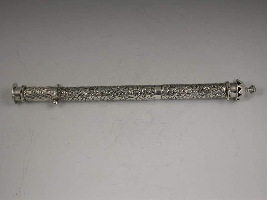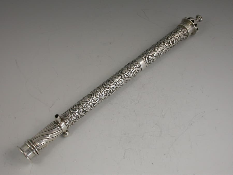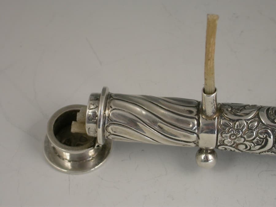 A rare Victorian combination item of tubular form with repousse foliate scroll decoration, one end with hinged lid with crown finial for sealing wax, the other with hinged lid formed as a seal containing wax tapersticks, one of which can be inserted in the upright tube for a go-to-bed.