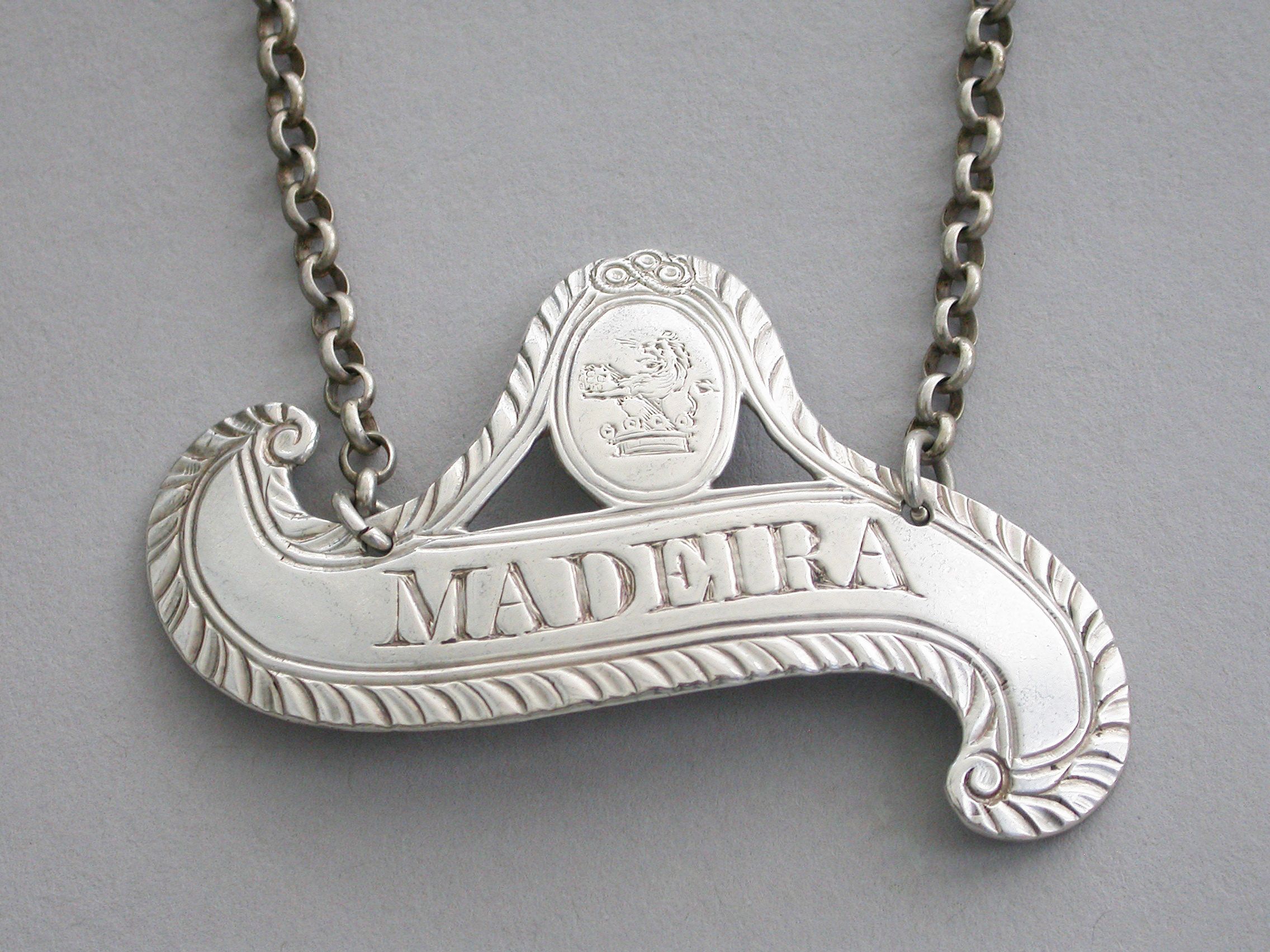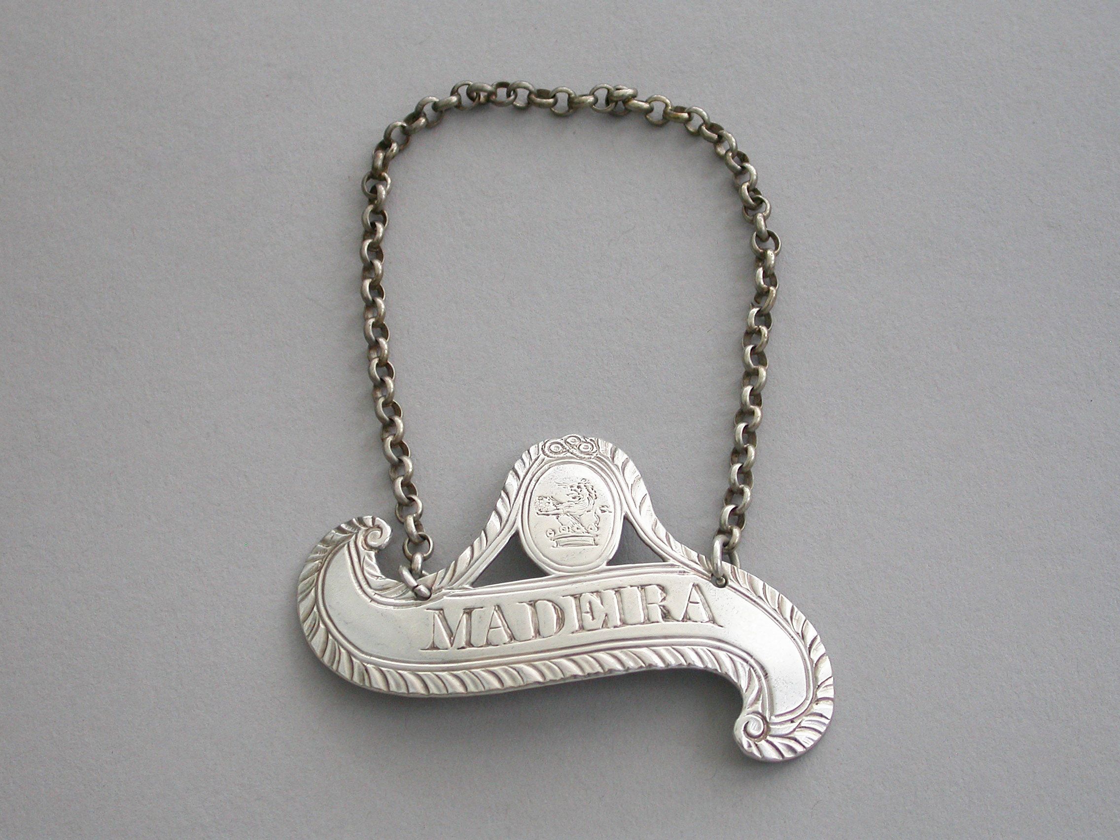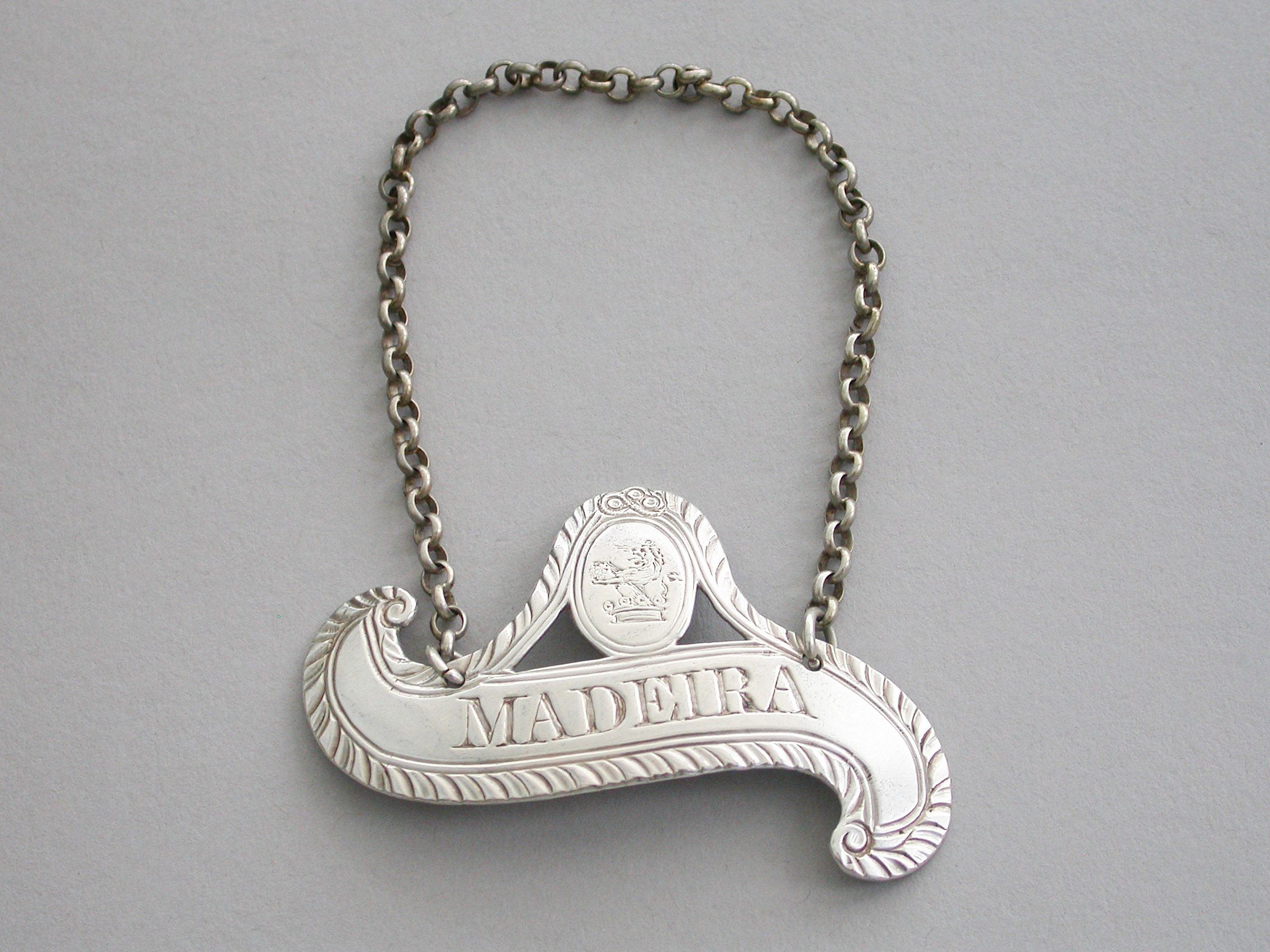 Victorian Crested Silver Reversed Scroll Shaped Wine Label 'Madeira' Baron Dinobren