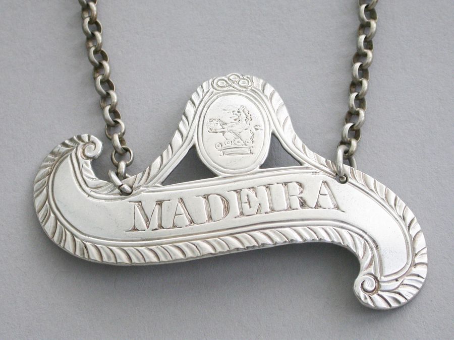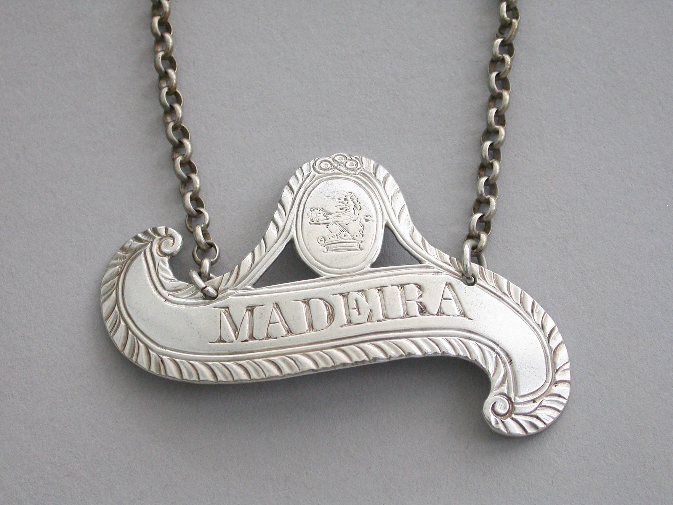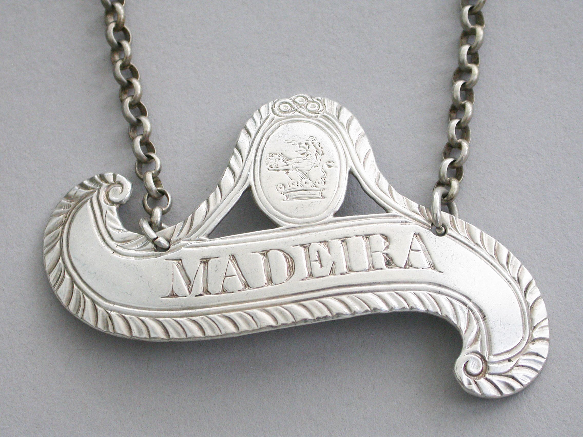 Victorian Crested Silver Reversed Scroll Shaped Wine Label 'Madeira' Baron Dinobren