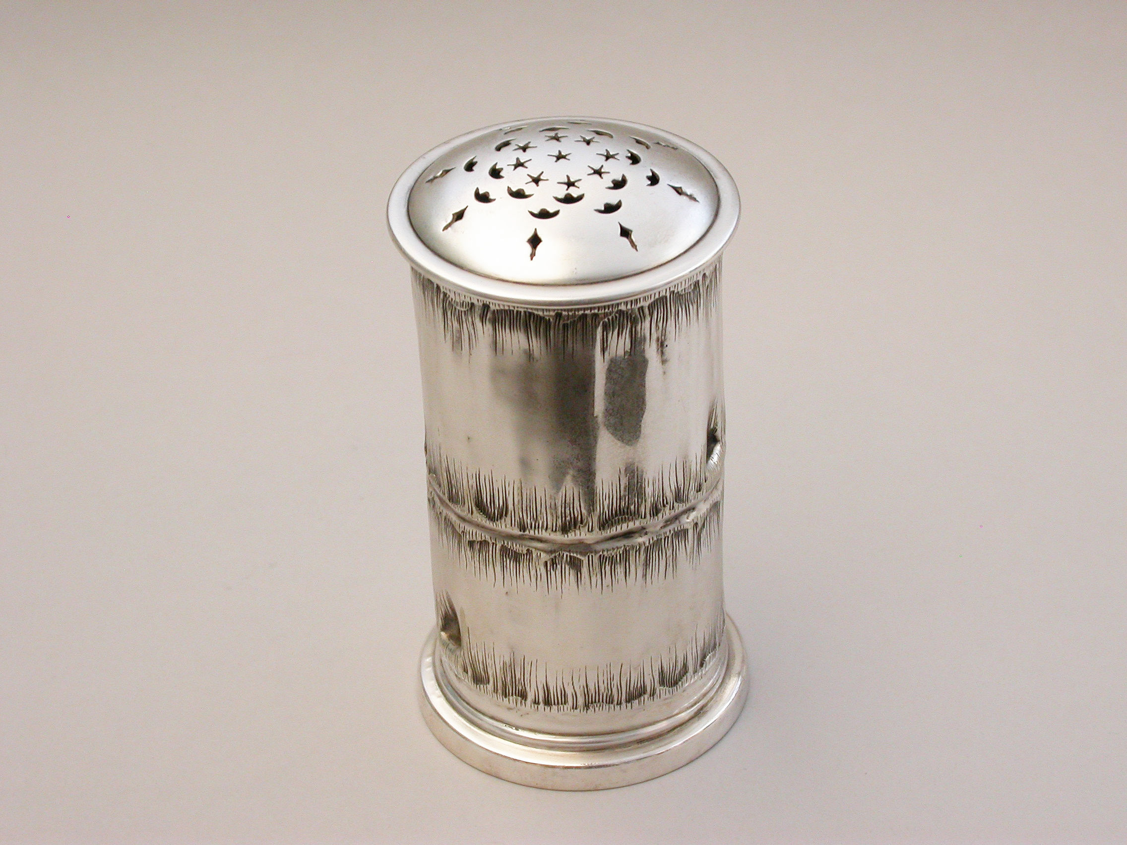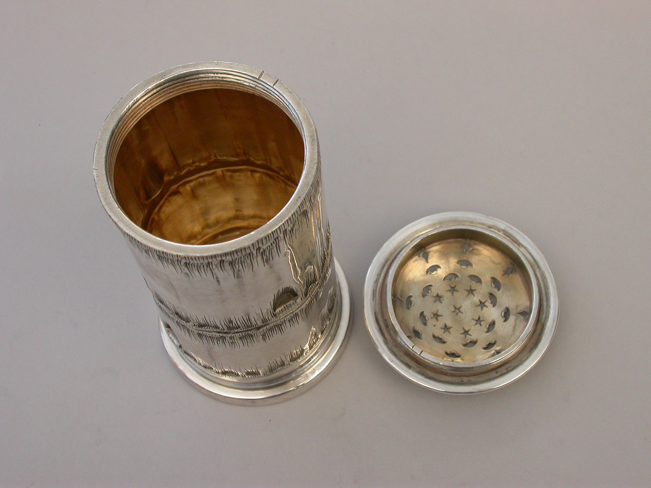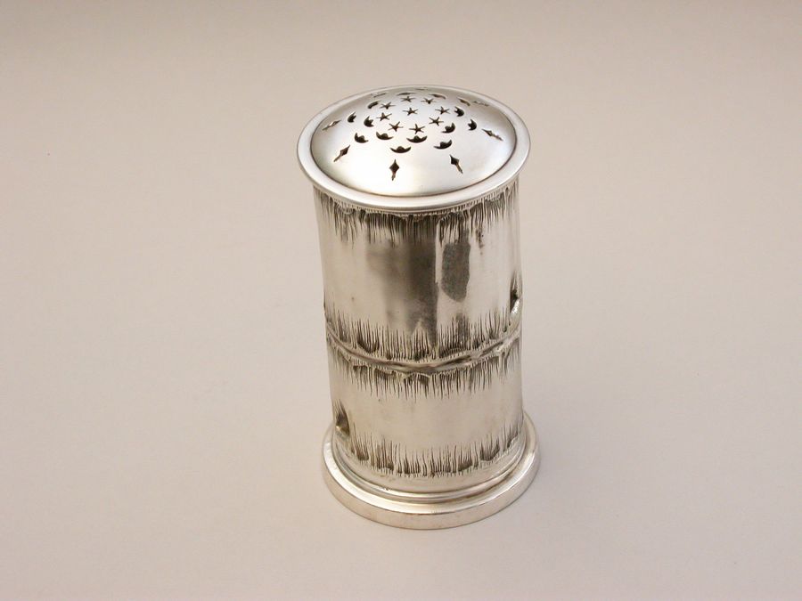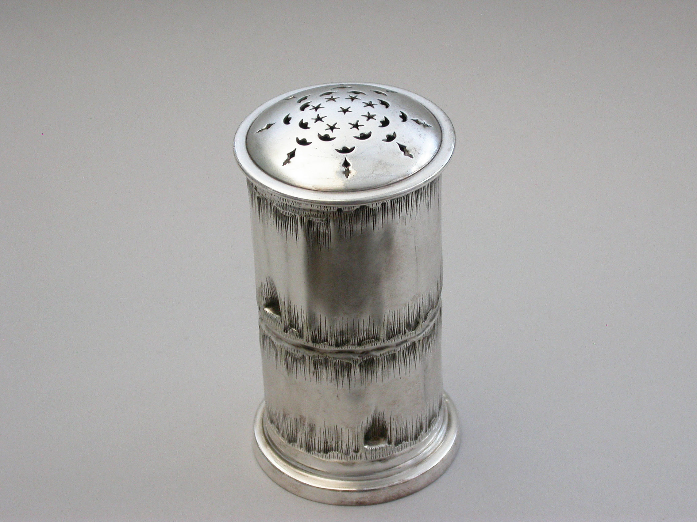 A good quality late Victorian novelty electroplated silver Sugar Caster made in the form of a a piece of sugar cane. Screw-off lid and gilded interior.